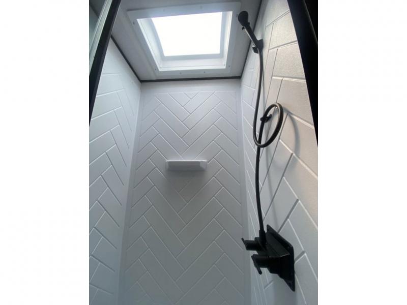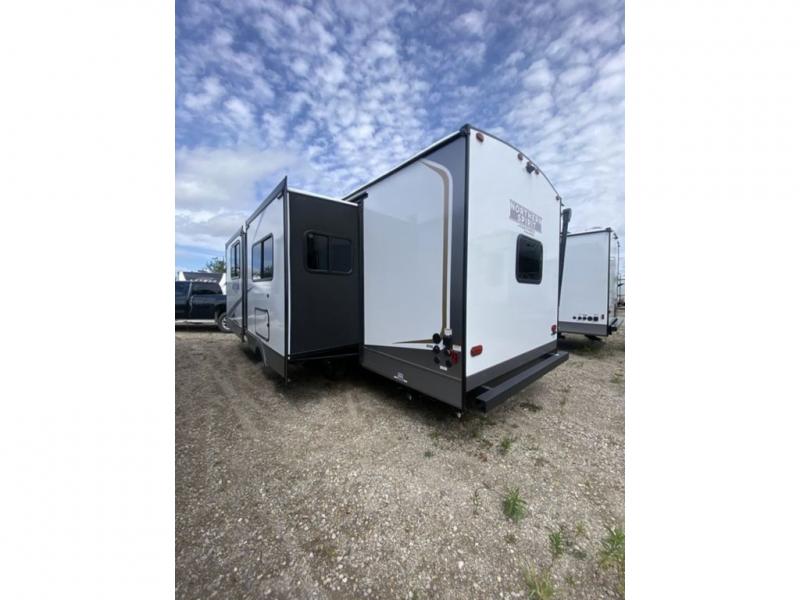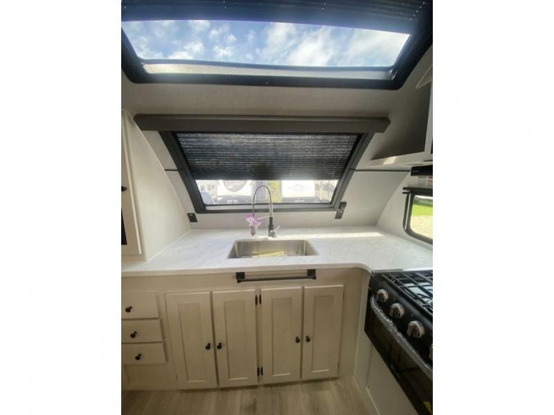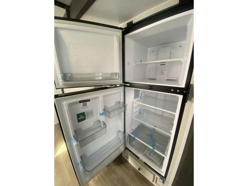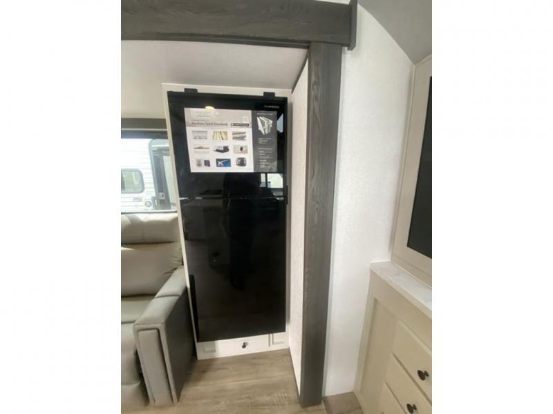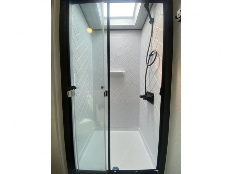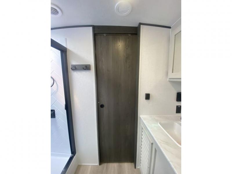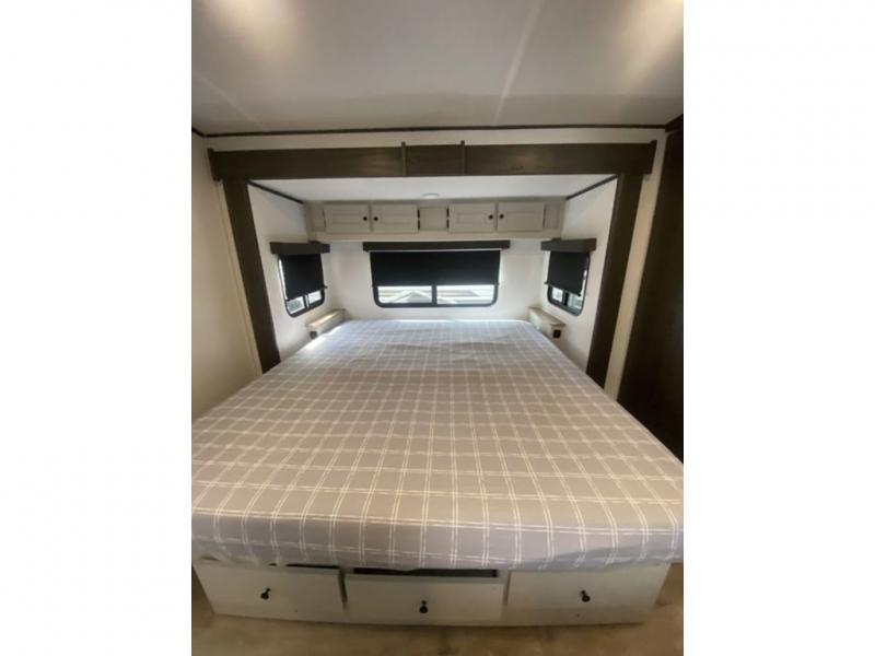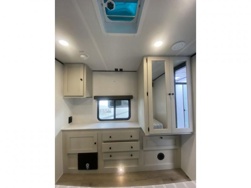 A rear bath with dual sink vanity, a king bed slide with drawers beneath for plenty of storage, and a front kitchen with breakfast bar and pantry as you enter all make this a great unit. You will enjoy plenty of space with a large slide in the bedroom and combined living area and kitchen. Theater seats are perfect for winding down your day inside, and a slide out king bed is a great way to enjoy a great night's rest. There is even washer and dryer prep in the bedroom if you choose to add those appliances! In the very rear of the unit, a spacious bath with large shower, a linen cabinet and dual sink vanity so both can get ready at once. In the front kitchen you will find all the amenities to enjoy creating meals and snacks as you travel. There are two pantries with one just inside the door to your left, and one along the front wall near the refrigerator and theater seating slide.