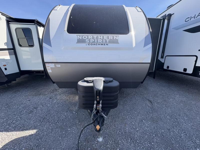 With any Northern Spirit Ultra Lite travel trailer by Coachmen, the "Twice Cool" dual ducted air conditioning system, motion activated floor lights, and the motion activated pass-through storage light plus fishing pole storage, will make your camping experience simplified. The heated and enclosed underbelly provides protection on the road, the 200W solar panel with 30 amp controller provides off-grid camping, and the power tongue jack makes setup easier. Each is built with a front cap with LED strip lights, a laminated, aluminum framed floor, rear wall, and sidewalls, plus a fully walkable roof with seamless Tufflex PVC covering. Make your decision today, and camp with everything in its place!