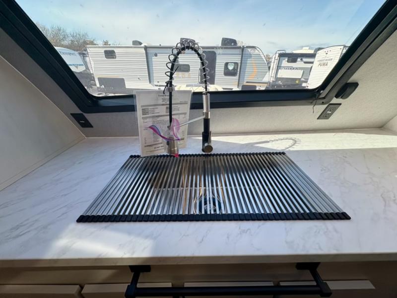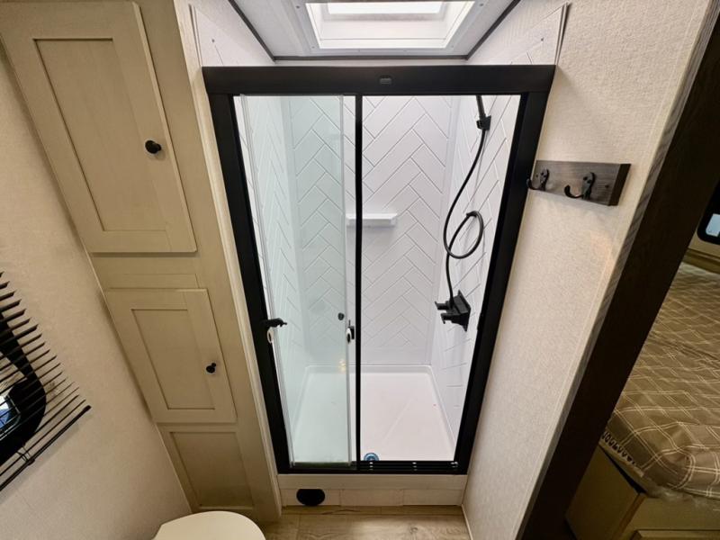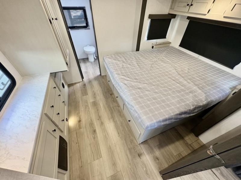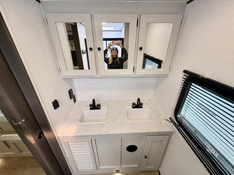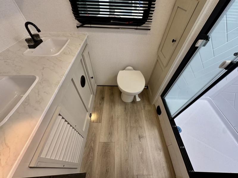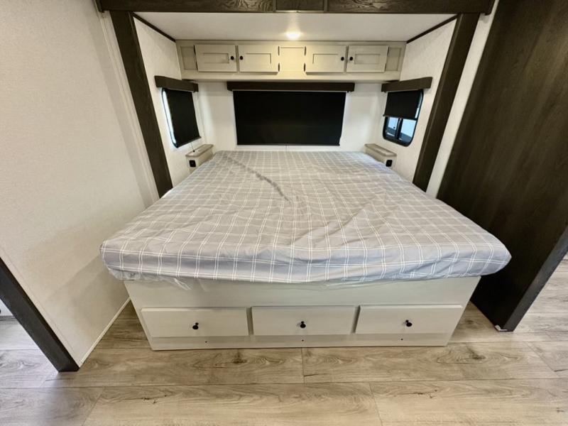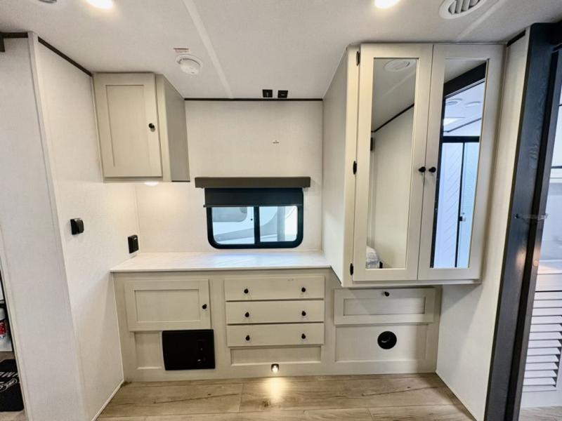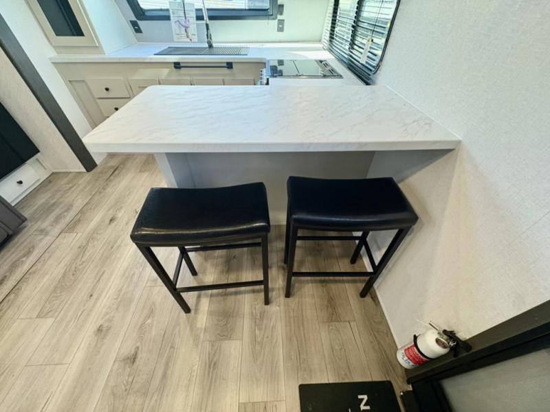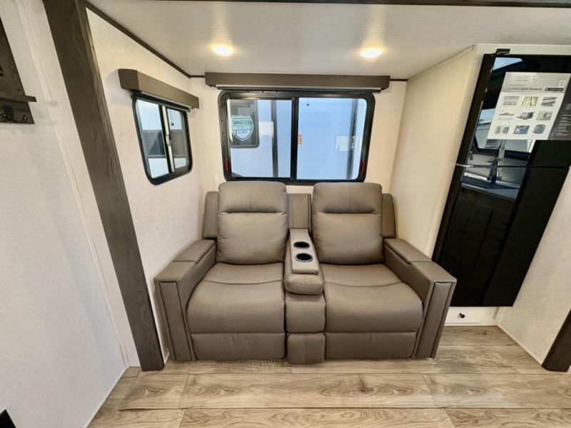 A rear bath with dual sink vanity, a king bed slide with drawers beneath for plenty of storage, and a front kitchen with breakfast bar and pantry as you enter all make this a great unit. You will enjoy plenty of space with a large slide in the bedroom and combined living area and kitchen. Theater seats are perfect for winding down your day inside, and a slide out king bed is a great way to enjoy a great night's rest. There is even washer and dryer prep in the bedroom if you choose to add those appliances! In the very rear of the unit, a spacious bath with large shower, a linen cabinet and dual sink vanity so both can get ready at once. In the front kitchen you will find all the amenities to enjoy creating meals and snacks as you travel. There are two pantries with one just inside the door to your left, and one along the front wall near the refrigerator and theater seating slide.