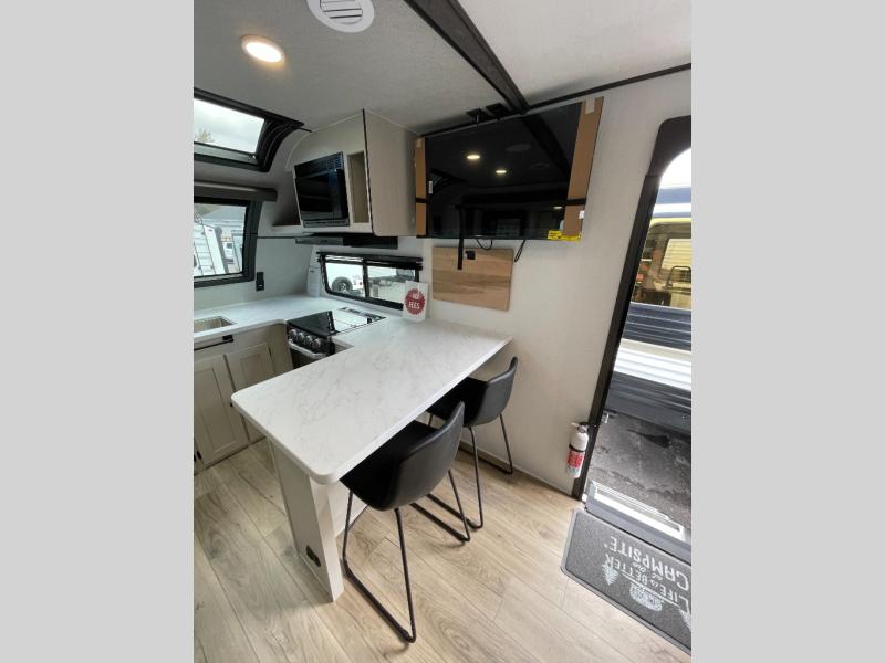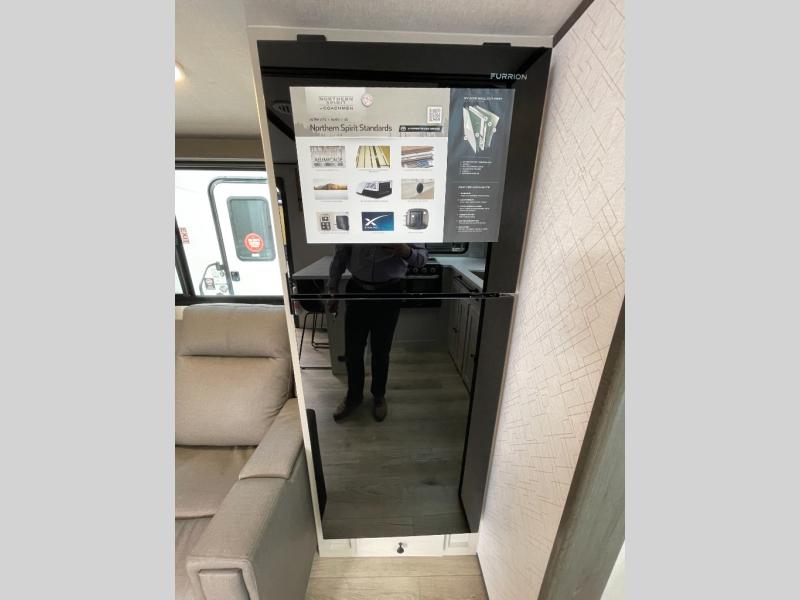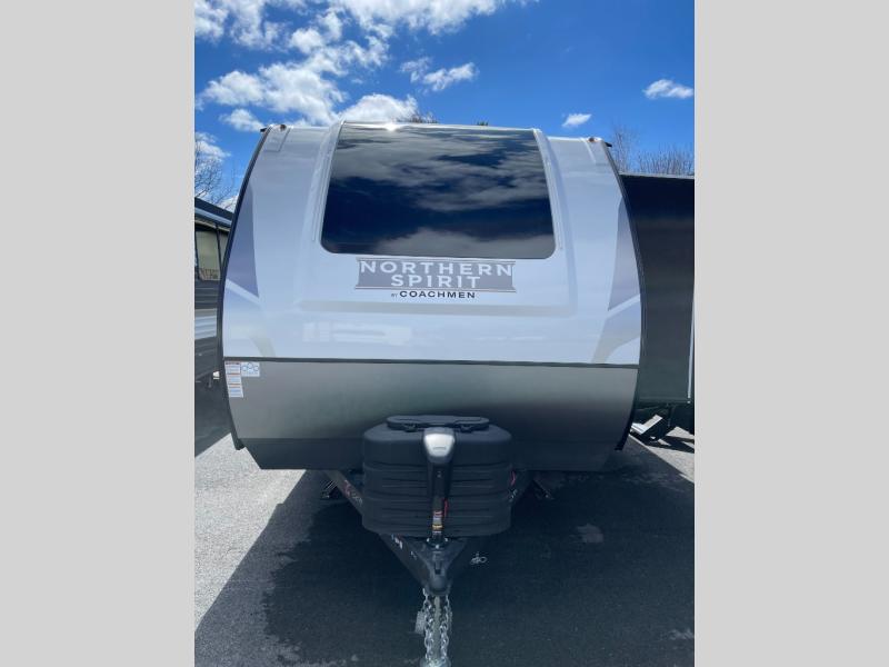 With any Northern Spirit Ultra Lite travel trailer by Coachmen, the "Twice Cool" dual ducted air conditioning system, motion activated floor lights, and the motion activated pass-through storage light plus fishing pole storage, will make your camping experience simplified. The heated and enclosed underbelly provides protection on the road, the 200W solar panel with 30 amp controller provides off-grid camping, and the power tongue jack makes setup easier. Each is built with a front cap with LED strip lights, a laminated, aluminum framed floor, rear wall, and sidewalls, plus a fully walkable roof with seamless Tufflex PVC covering. Make your decision today, and camp with everything in its place!