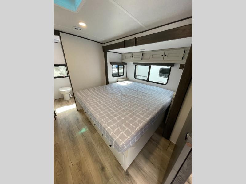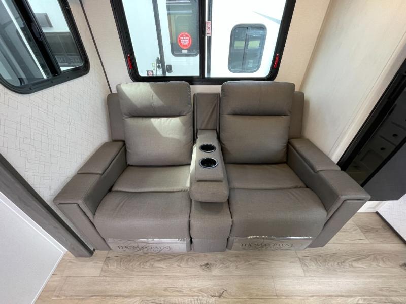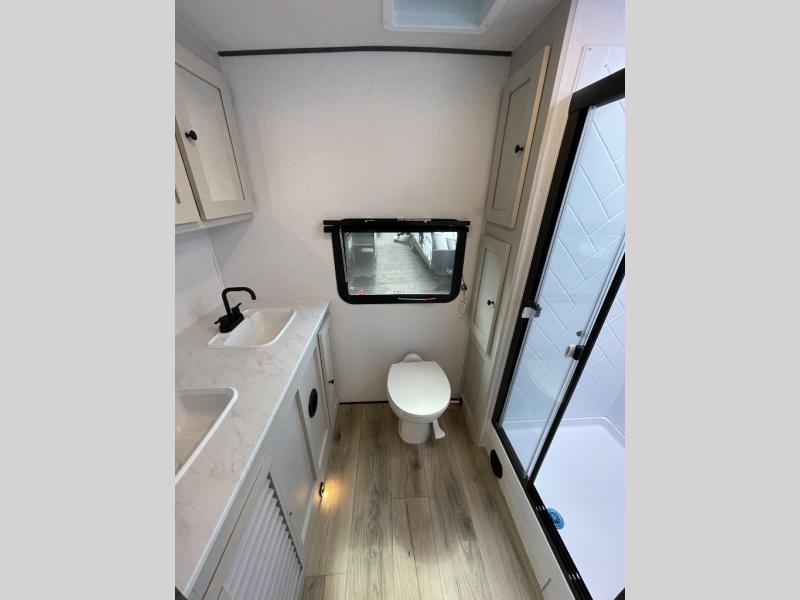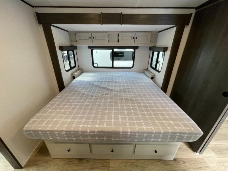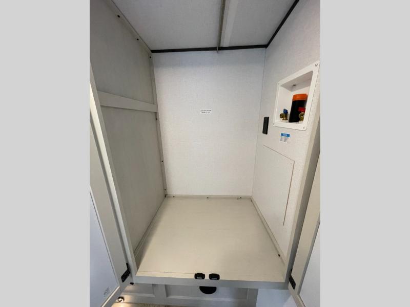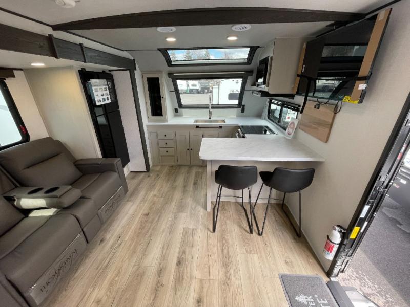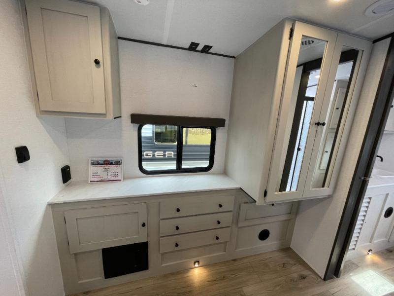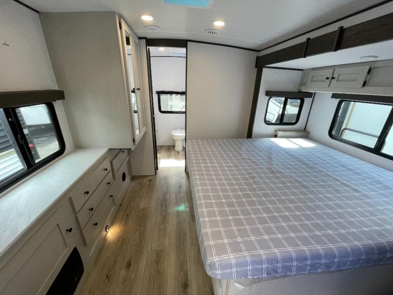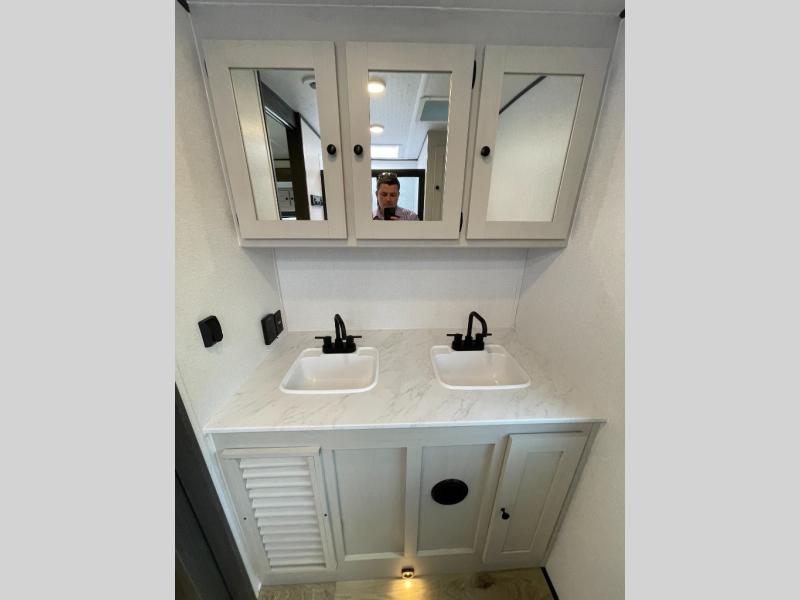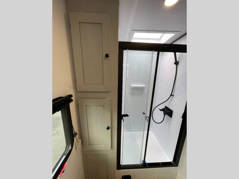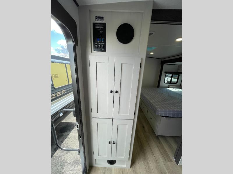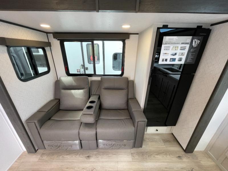 A rear bath with dual sink vanity, a king bed slide with drawers beneath for plenty of storage, and a front kitchen with breakfast bar and pantry as you enter all make this a great unit. You will enjoy plenty of space with a large slide in the bedroom and combined living area and kitchen. Theater seats are perfect for winding down your day inside, and a slide out king bed is a great way to enjoy a great night's rest. There is even washer and dryer prep in the bedroom if you choose to add those appliances! In the very rear of the unit, a spacious bath with large shower, a linen cabinet and dual sink vanity so both can get ready at once. In the front kitchen you will find all the amenities to enjoy creating meals and snacks as you travel. There are two pantries with one just inside the door to your left, and one along the front wall near the refrigerator and theater seating slide.