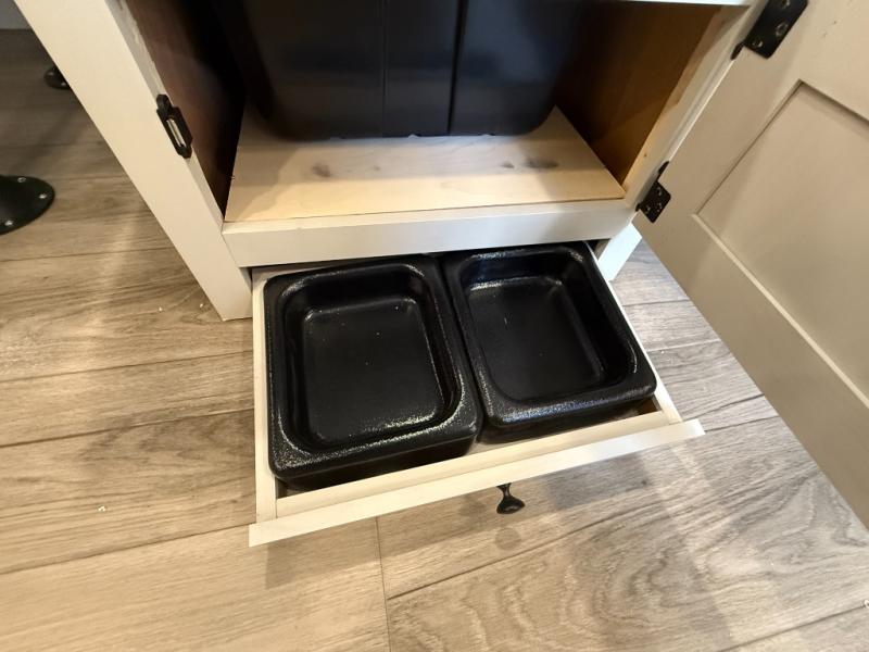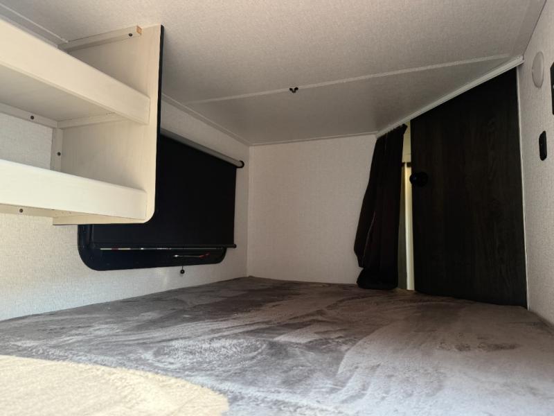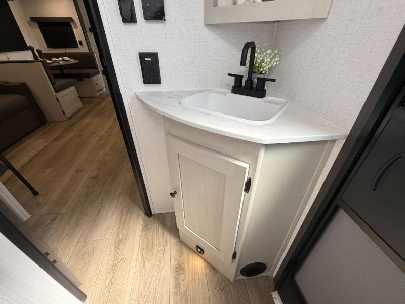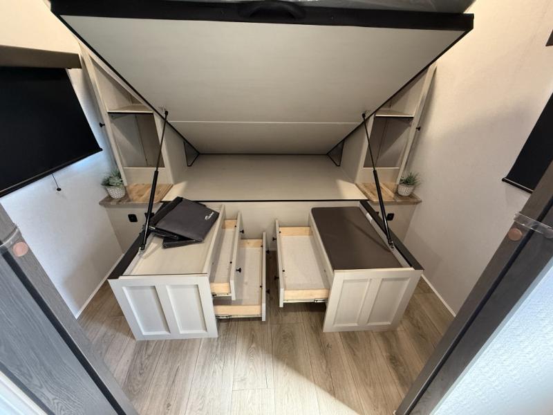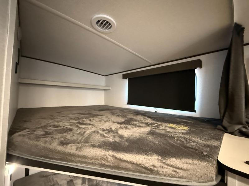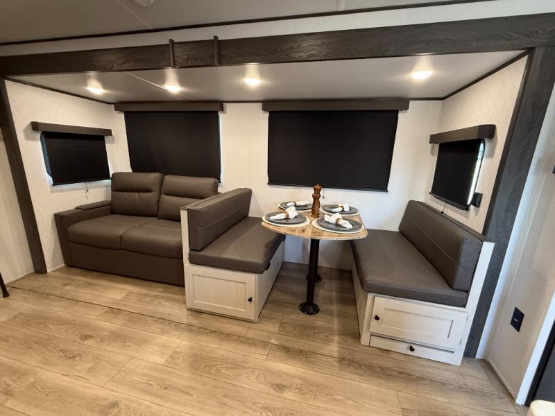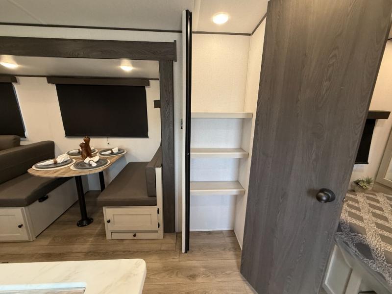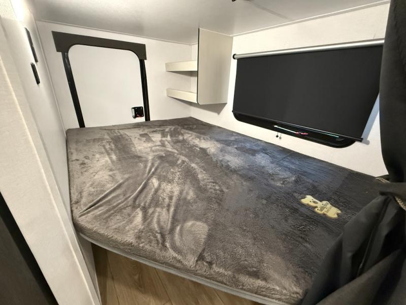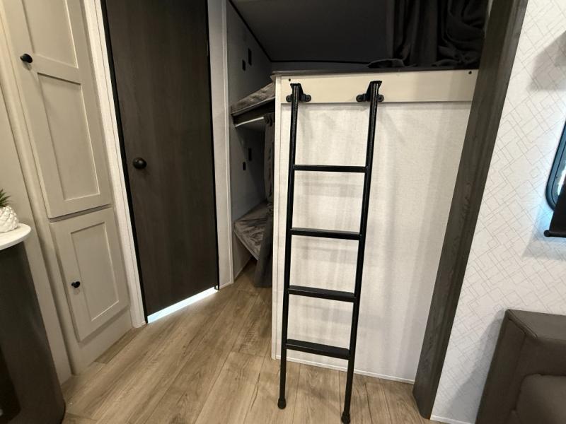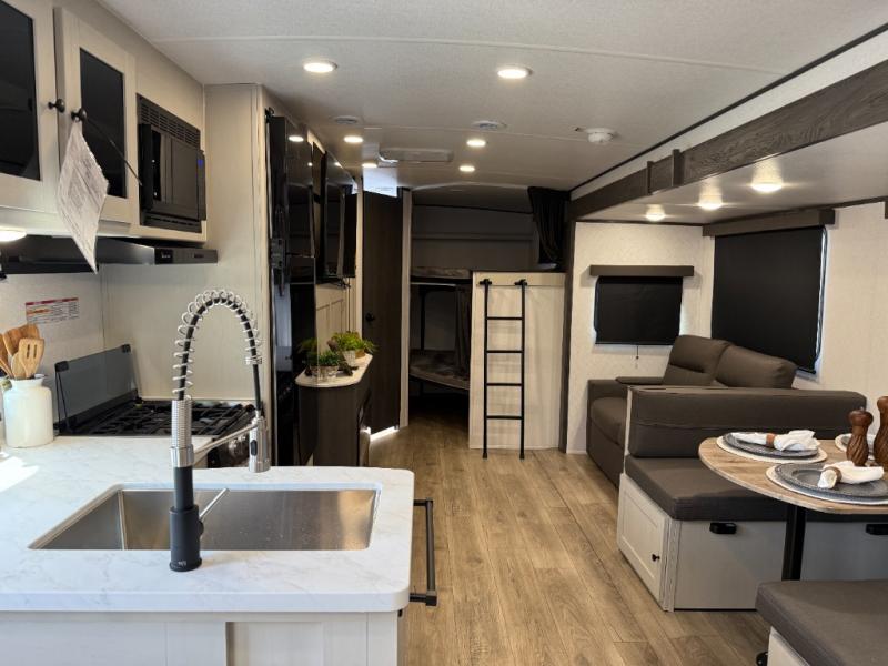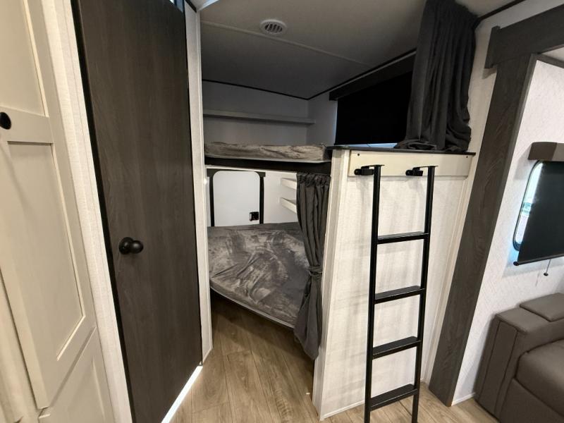 This is a popular bunk trailer for a larger family thanks to having the convenience of dual entry doors allowing access to the main living and kitchen area and near the front bedroom, and into the full bathroom for a quick in and out when playing outside. The bathroom also includes a hamper for convenience. The Stor-More cargo door allows you to place items from the exterior to the interior under the lower flip bunk for safe travels to your destinations and back home. The kids will surely love the convenience centers when playing or sleeping in a bunk. There is a sofa and booth dinette slide including a pet center for relaxing and feeding your pet. The kitchen includes full amenities plus a pantry to store lots of goodies for everyone. Along the exterior, the outside camp kitchen will come in handy when you have everyone at the campsite for dinner and the 18' awning offers some protection from the elements.