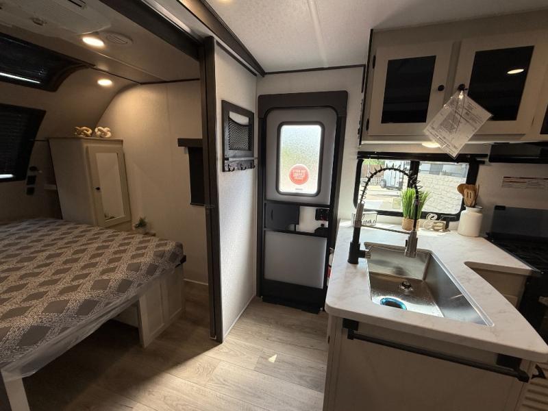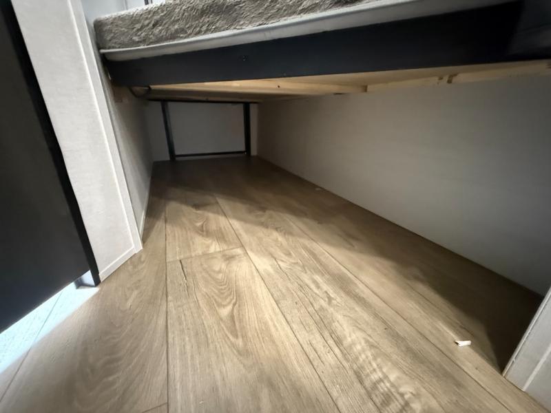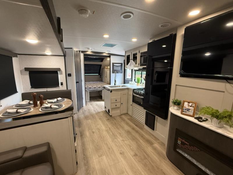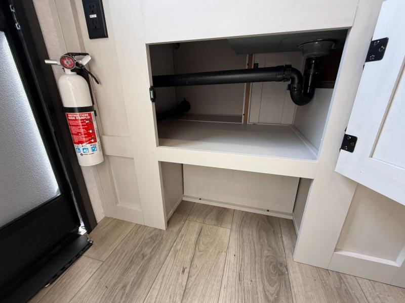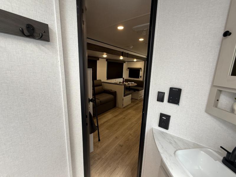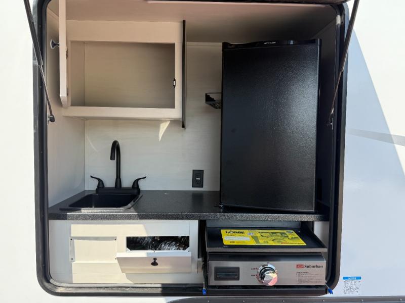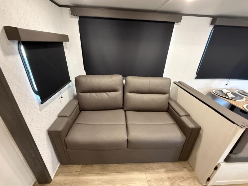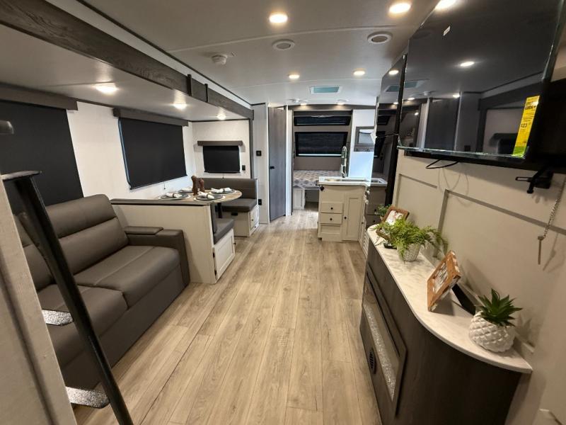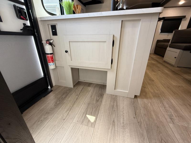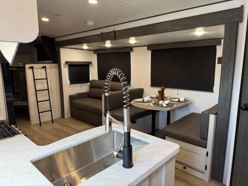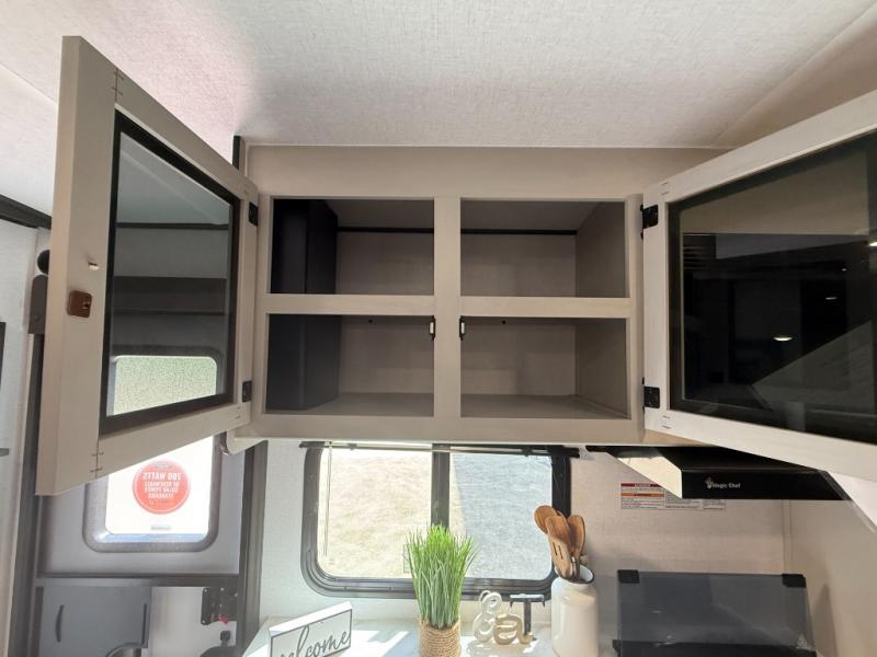 This is a popular bunk trailer for a larger family thanks to having the convenience of dual entry doors allowing access to the main living and kitchen area and near the front bedroom, and into the full bathroom for a quick in and out when playing outside. The bathroom also includes a hamper for convenience. The Stor-More cargo door allows you to place items from the exterior to the interior under the lower flip bunk for safe travels to your destinations and back home. The kids will surely love the convenience centers when playing or sleeping in a bunk. There is a sofa and booth dinette slide including a pet center for relaxing and feeding your pet. The kitchen includes full amenities plus a pantry to store lots of goodies for everyone. Along the exterior, the outside camp kitchen will come in handy when you have everyone at the campsite for dinner and the 18' awning offers some protection from the elements.