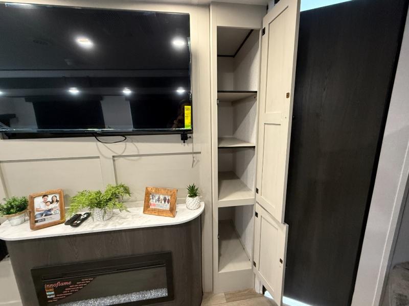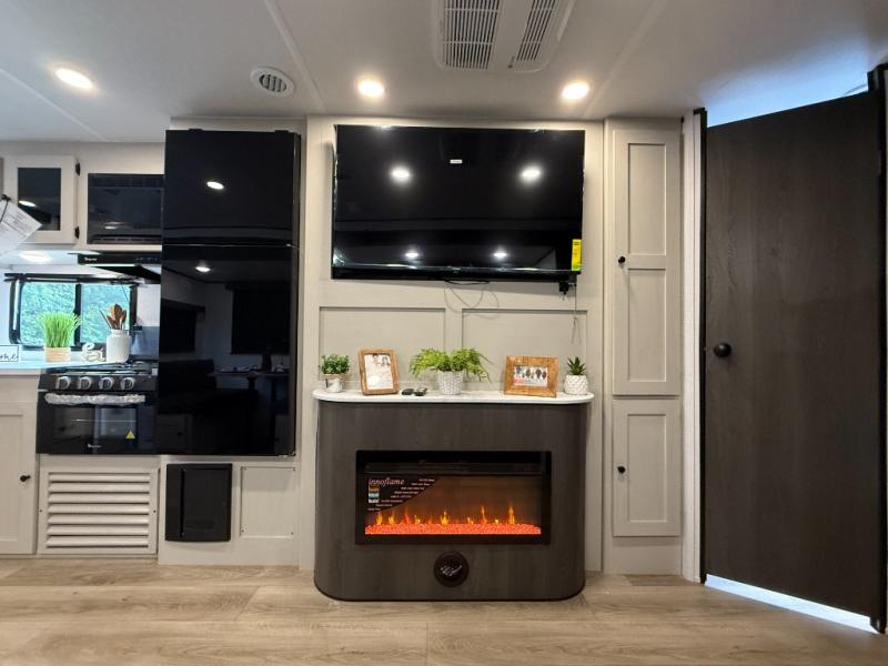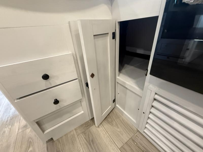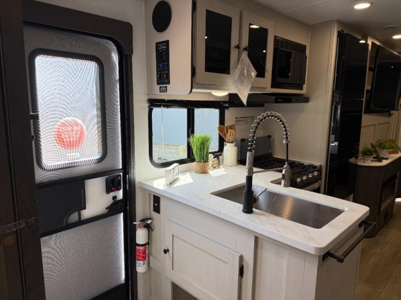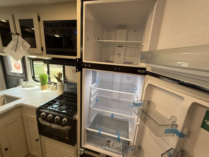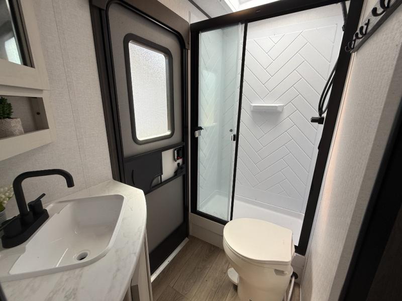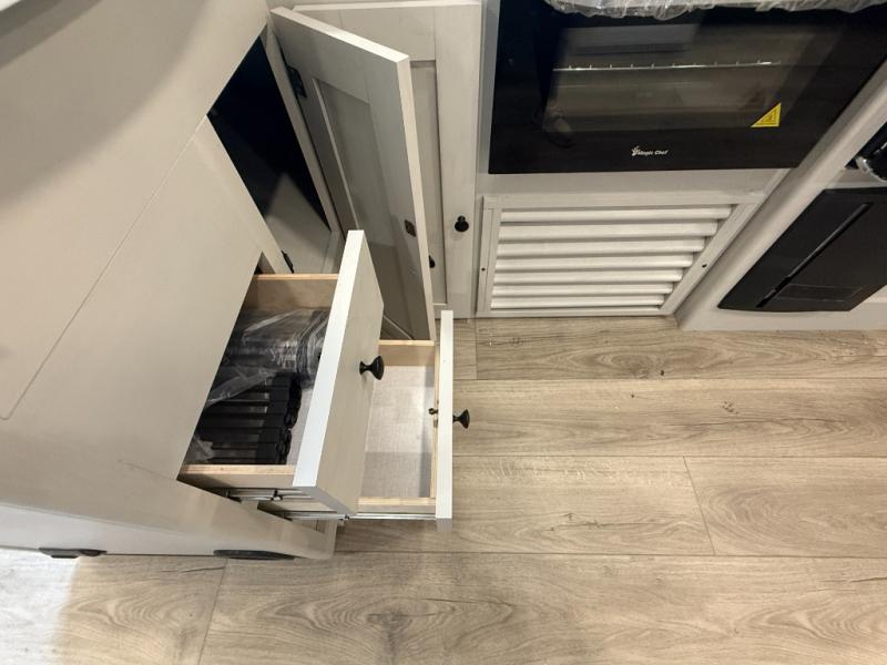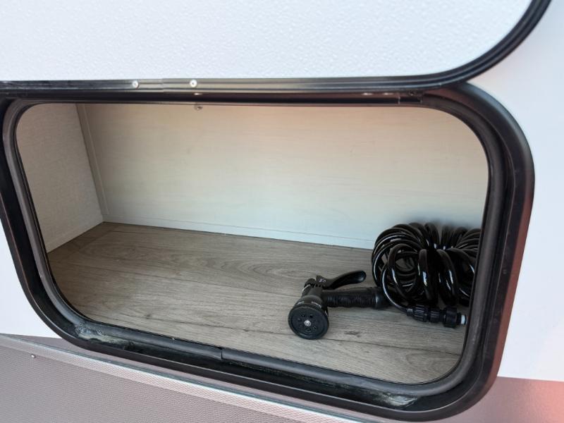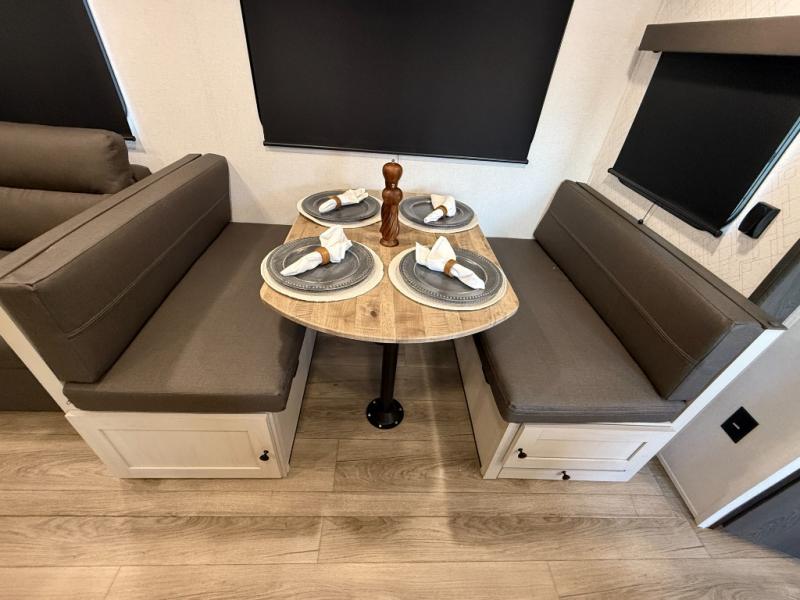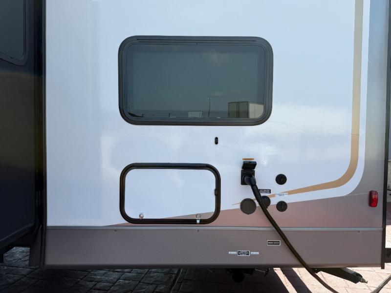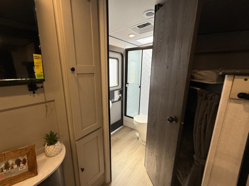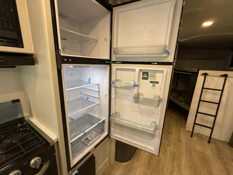 This is a popular bunk trailer for a larger family thanks to having the convenience of dual entry doors allowing access to the main living and kitchen area and near the front bedroom, and into the full bathroom for a quick in and out when playing outside. The bathroom also includes a hamper for convenience. The Stor-More cargo door allows you to place items from the exterior to the interior under the lower flip bunk for safe travels to your destinations and back home. The kids will surely love the convenience centers when playing or sleeping in a bunk. There is a sofa and booth dinette slide including a pet center for relaxing and feeding your pet. The kitchen includes full amenities plus a pantry to store lots of goodies for everyone. Along the exterior, the outside camp kitchen will come in handy when you have everyone at the campsite for dinner and the 18' awning offers some protection from the elements.