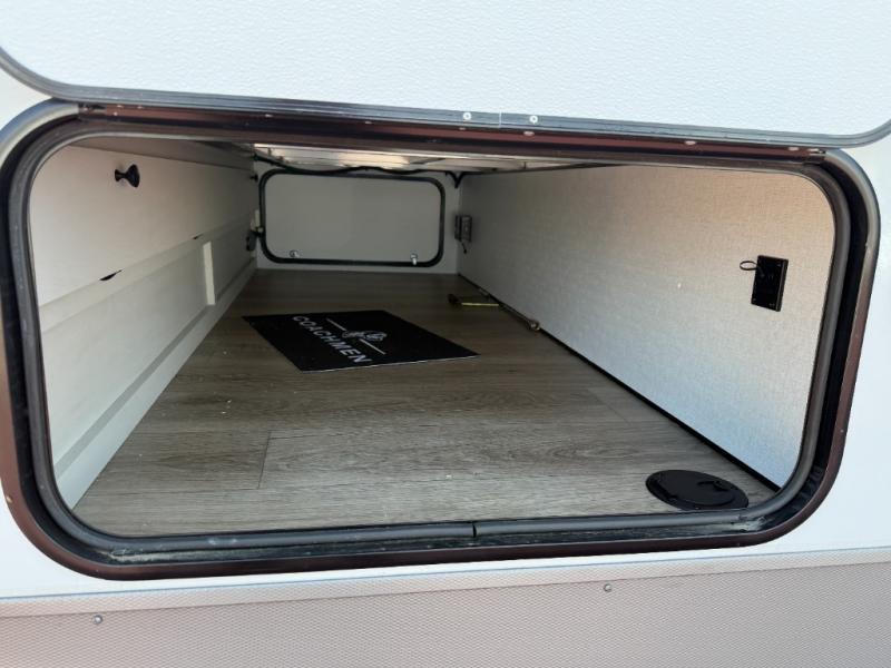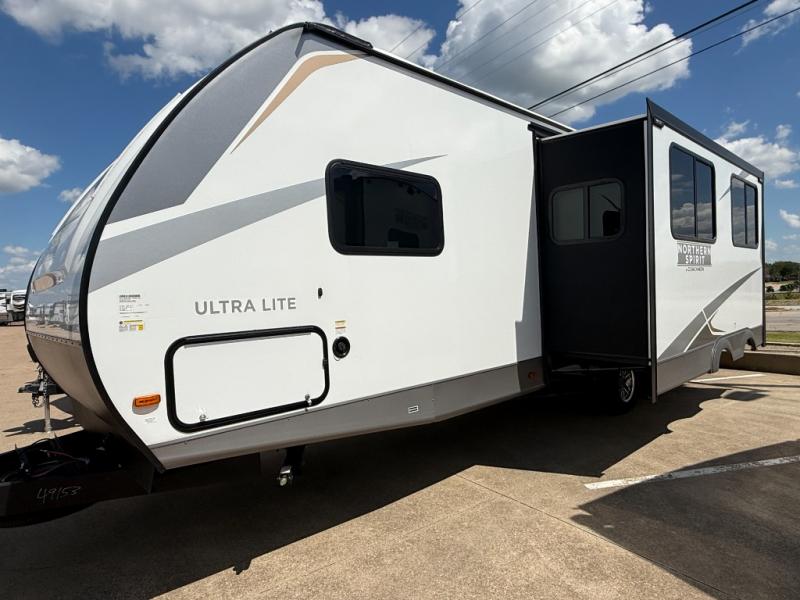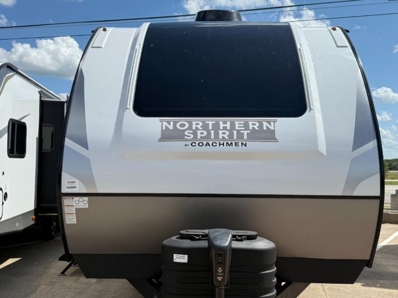 With any Northern Spirit Ultra Lite travel trailer by Coachmen, the "Twice Cool" dual ducted air conditioning system, motion activated floor lights, and the motion activated pass-through storage light plus fishing pole storage, will make your camping experience simplified. The heated and enclosed underbelly provides protection on the road, the 200W solar panel with 30 amp controller provides off-grid camping, and the power tongue jack makes setup easier. Each is built with a front cap with LED strip lights, a laminated, aluminum framed floor, rear wall, and sidewalls, plus a fully walkable roof with seamless Tufflex PVC covering. Make your decision today, and camp with everything in its place!