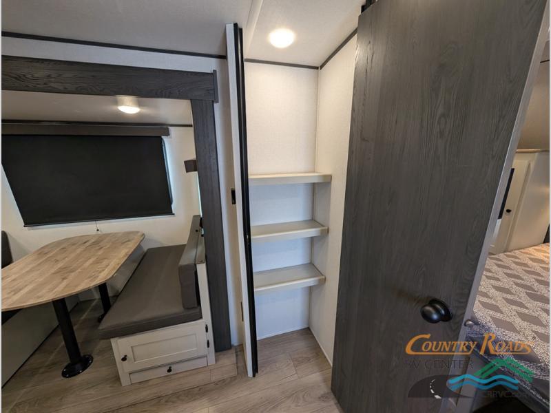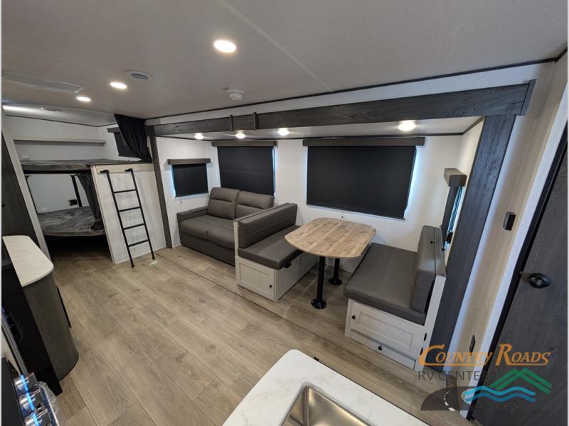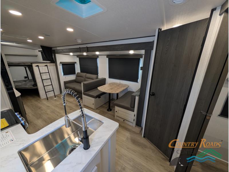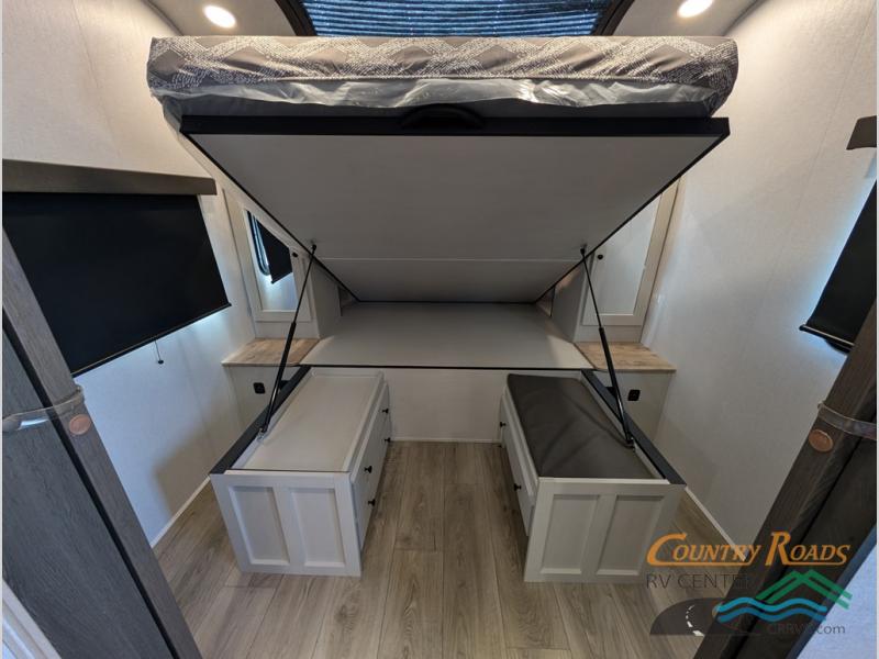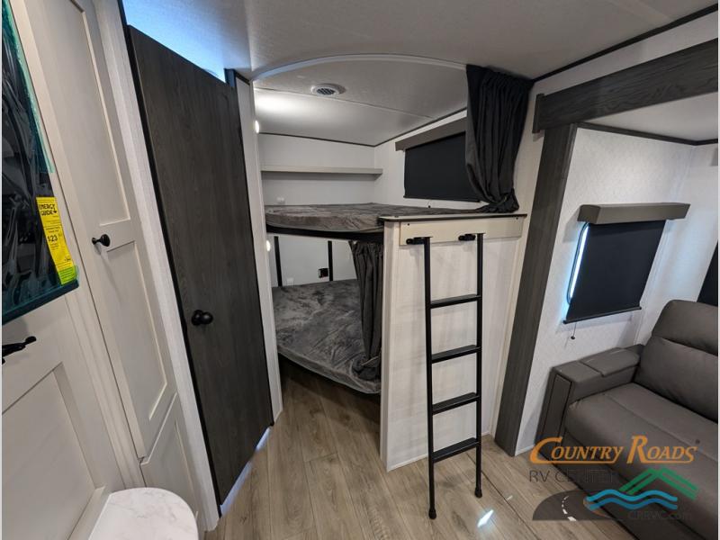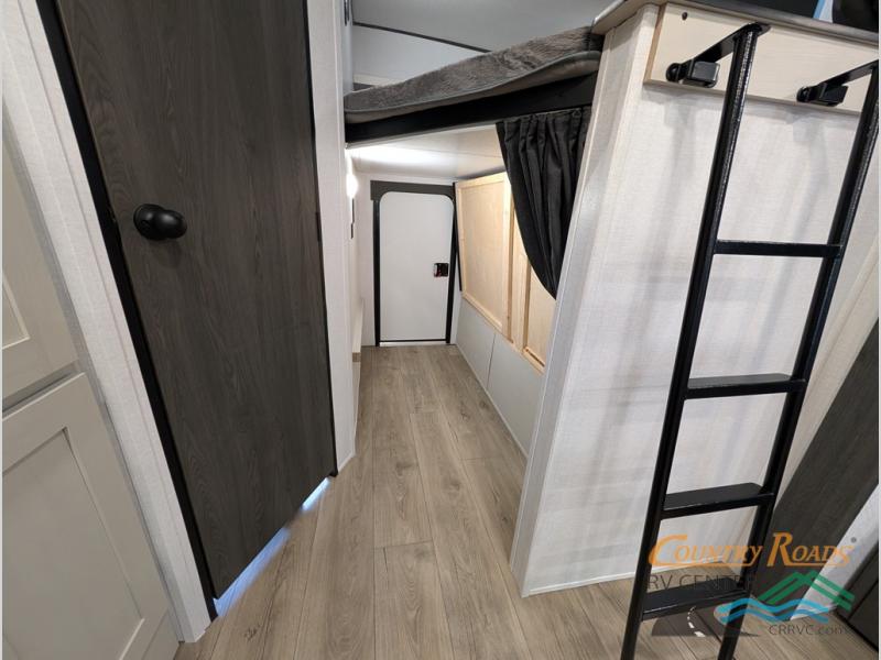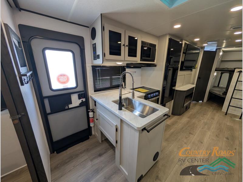 This is a popular bunk trailer for a larger family thanks to having the convenience of dual entry doors allowing access to the main living and kitchen area and near the front bedroom, and into the full bathroom for a quick in and out when playing outside. The bathroom also includes a hamper for convenience. The Stor-More cargo door allows you to place items from the exterior to the interior under the lower flip bunk for safe travels to your destinations and back home. The kids will surely love the convenience centers when playing or sleeping in a bunk. There is a sofa and booth dinette slide including a pet center for relaxing and feeding your pet. The kitchen includes full amenities plus a pantry to store lots of goodies for everyone. Along the exterior, the outside camp kitchen will come in handy when you have everyone at the campsite for dinner and the 18' awning offers some protection from the elements.