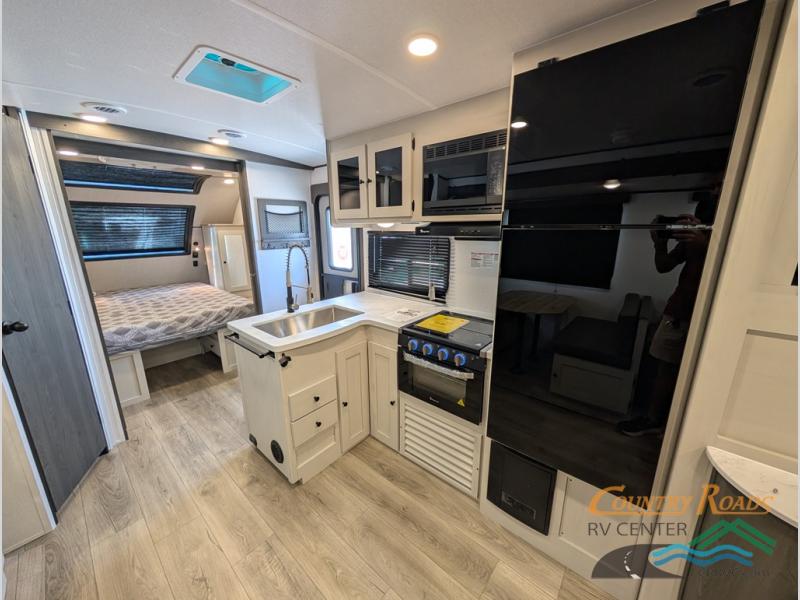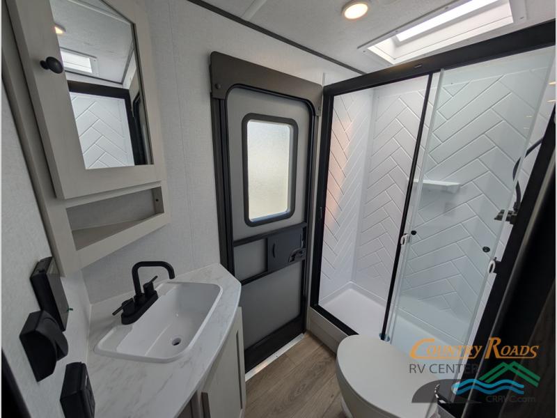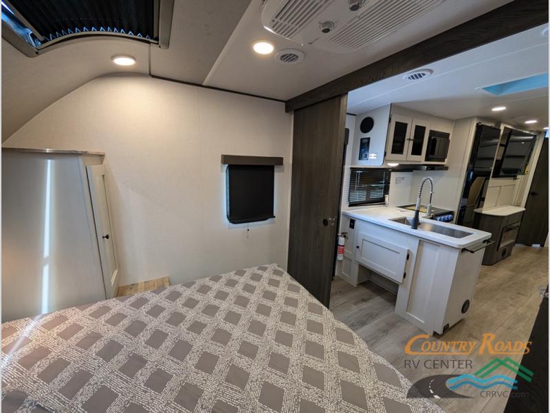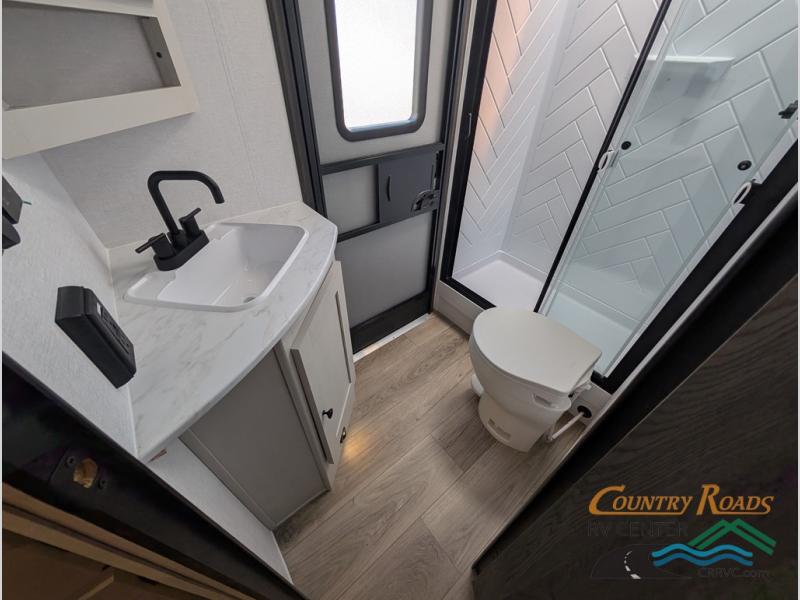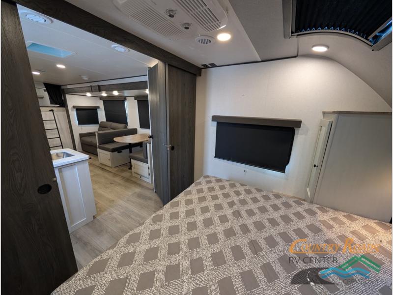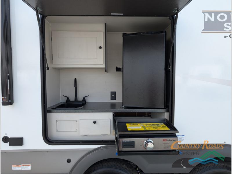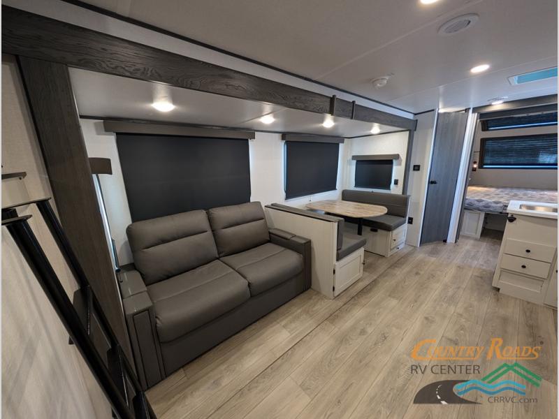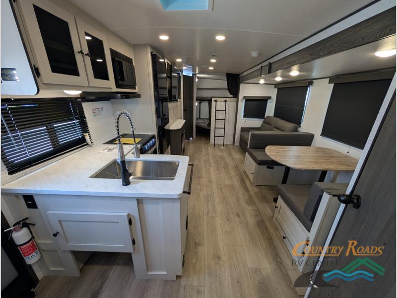This is a popular bunk trailer for a larger family thanks to having the convenience of dual entry doors allowing access to the main living and kitchen area and near the front bedroom, and into the full bathroom for a quick in and out when playing outside. The bathroom also includes a hamper for convenience. The Stor-More cargo door allows you to place items from the exterior to the interior under the lower flip bunk for safe travels to your destinations and back home. The kids will surely love the convenience centers when playing or sleeping in a bunk. There is a sofa and booth dinette slide including a pet center for relaxing and feeding your pet. The kitchen includes full amenities plus a pantry to store lots of goodies for everyone. Along the exterior, the outside camp kitchen will come in handy when you have everyone at the campsite for dinner and the 18' awning offers some protection from the elements.