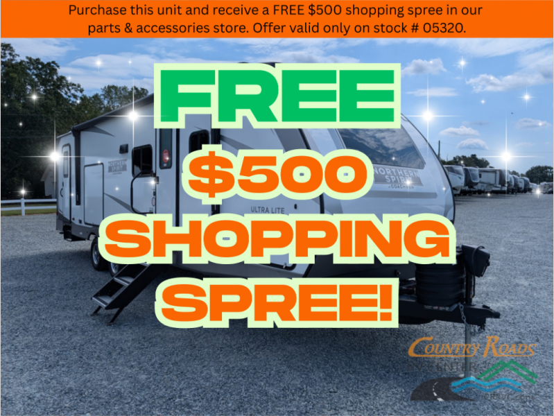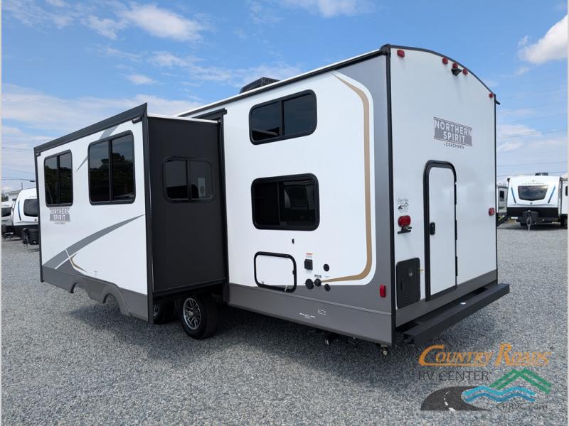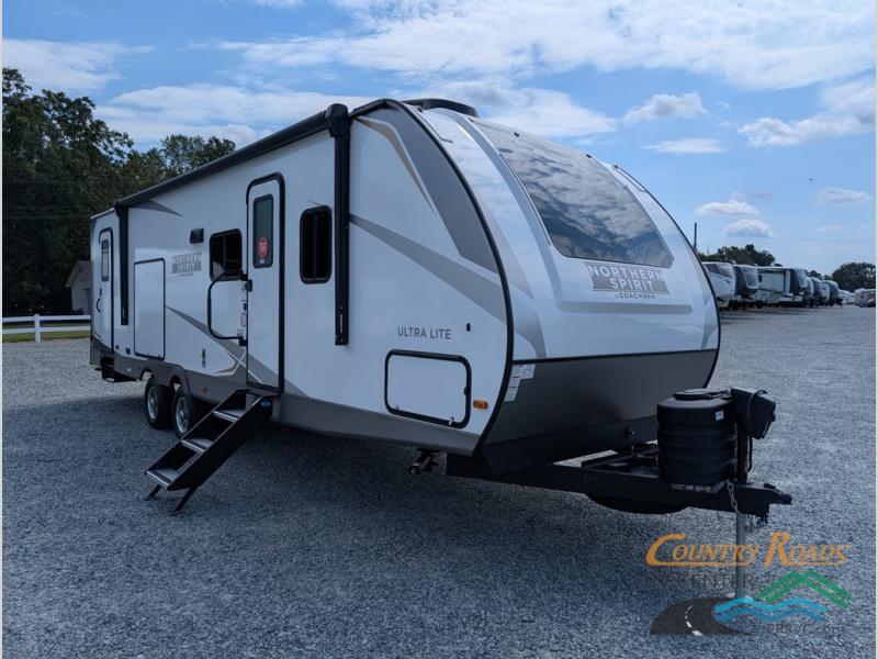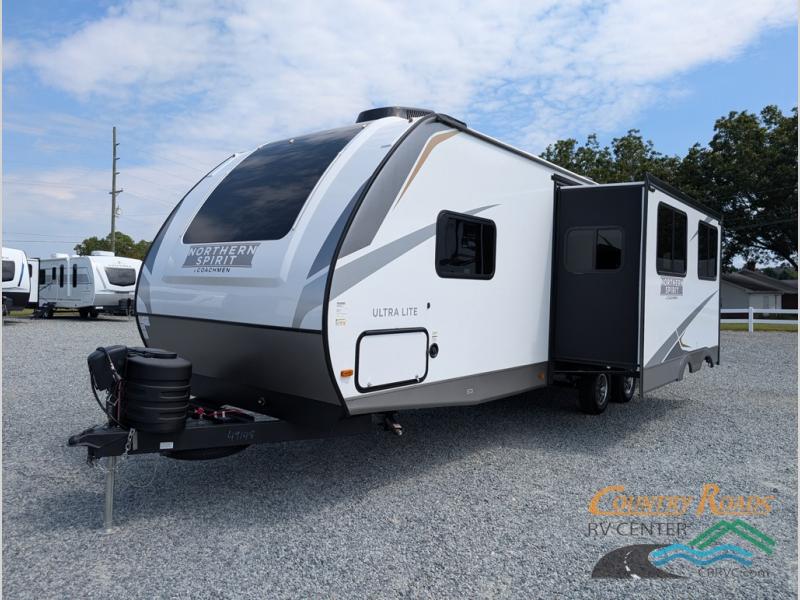 With any Northern Spirit Ultra Lite travel trailer by Coachmen, the "Twice Cool" dual ducted air conditioning system, motion activated floor lights, and the motion activated pass-through storage light plus fishing pole storage, will make your camping experience simplified. The heated and enclosed underbelly provides protection on the road, the 200W solar panel with 30 amp controller provides off-grid camping, and the power tongue jack makes setup easier. Each is built with a front cap with LED strip lights, a laminated, aluminum framed floor, rear wall, and sidewalls, plus a fully walkable roof with seamless Tufflex PVC covering. Make your decision today, and camp with everything in its place!