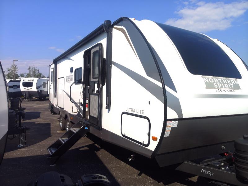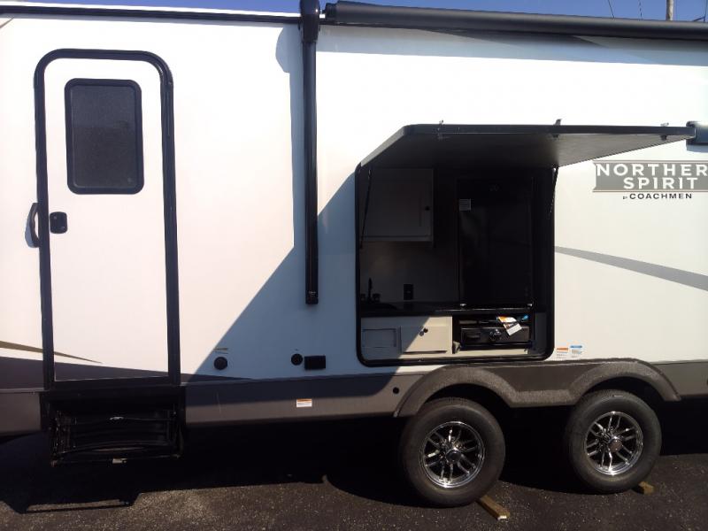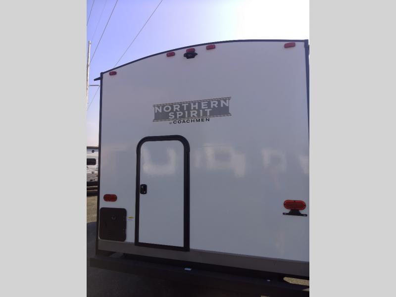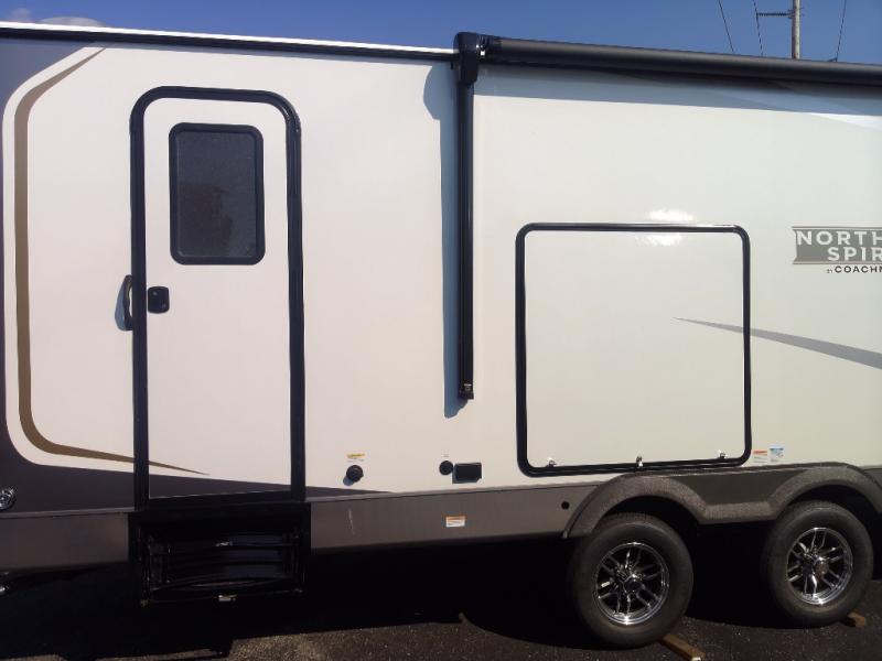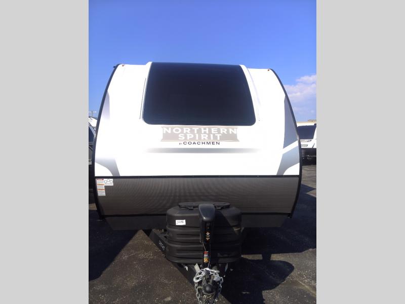 With any Northern Spirit Ultra Lite travel trailer by Coachmen, the "Twice Cool" dual ducted air conditioning system, motion activated floor lights, and the motion activated pass-through storage light plus fishing pole storage, will make your camping experience simplified. The heated and enclosed underbelly provides protection on the road, the 200W solar panel with 30 amp controller provides off-grid camping, and the power tongue jack makes setup easier. Each is built with a front cap with LED strip lights, a laminated, aluminum framed floor, rear wall, and sidewalls, plus a fully walkable roof with seamless Tufflex PVC covering. Make your decision today, and camp with everything in its place!