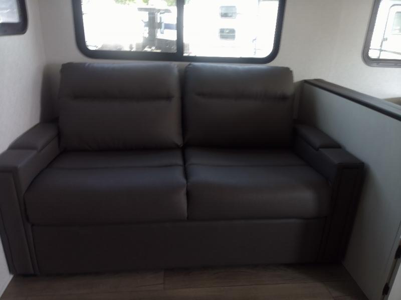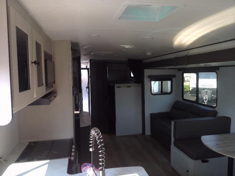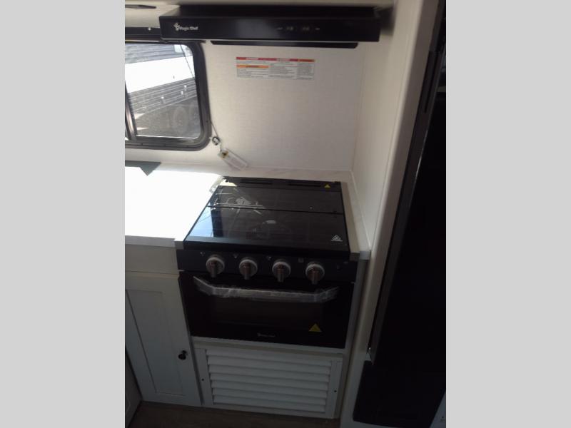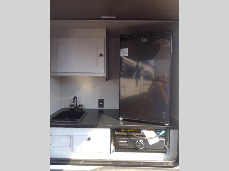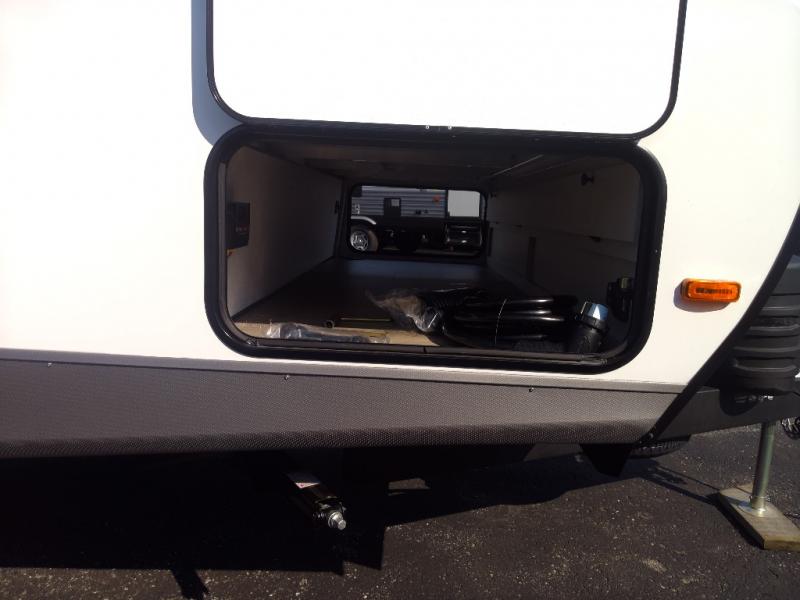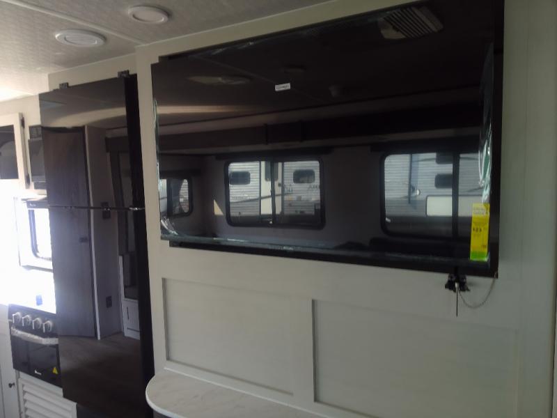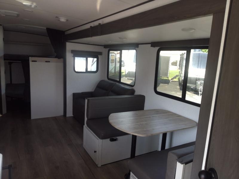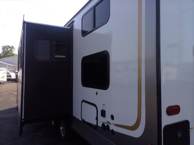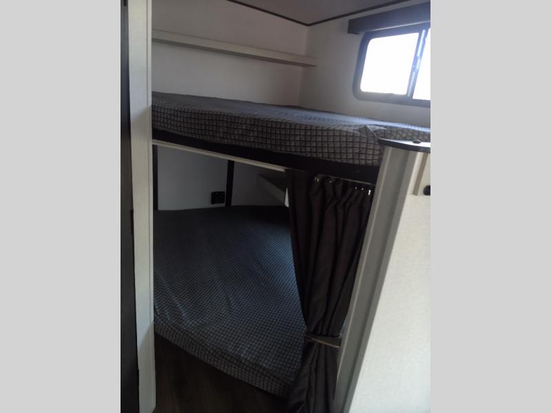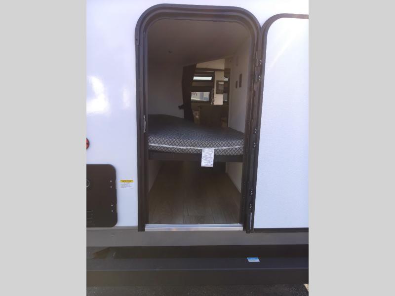 This is a popular bunk trailer for a larger family thanks to having the convenience of dual entry doors allowing access to the main living and kitchen area and near the front bedroom, and into the full bathroom for a quick in and out when playing outside. The bathroom also includes a hamper for convenience. The Stor-More cargo door allows you to place items from the exterior to the interior under the lower flip bunk for safe travels to your destinations and back home. The kids will surely love the convenience centers when playing or sleeping in a bunk. There is a sofa and booth dinette slide including a pet center for relaxing and feeding your pet. The kitchen includes full amenities plus a pantry to store lots of goodies for everyone. Along the exterior, the outside camp kitchen will come in handy when you have everyone at the campsite for dinner and the 18' awning offers some protection from the elements.
