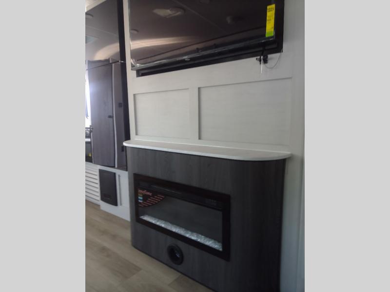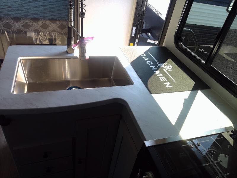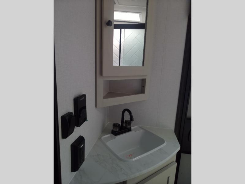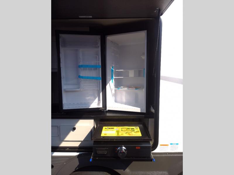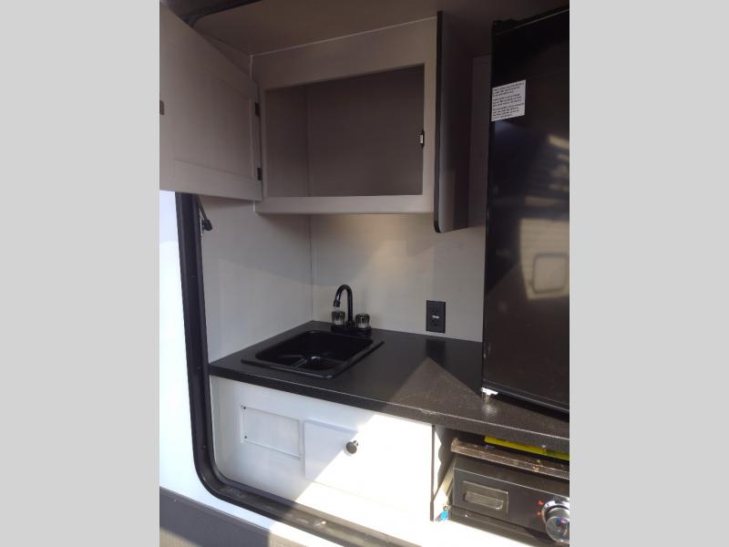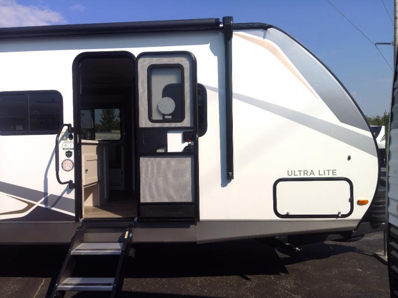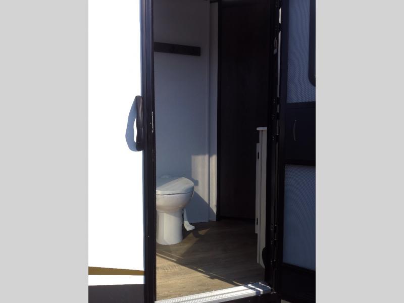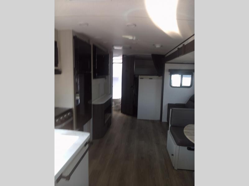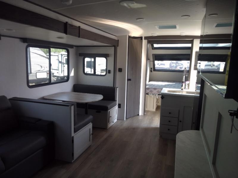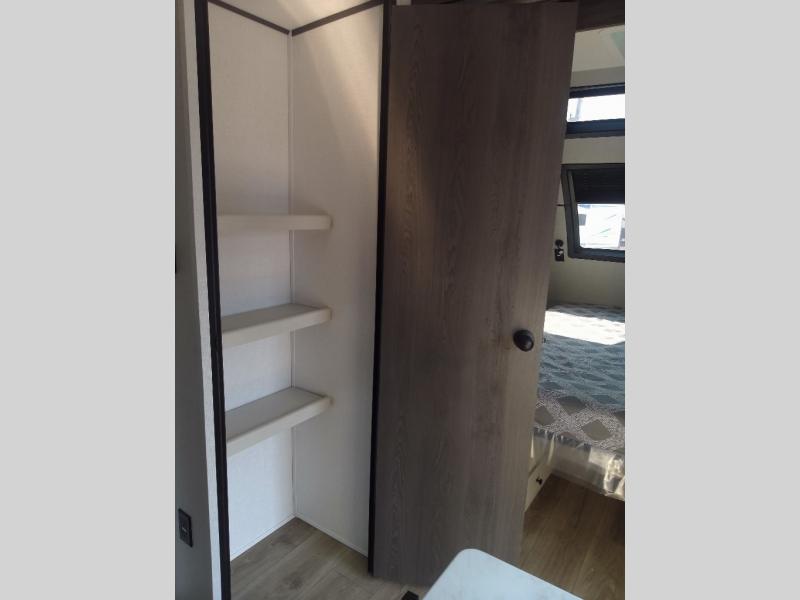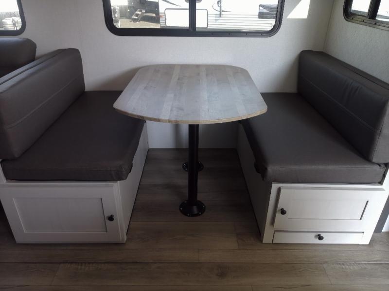 This is a popular bunk trailer for a larger family thanks to having the convenience of dual entry doors allowing access to the main living and kitchen area and near the front bedroom, and into the full bathroom for a quick in and out when playing outside. The bathroom also includes a hamper for convenience. The Stor-More cargo door allows you to place items from the exterior to the interior under the lower flip bunk for safe travels to your destinations and back home. The kids will surely love the convenience centers when playing or sleeping in a bunk. There is a sofa and booth dinette slide including a pet center for relaxing and feeding your pet. The kitchen includes full amenities plus a pantry to store lots of goodies for everyone. Along the exterior, the outside camp kitchen will come in handy when you have everyone at the campsite for dinner and the 18' awning offers some protection from the elements.