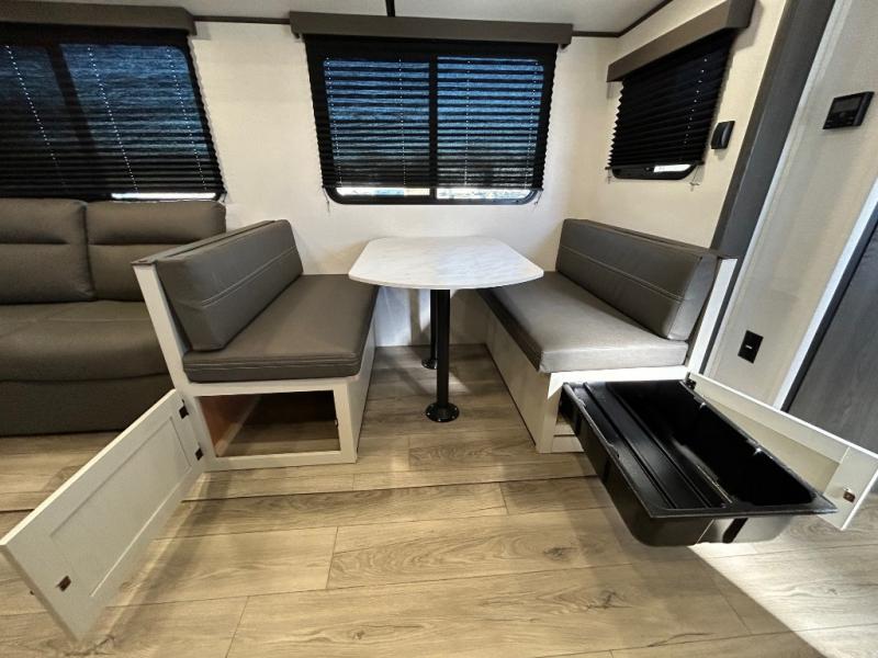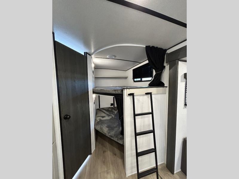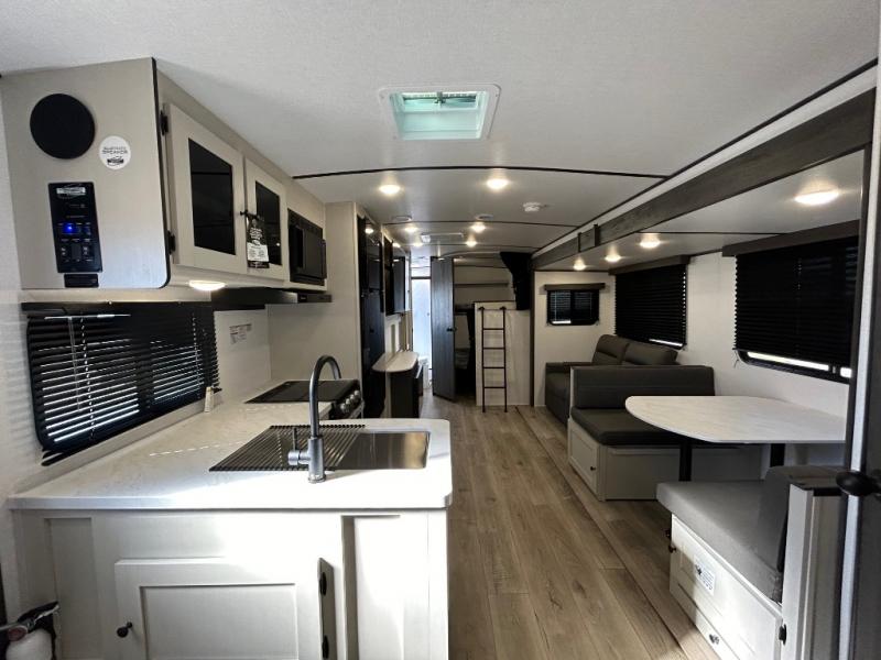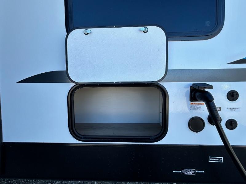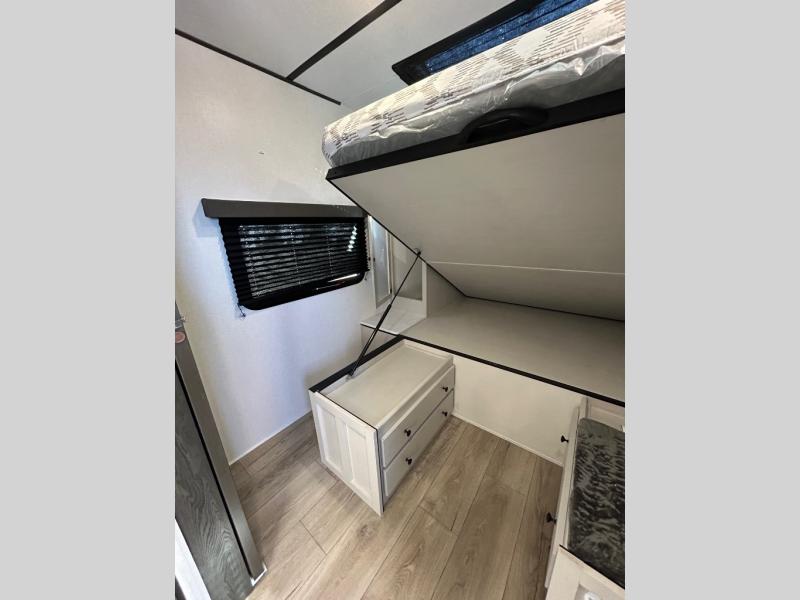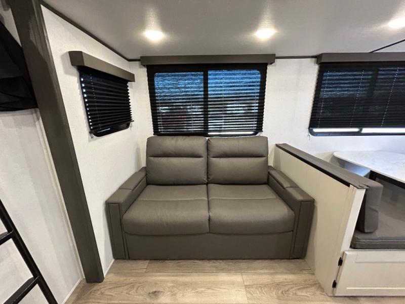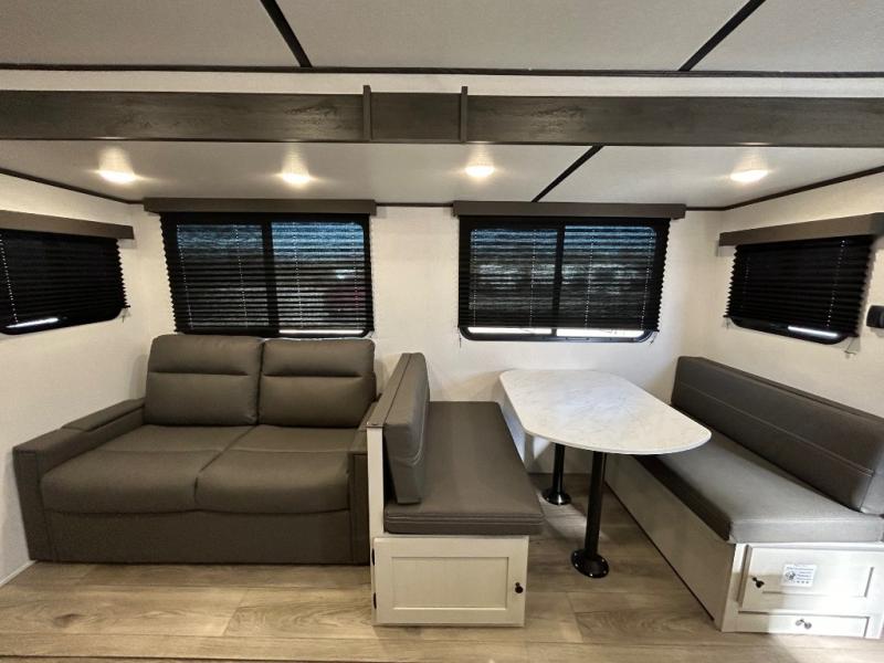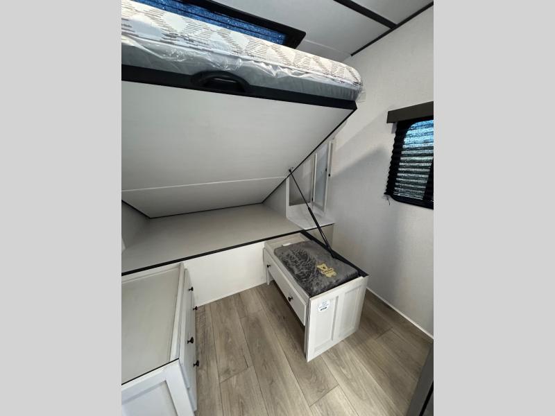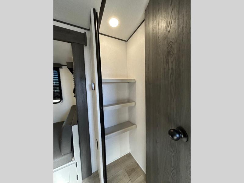 This is a popular bunk trailer for a larger family thanks to having the convenience of dual entry doors allowing access to the main living and kitchen area and near the front bedroom, and into the full bathroom for a quick in and out when playing outside. The bathroom also includes a hamper for convenience. The Stor-More cargo door allows you to place items from the exterior to the interior under the lower flip bunk for safe travels to your destinations and back home. The kids will surely love the convenience centers when playing or sleeping in a bunk. There is a sofa and booth dinette slide including a pet center for relaxing and feeding your pet. The kitchen includes full amenities plus a pantry to store lots of goodies for everyone. Along the exterior, the outside camp kitchen will come in handy when you have everyone at the campsite for dinner and the 18' awning offers some protection from the elements.