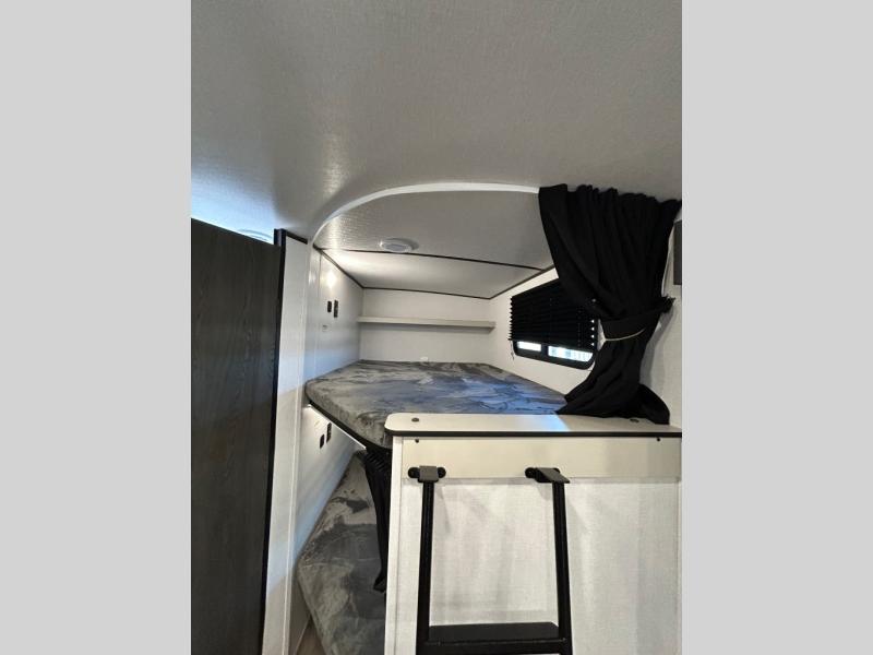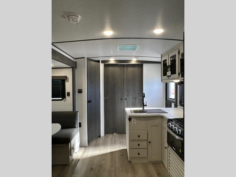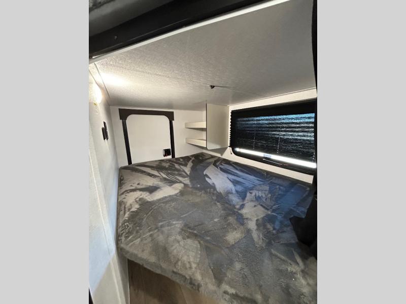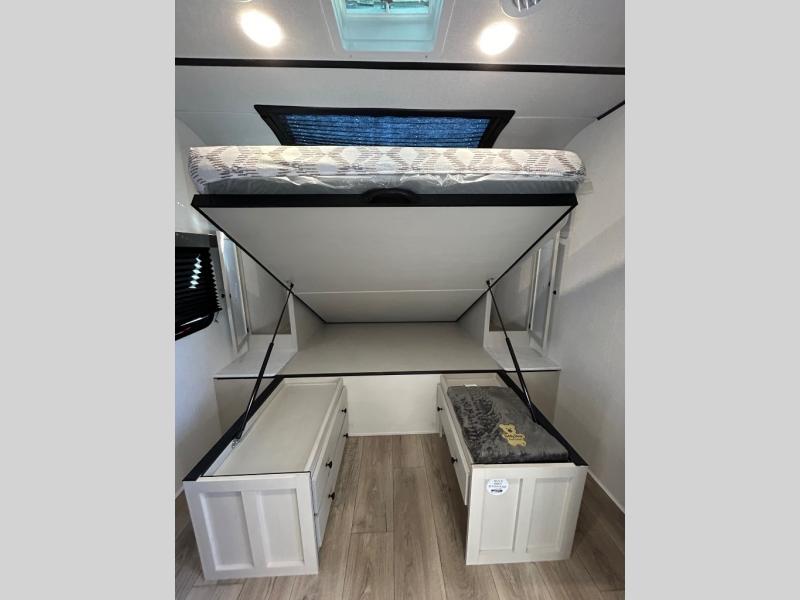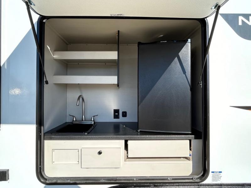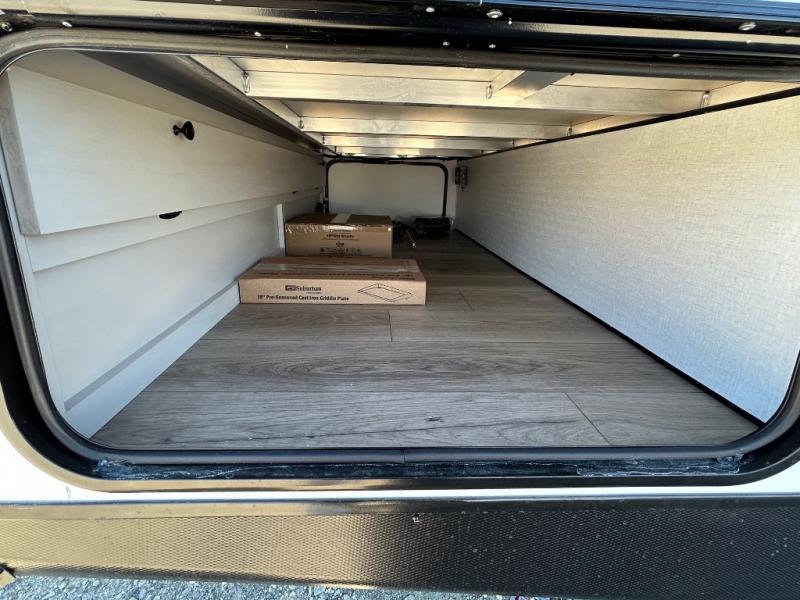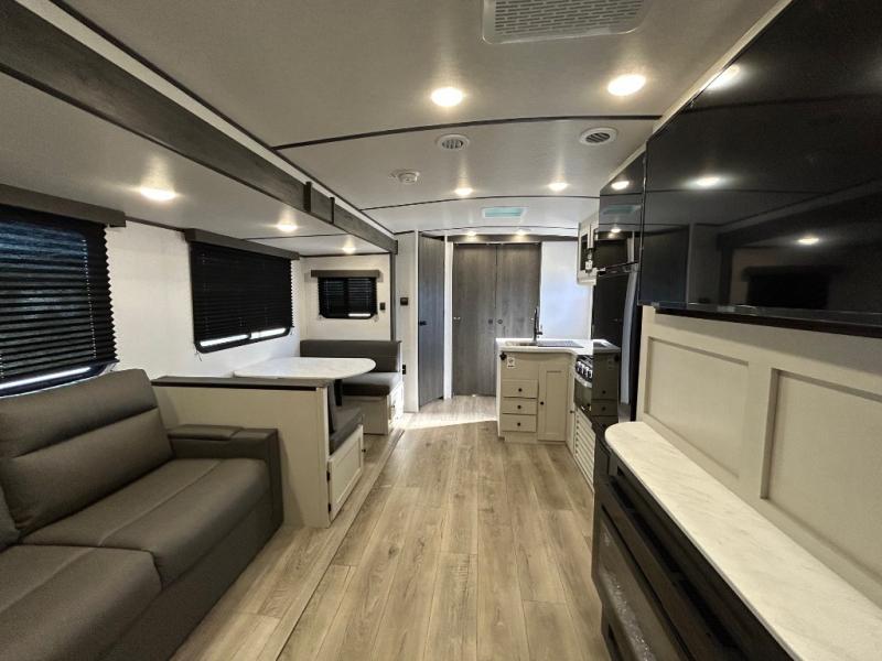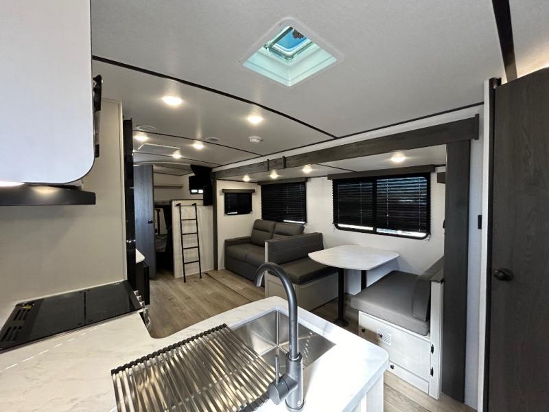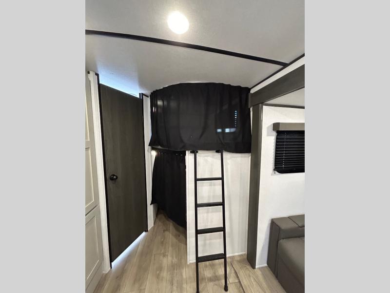 This is a popular bunk trailer for a larger family thanks to having the convenience of dual entry doors allowing access to the main living and kitchen area and near the front bedroom, and into the full bathroom for a quick in and out when playing outside. The bathroom also includes a hamper for convenience. The Stor-More cargo door allows you to place items from the exterior to the interior under the lower flip bunk for safe travels to your destinations and back home. The kids will surely love the convenience centers when playing or sleeping in a bunk. There is a sofa and booth dinette slide including a pet center for relaxing and feeding your pet. The kitchen includes full amenities plus a pantry to store lots of goodies for everyone. Along the exterior, the outside camp kitchen will come in handy when you have everyone at the campsite for dinner and the 18' awning offers some protection from the elements.