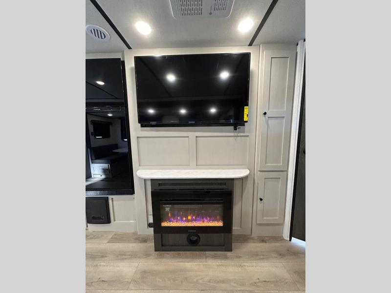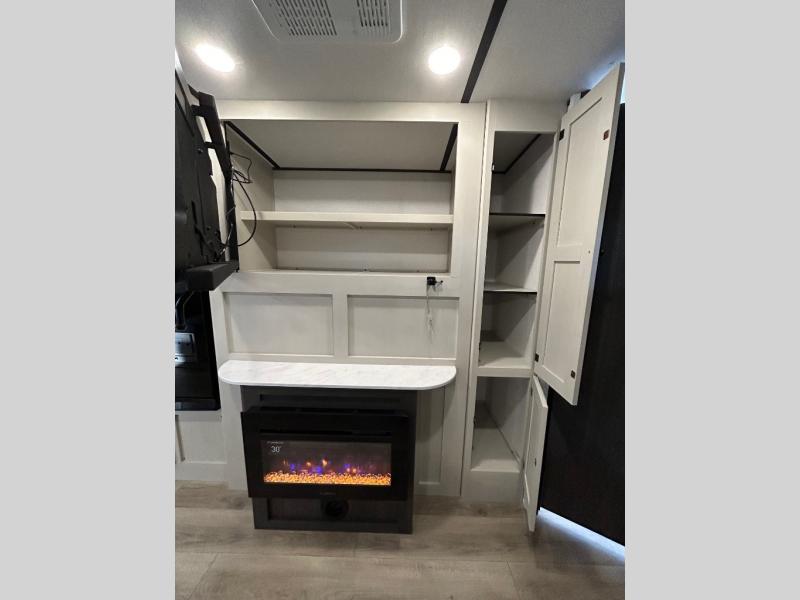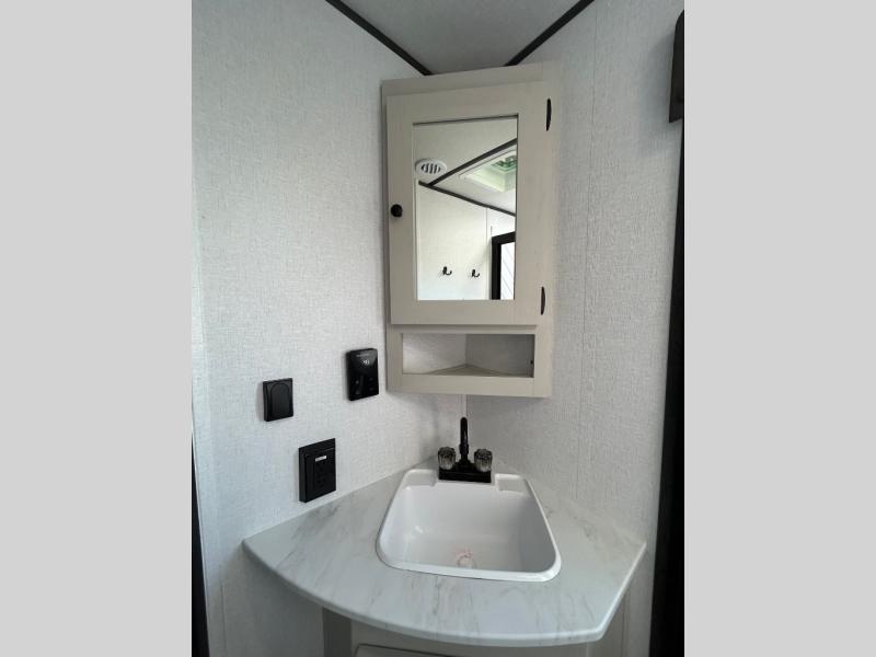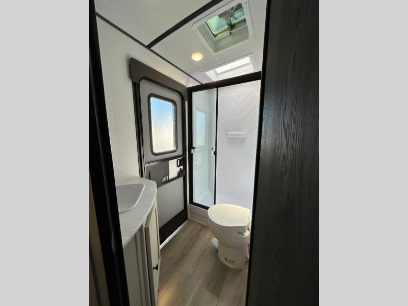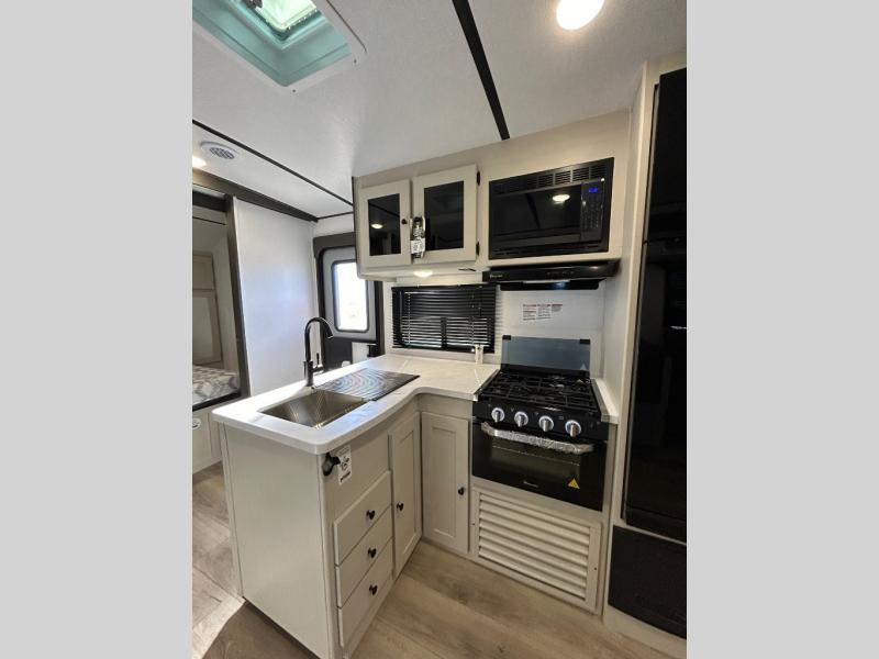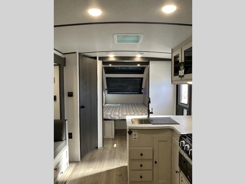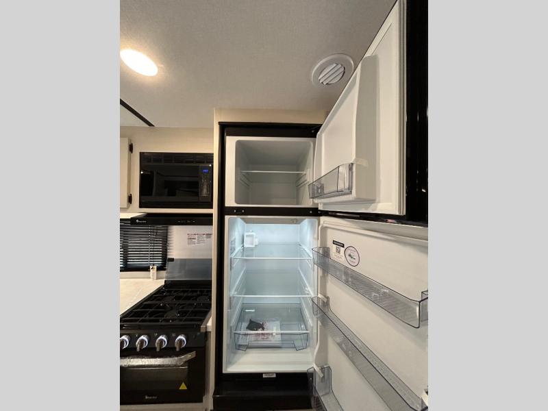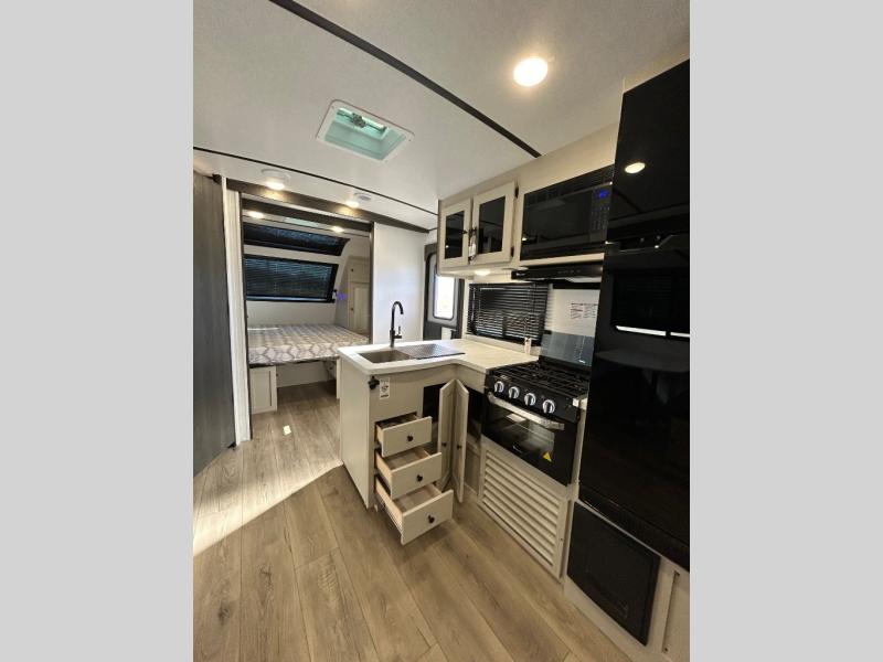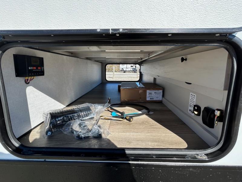 This is a popular bunk trailer for a larger family thanks to having the convenience of dual entry doors allowing access to the main living and kitchen area and near the front bedroom, and into the full bathroom for a quick in and out when playing outside. The bathroom also includes a hamper for convenience. The Stor-More cargo door allows you to place items from the exterior to the interior under the lower flip bunk for safe travels to your destinations and back home. The kids will surely love the convenience centers when playing or sleeping in a bunk. There is a sofa and booth dinette slide including a pet center for relaxing and feeding your pet. The kitchen includes full amenities plus a pantry to store lots of goodies for everyone. Along the exterior, the outside camp kitchen will come in handy when you have everyone at the campsite for dinner and the 18' awning offers some protection from the elements.