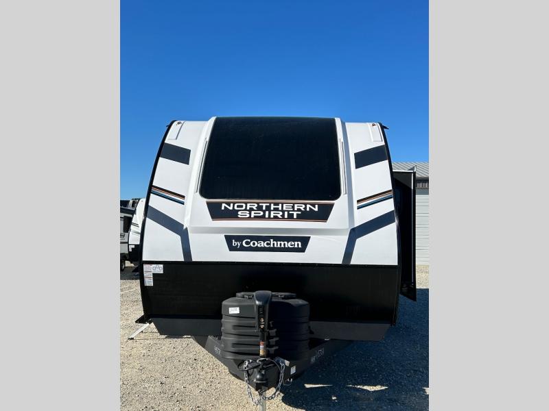 With any Northern Spirit Ultra Lite travel trailer by Coachmen, the "Twice Cool" dual ducted air conditioning system, motion activated floor lights, and the motion activated pass-through storage light plus fishing pole storage, will make your camping experience simplified. The heated and enclosed underbelly provides protection on the road, the 200W solar panel with 30 amp controller provides off-grid camping, and the power tongue jack makes setup easier. Each is built with a front cap with LED strip lights, a laminated, aluminum framed floor, rear wall, and sidewalls, plus a fully walkable roof with seamless Tufflex PVC covering. Make your decision today, and camp with everything in its place!