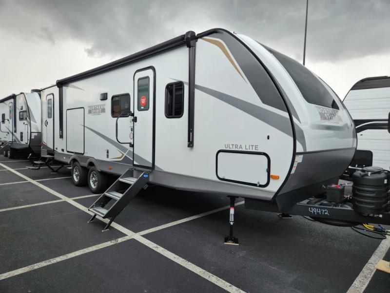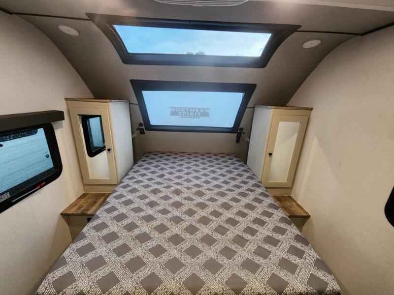 With any Northern Spirit Ultra Lite travel trailer by Coachmen, the "Twice Cool" dual ducted air conditioning system, motion activated floor lights, and the motion activated pass-through storage light plus fishing pole storage, will make your camping experience simplified. The heated and enclosed underbelly provides protection on the road, the 200W solar panel with 30 amp controller provides off-grid camping, and the power tongue jack makes setup easier. Each is built with a front cap with LED strip lights, a laminated, aluminum framed floor, rear wall, and sidewalls, plus a fully walkable roof with seamless Tufflex PVC covering. Make your decision today, and camp with everything in its place!