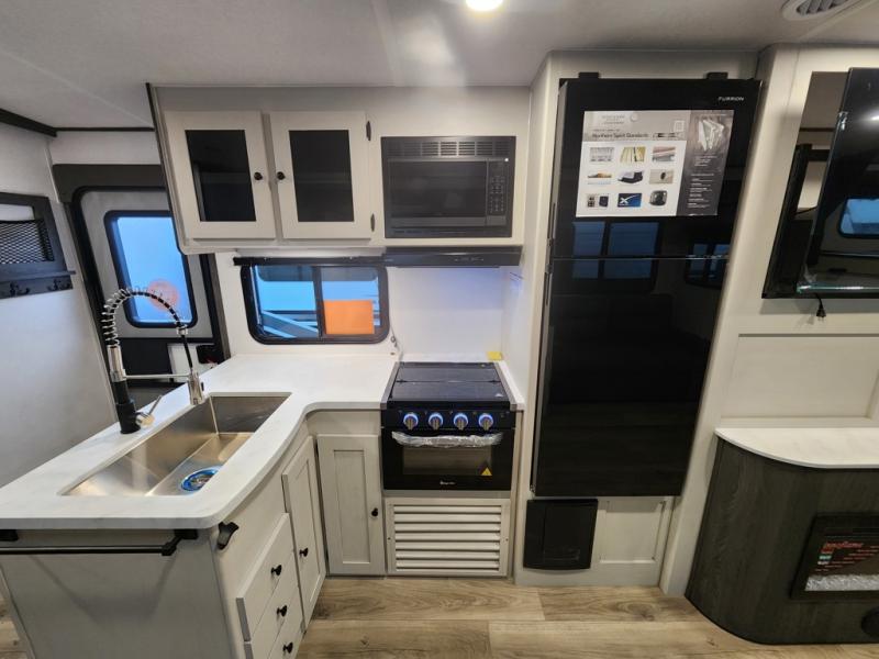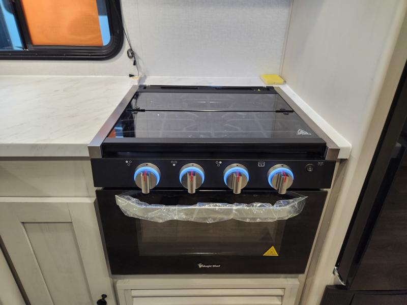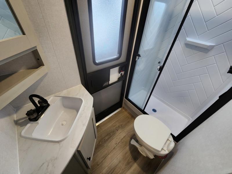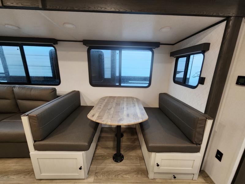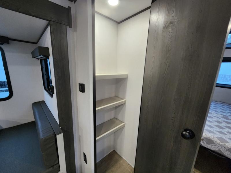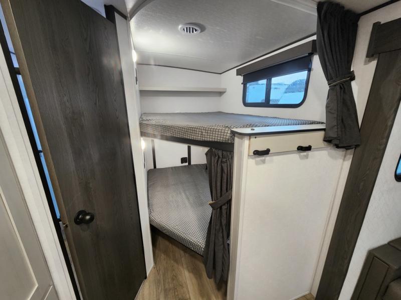 This is a popular bunk trailer for a larger family thanks to having the convenience of dual entry doors allowing access to the main living and kitchen area and near the front bedroom, and into the full bathroom for a quick in and out when playing outside. The bathroom also includes a hamper for convenience. The Stor-More cargo door allows you to place items from the exterior to the interior under the lower flip bunk for safe travels to your destinations and back home. The kids will surely love the convenience centers when playing or sleeping in a bunk. There is a sofa and booth dinette slide including a pet center for relaxing and feeding your pet. The kitchen includes full amenities plus a pantry to store lots of goodies for everyone. Along the exterior, the outside camp kitchen will come in handy when you have everyone at the campsite for dinner and the 18' awning offers some protection from the elements.
