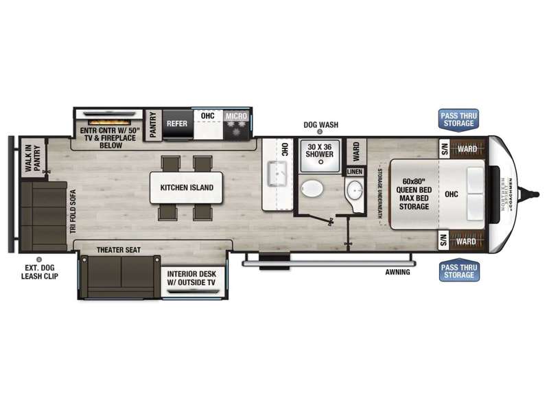 This rear kitchen offers an abundance of living space, storage, and counterspace. The large kitchen and open concept living area create a perfect floorplan for those looking to get away. At only 6,500 lb., towing will be a breeze.