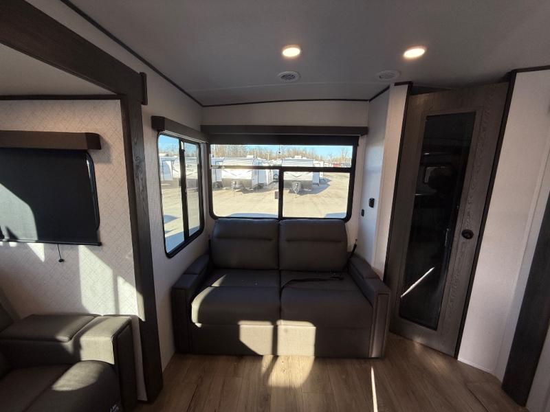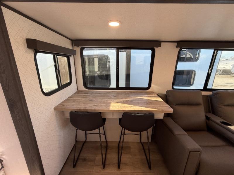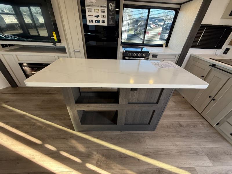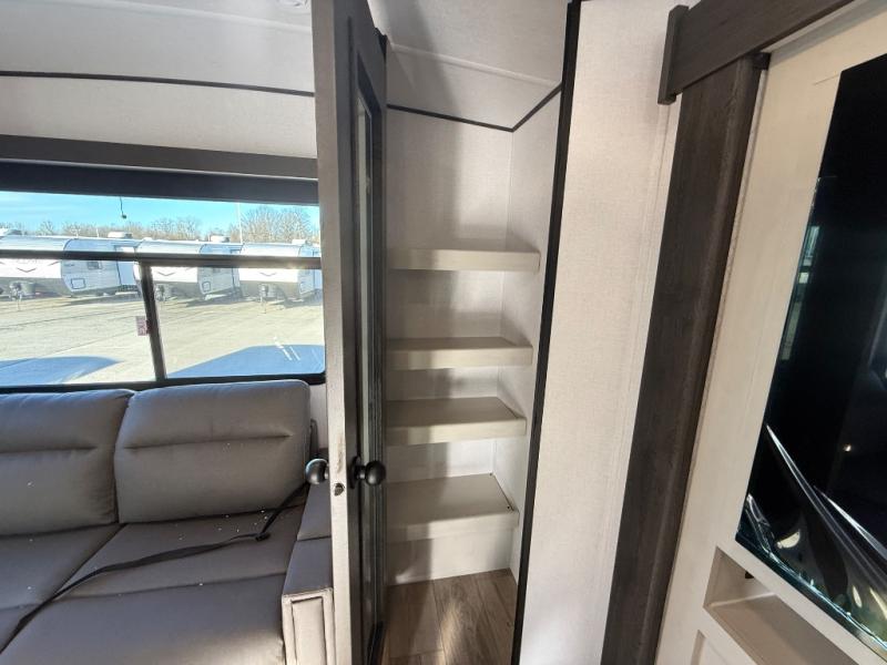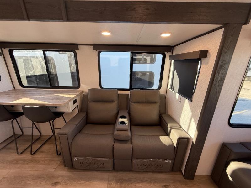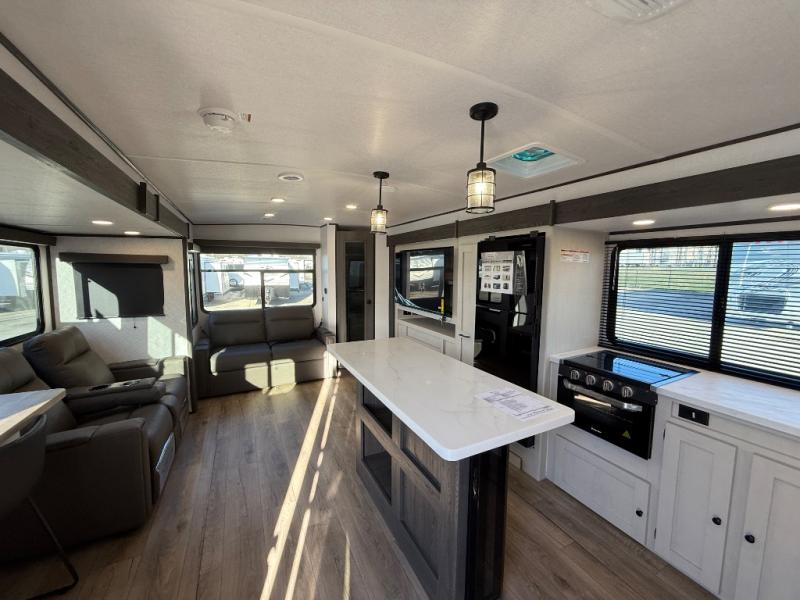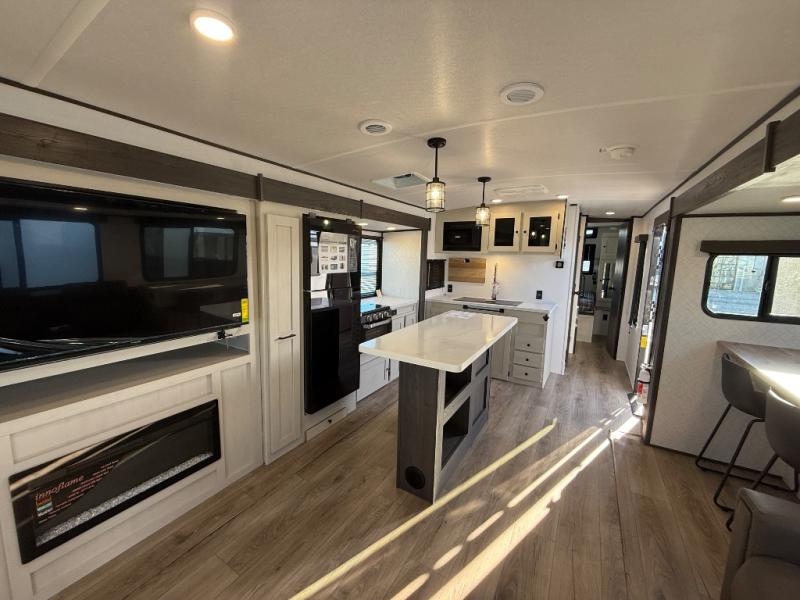 Escape to a world of adventure and relaxation with this incredible travel trailer! The rear living area is a dynamic hub of entertainment, featuring a versatile tri-fold sofa and a premium theater seat that lets you immerse yourself in your favorite shows or movies. The cutting-edge entertainment center provides endless hours of fun. Equipped with top-of-the-line appliances, including a spacious refrigerator, three-burner range, and microwave, the kitchen is a culinary haven. The functional kitchen island provides additional counter space, while the generous walk-in pantry and ample overhead cabinets keep your kitchen essentials organized and within easy reach. The front bedroom is a serene sanctuary, featuring a comfortable queen bed with plenty of storage under it and spacious wardrobes on each side of the bed, ideal for keeping your favorite outfits organized and free of dirt.