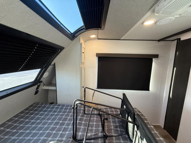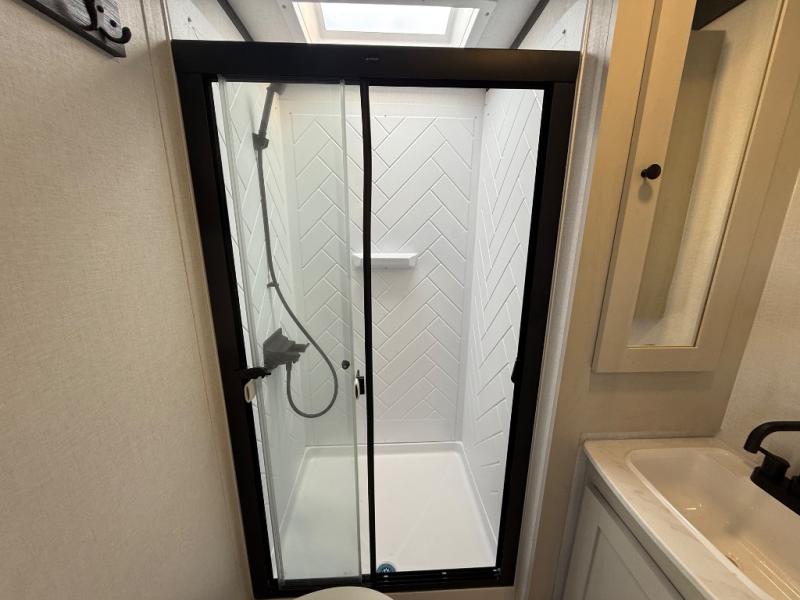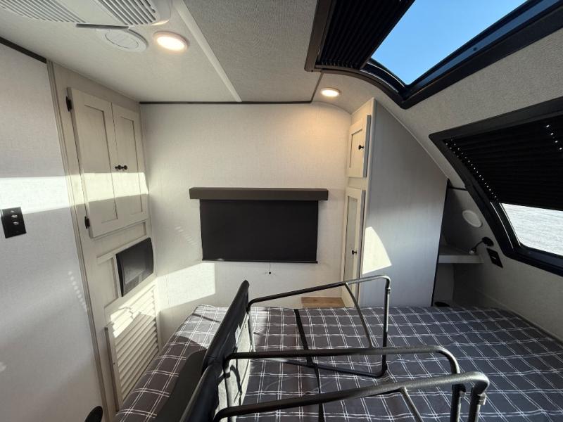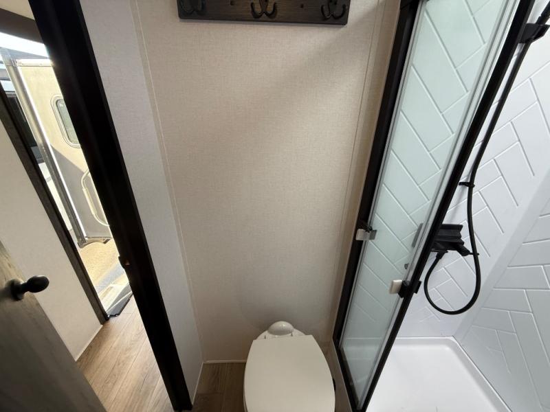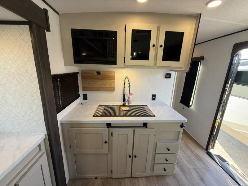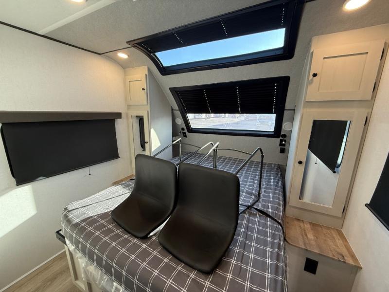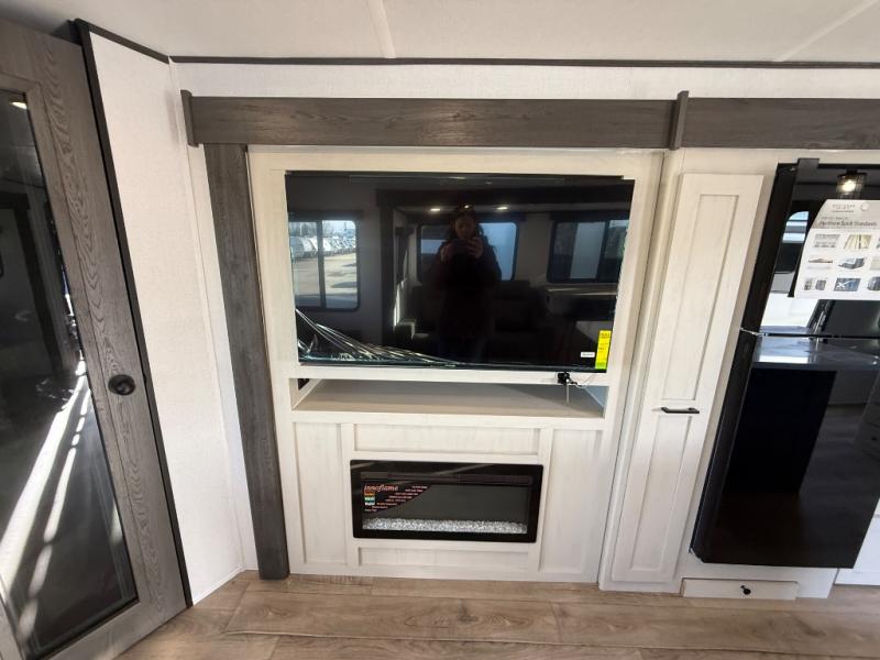 Escape to a world of adventure and relaxation with this incredible travel trailer! The rear living area is a dynamic hub of entertainment, featuring a versatile tri-fold sofa and a premium theater seat that lets you immerse yourself in your favorite shows or movies. The cutting-edge entertainment center provides endless hours of fun. Equipped with top-of-the-line appliances, including a spacious refrigerator, three-burner range, and microwave, the kitchen is a culinary haven. The functional kitchen island provides additional counter space, while the generous walk-in pantry and ample overhead cabinets keep your kitchen essentials organized and within easy reach. The front bedroom is a serene sanctuary, featuring a comfortable queen bed with plenty of storage under it and spacious wardrobes on each side of the bed, ideal for keeping your favorite outfits organized and free of dirt.