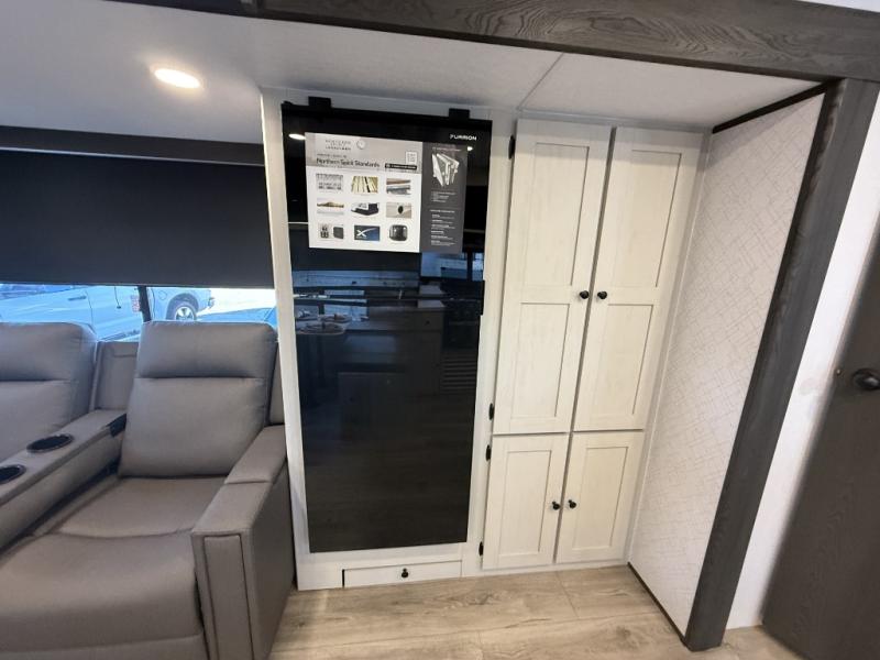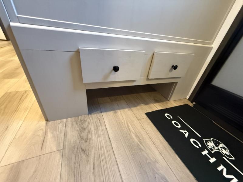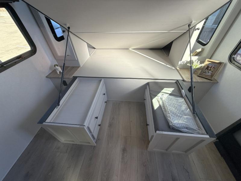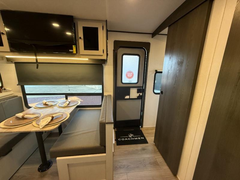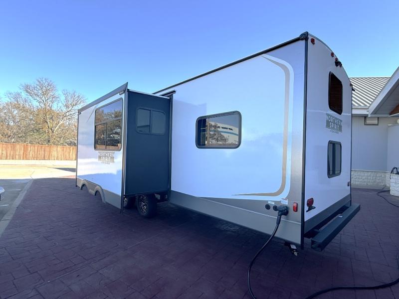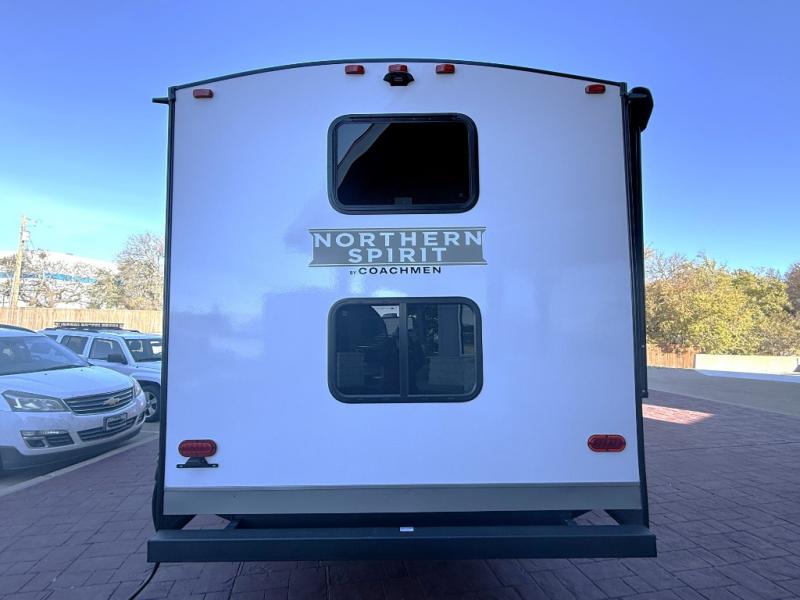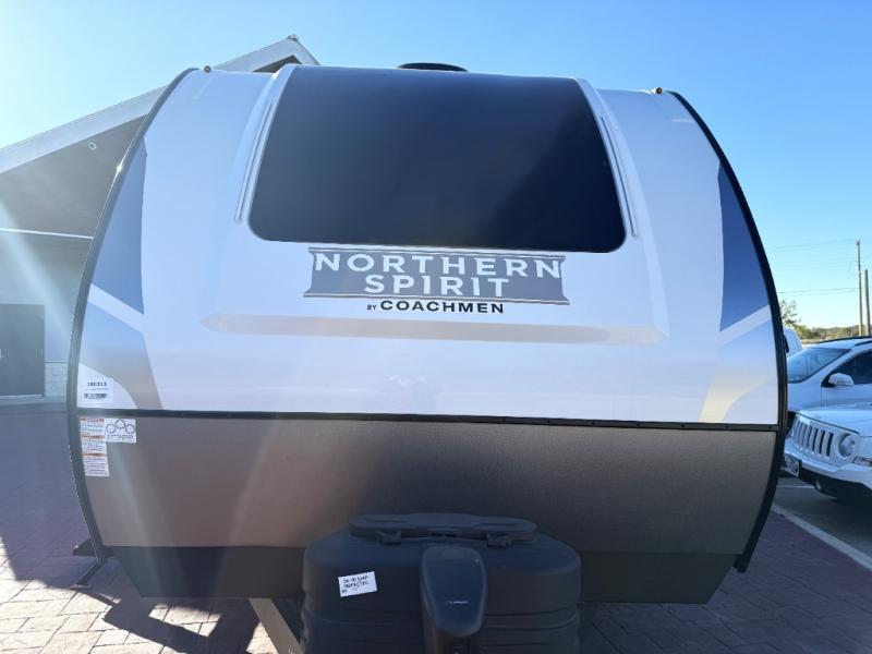 With any Northern Spirit Ultra Lite travel trailer by Coachmen, the "Twice Cool" dual ducted air conditioning system, motion activated floor lights, and the motion activated pass-through storage light plus fishing pole storage, will make your camping experience simplified. The heated and enclosed underbelly provides protection on the road, the 200W solar panel with 30 amp controller provides off-grid camping, and the power tongue jack makes setup easier. Each is built with a front cap with LED strip lights, a laminated, aluminum framed floor, rear wall, and sidewalls, plus a fully walkable roof with seamless Tufflex PVC covering. Make your decision today, and camp with everything in its place!