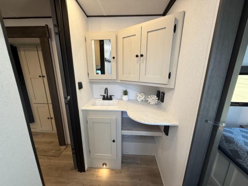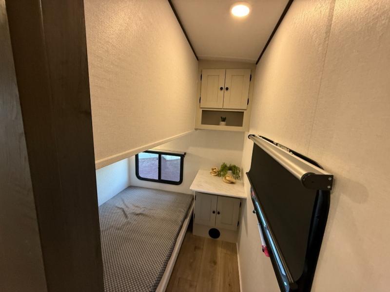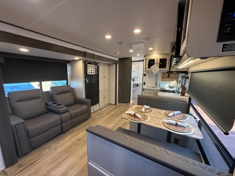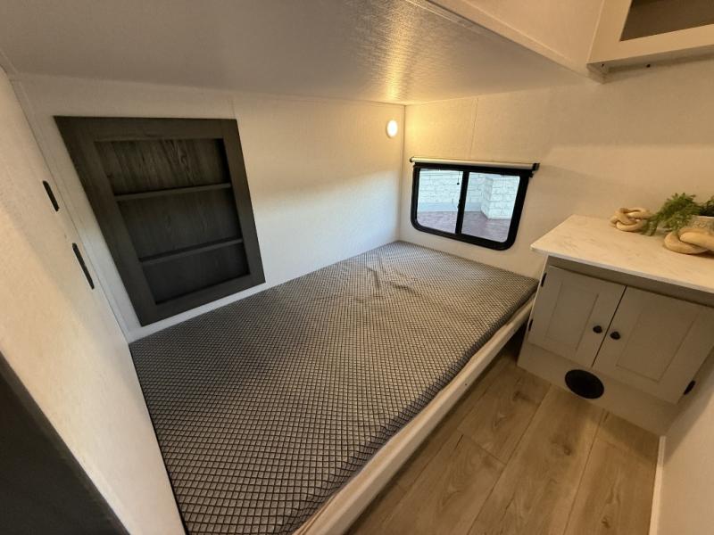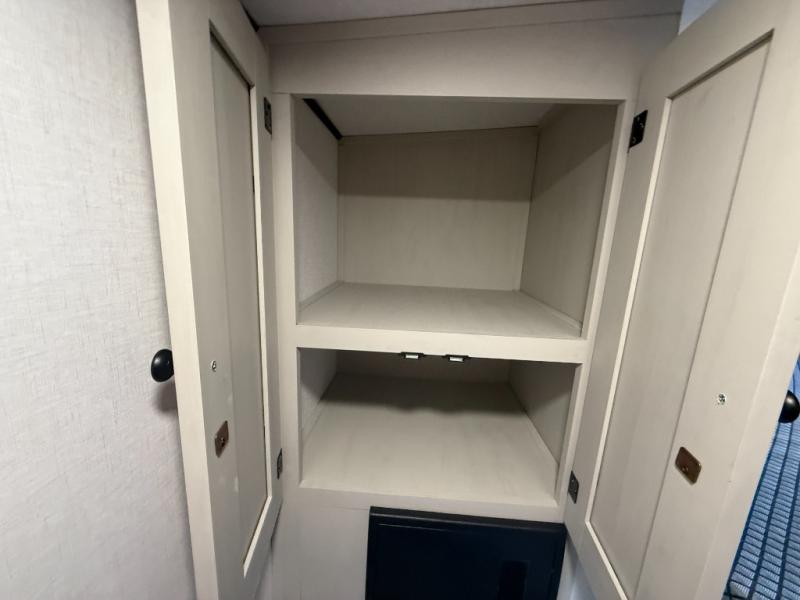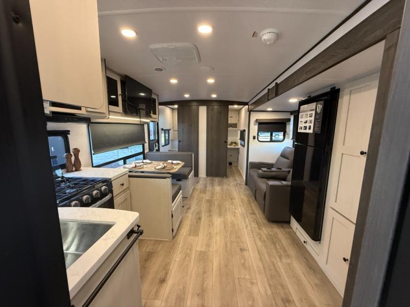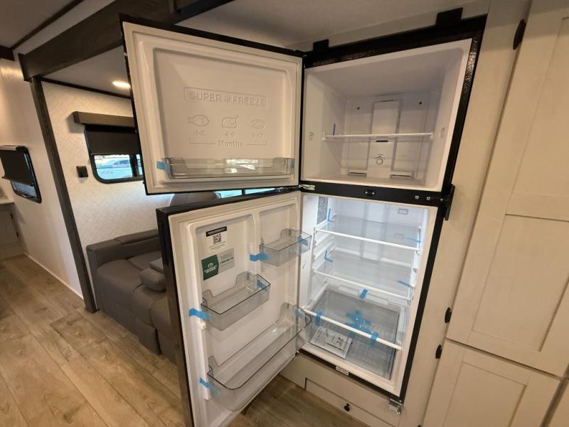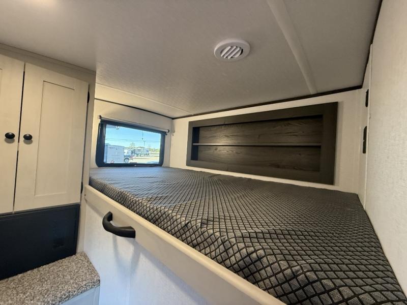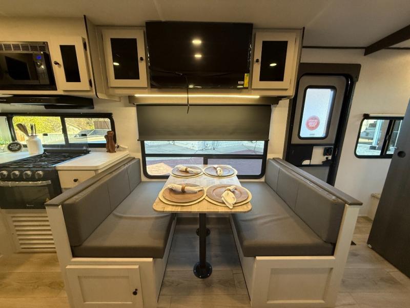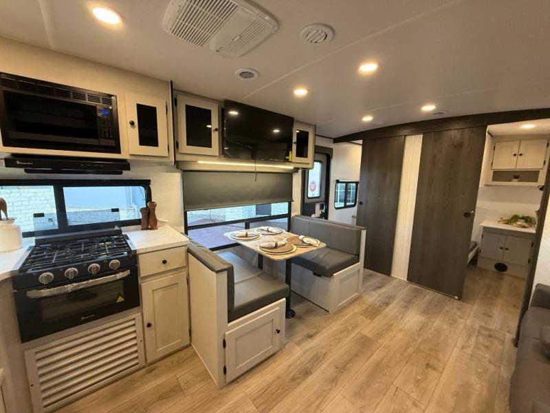 The private upper and lower bunk area provides a cozy sleeping space for kids, complete with plenty of storage for their belongings. The living area features a comfortable 64” sofa and a booth dinette perfect for family meals or game nights. The entertainment center provides endless hours of fun, while the refrigerator and pantry keep snacks and drinks within easy reach. The kitchen is equipped with a three-burner range, perfect for preparing meals for the whole family. The walk-through bathroom features a towel bar and is a practical and convenient space for getting ready in the morning or freshening up at night. Plus, ample storage and a comfortable sleeping area make the front private bedroom the perfect place to rest and relax. The outside kitchen is the perfect spot for outdoor cooking and entertaining, allowing you to enjoy the fresh air and scenery while preparing meals.