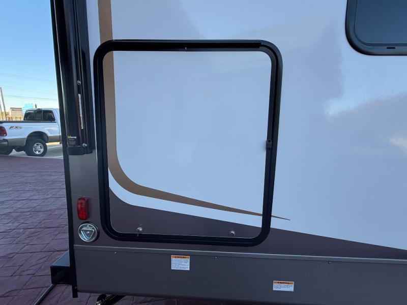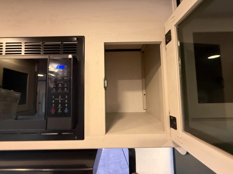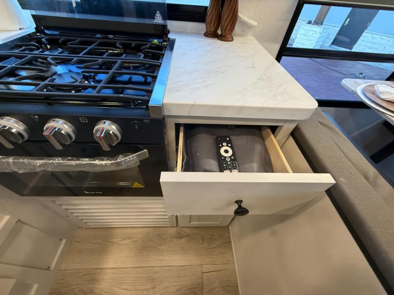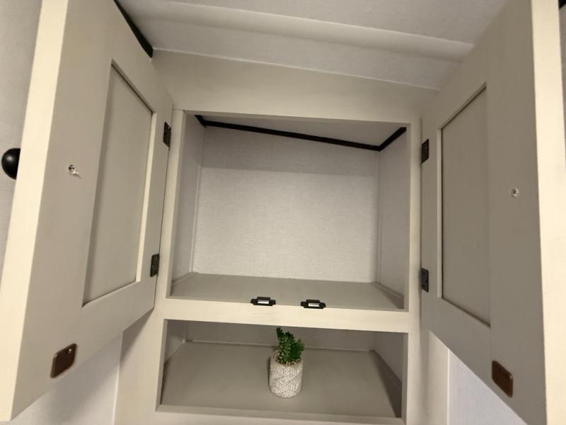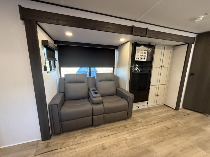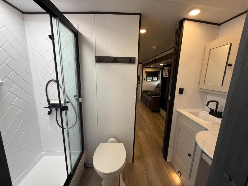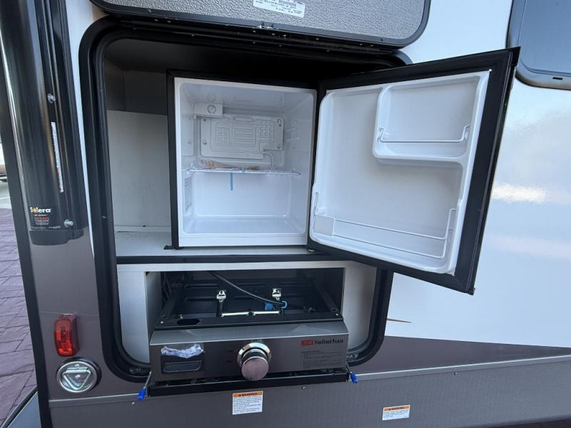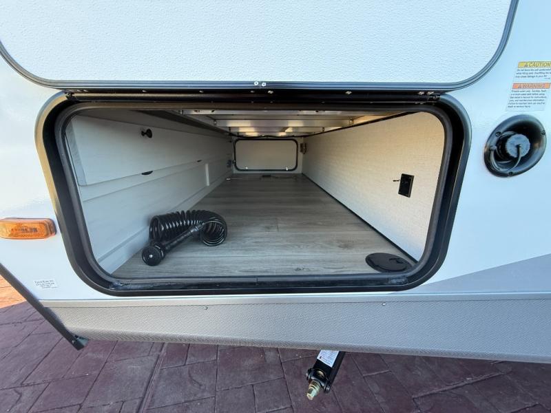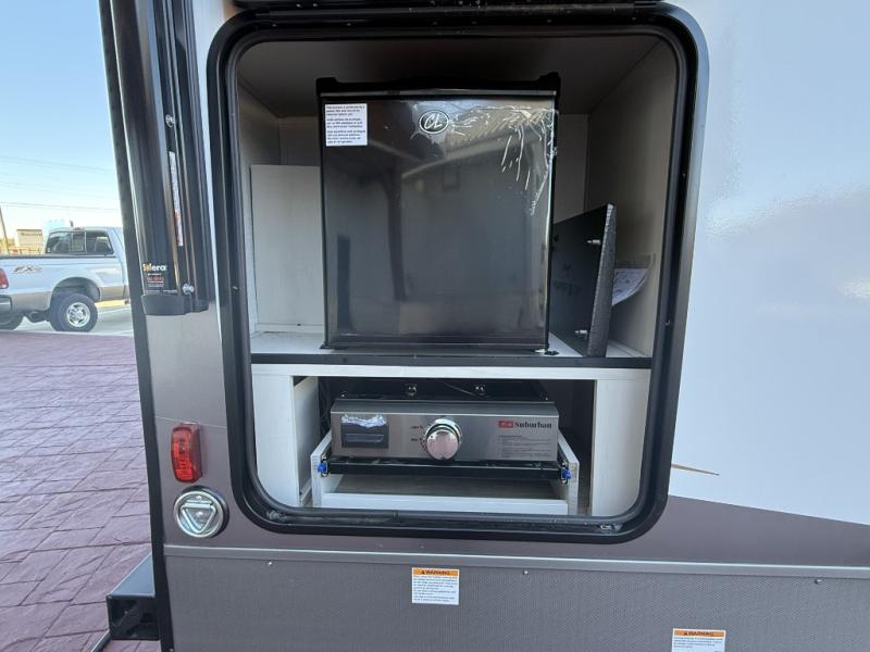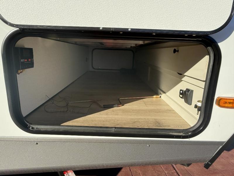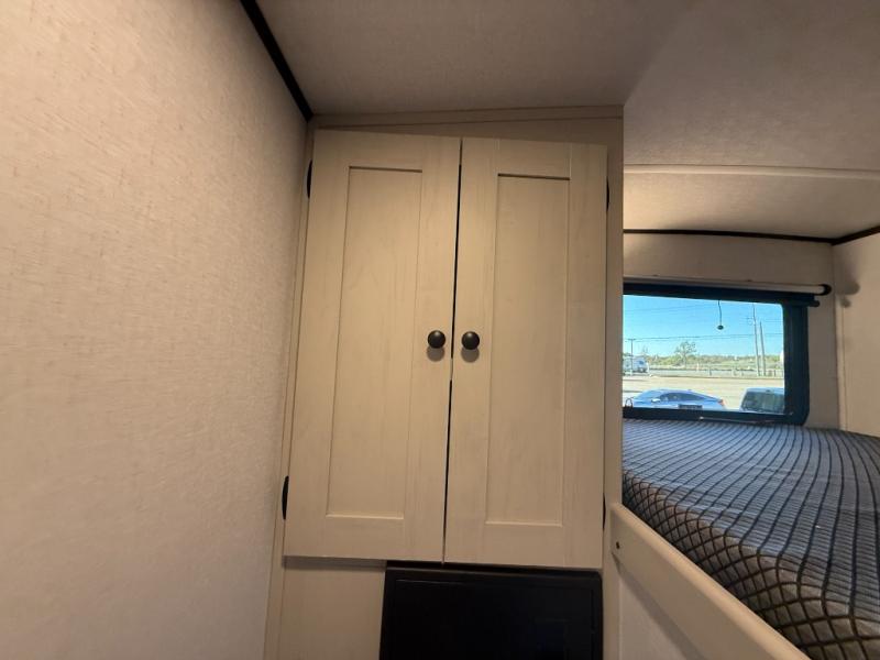 The private upper and lower bunk area provides a cozy sleeping space for kids, complete with plenty of storage for their belongings. The living area features a comfortable 64” sofa and a booth dinette perfect for family meals or game nights. The entertainment center provides endless hours of fun, while the refrigerator and pantry keep snacks and drinks within easy reach. The kitchen is equipped with a three-burner range, perfect for preparing meals for the whole family. The walk-through bathroom features a towel bar and is a practical and convenient space for getting ready in the morning or freshening up at night. Plus, ample storage and a comfortable sleeping area make the front private bedroom the perfect place to rest and relax. The outside kitchen is the perfect spot for outdoor cooking and entertaining, allowing you to enjoy the fresh air and scenery while preparing meals.