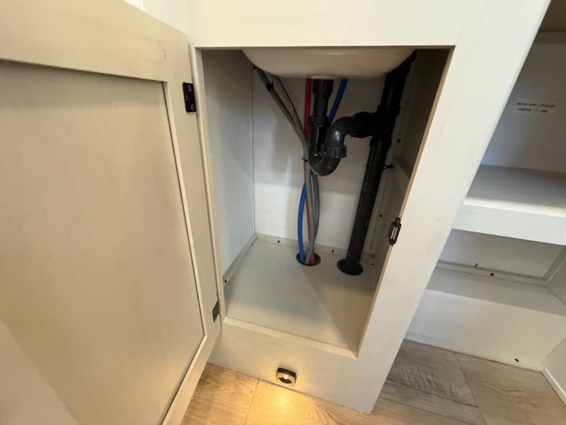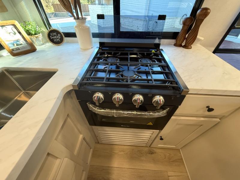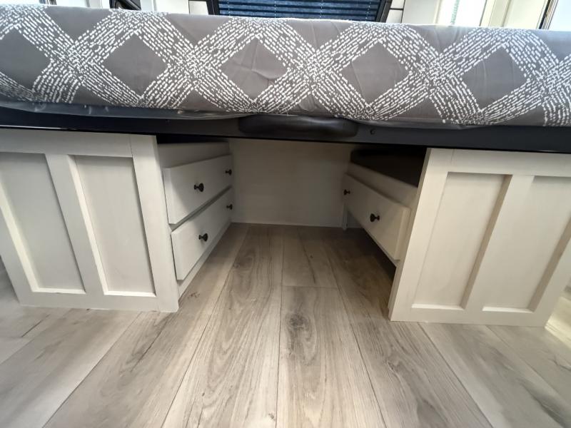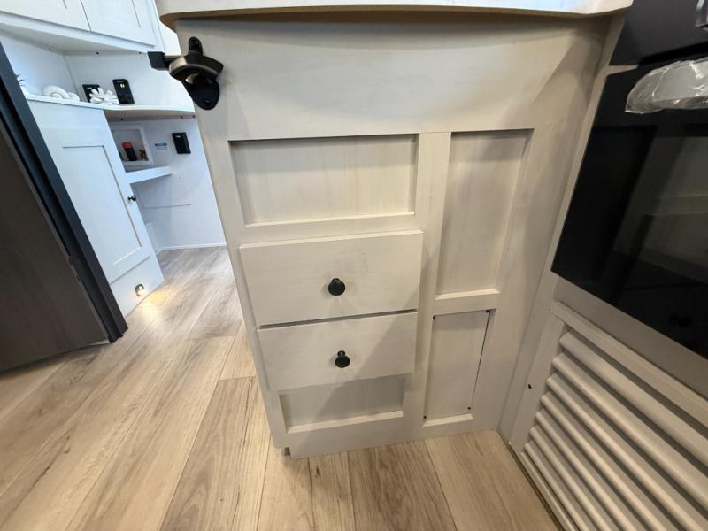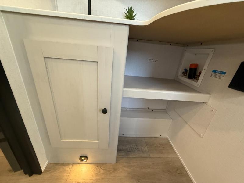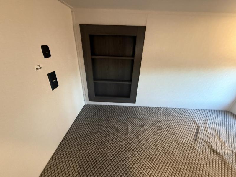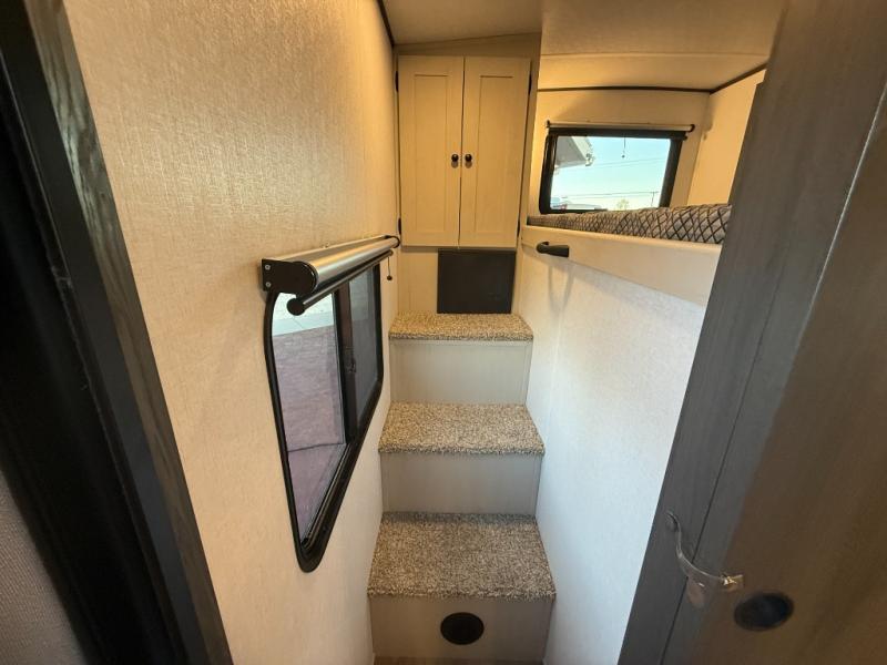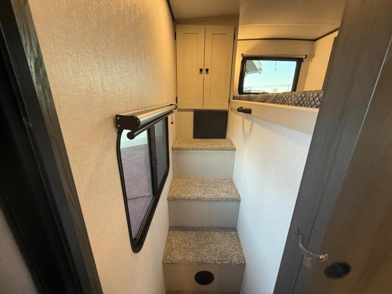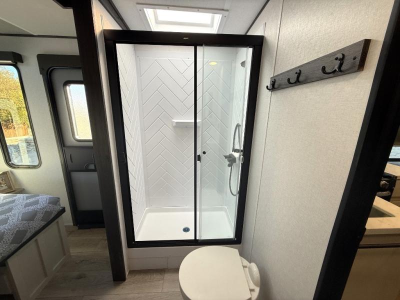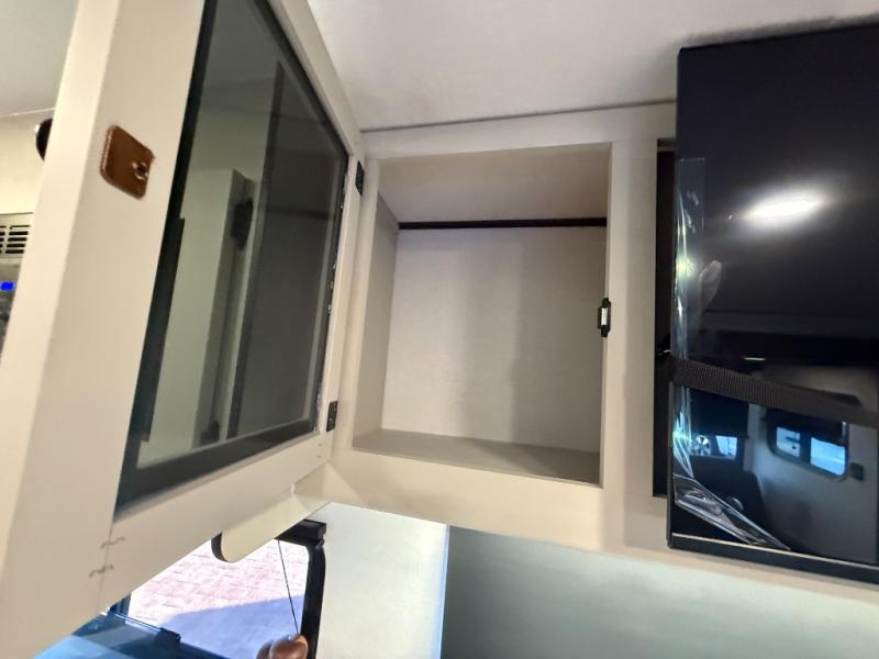 The private upper and lower bunk area provides a cozy sleeping space for kids, complete with plenty of storage for their belongings. The living area features a comfortable 64” sofa and a booth dinette perfect for family meals or game nights. The entertainment center provides endless hours of fun, while the refrigerator and pantry keep snacks and drinks within easy reach. The kitchen is equipped with a three-burner range, perfect for preparing meals for the whole family. The walk-through bathroom features a towel bar and is a practical and convenient space for getting ready in the morning or freshening up at night. Plus, ample storage and a comfortable sleeping area make the front private bedroom the perfect place to rest and relax. The outside kitchen is the perfect spot for outdoor cooking and entertaining, allowing you to enjoy the fresh air and scenery while preparing meals.