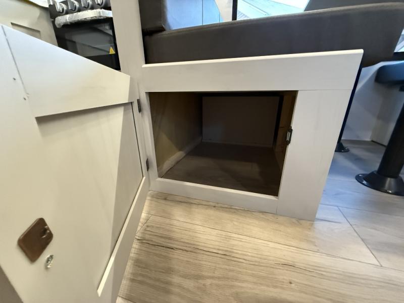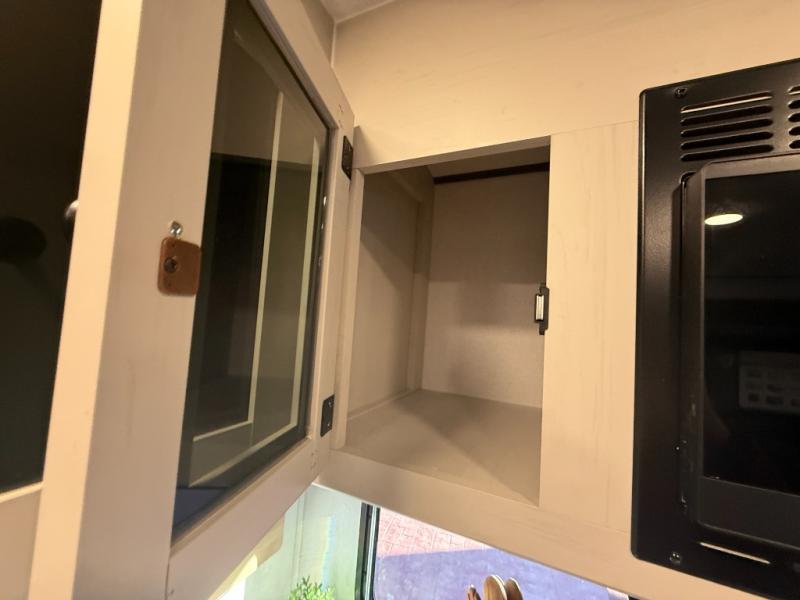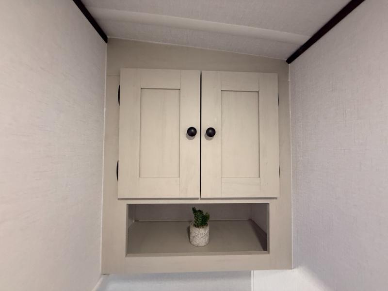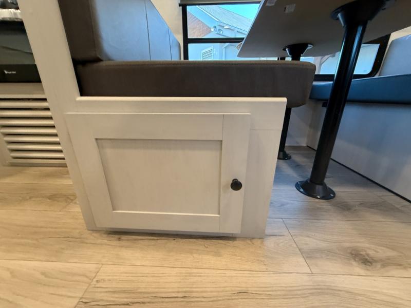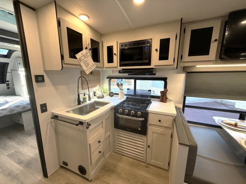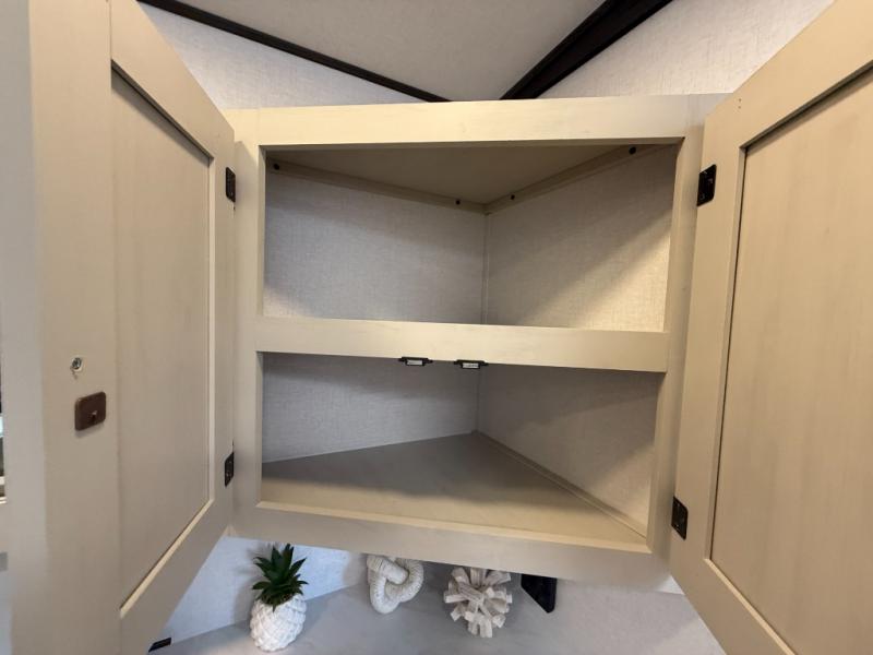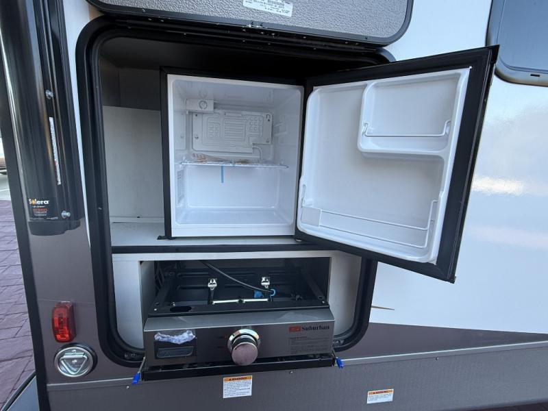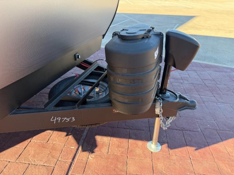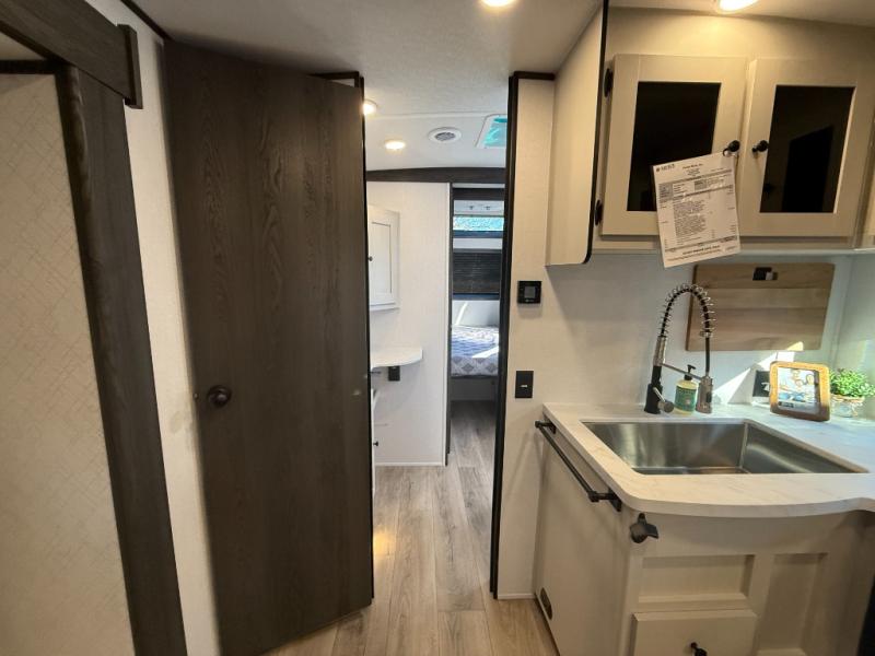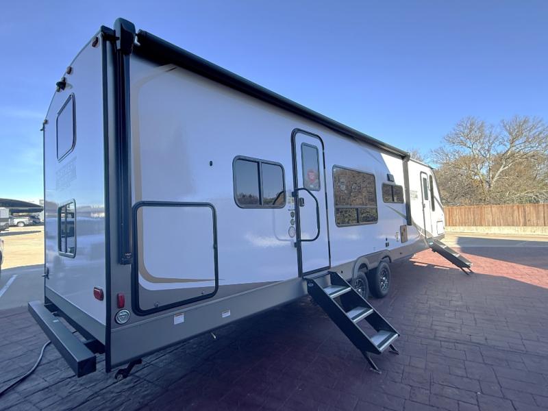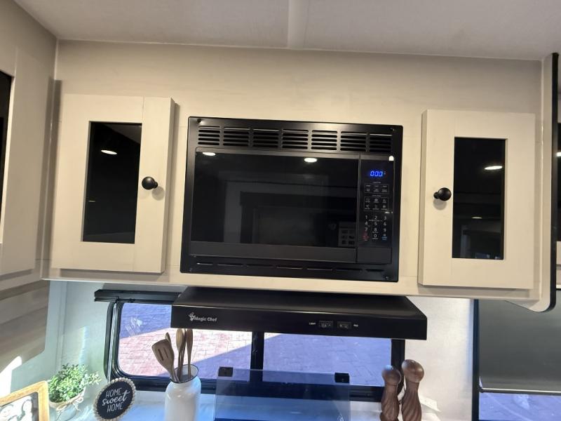 The private upper and lower bunk area provides a cozy sleeping space for kids, complete with plenty of storage for their belongings. The living area features a comfortable 64” sofa and a booth dinette perfect for family meals or game nights. The entertainment center provides endless hours of fun, while the refrigerator and pantry keep snacks and drinks within easy reach. The kitchen is equipped with a three-burner range, perfect for preparing meals for the whole family. The walk-through bathroom features a towel bar and is a practical and convenient space for getting ready in the morning or freshening up at night. Plus, ample storage and a comfortable sleeping area make the front private bedroom the perfect place to rest and relax. The outside kitchen is the perfect spot for outdoor cooking and entertaining, allowing you to enjoy the fresh air and scenery while preparing meals.
