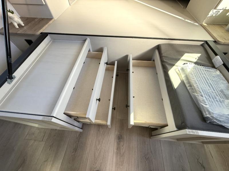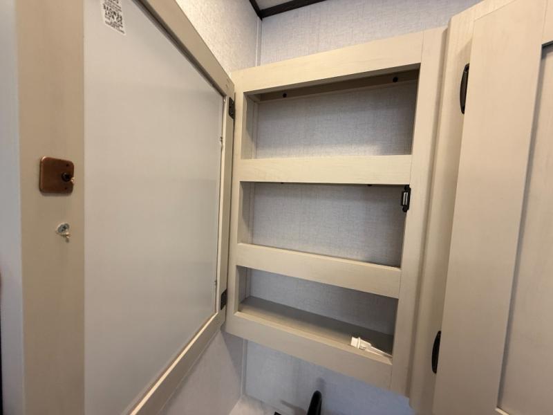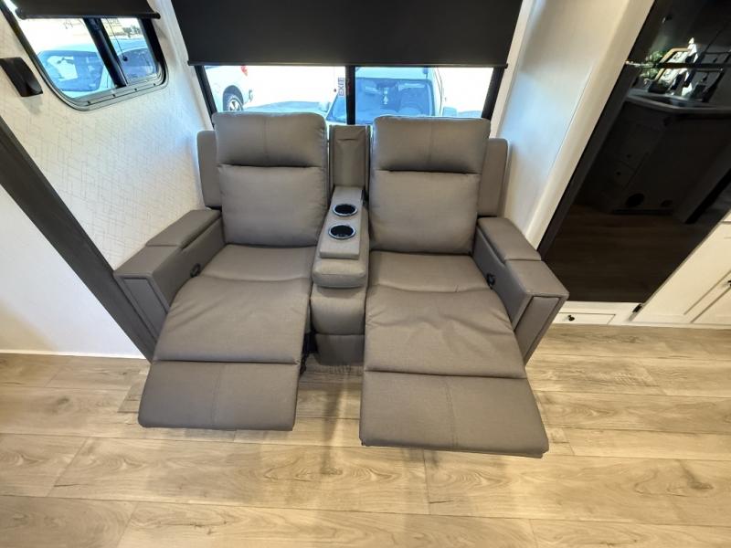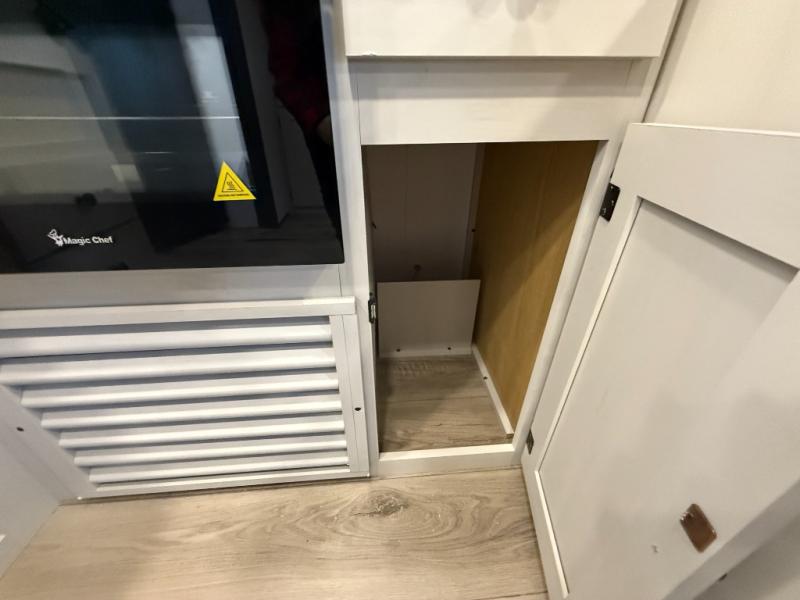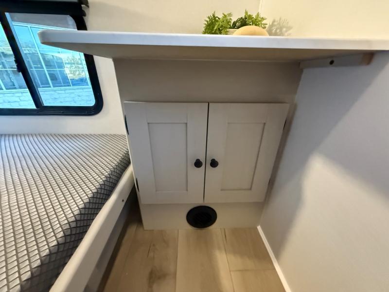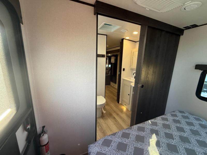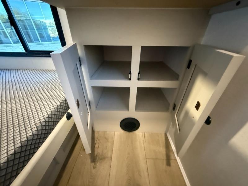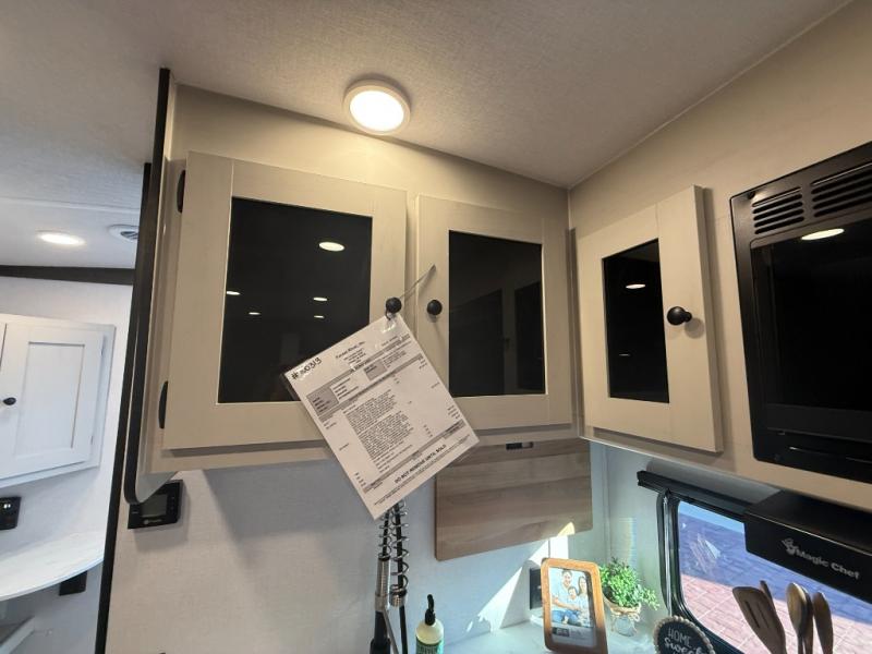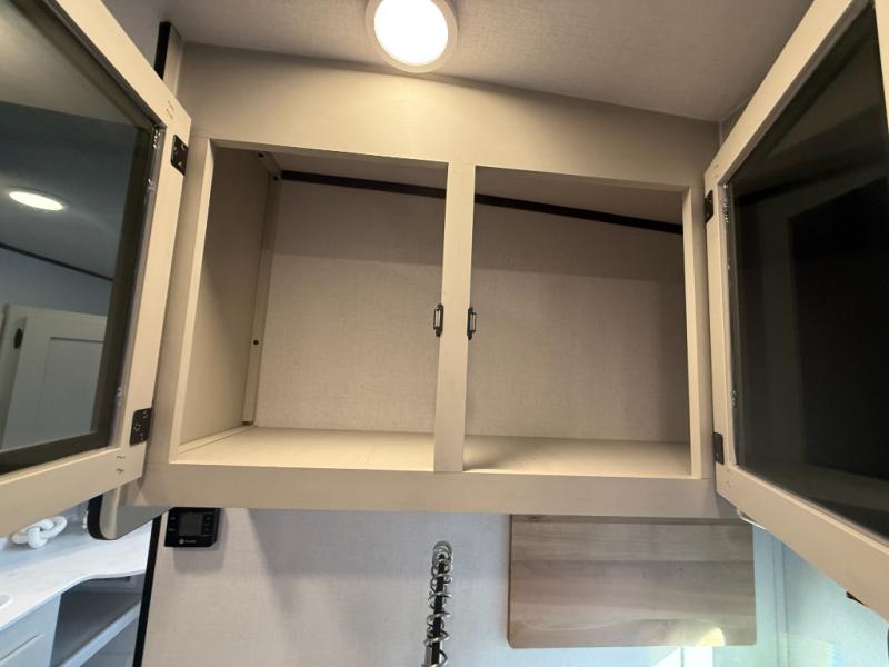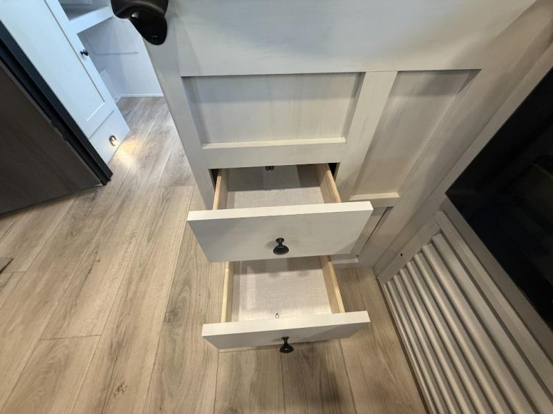 The private upper and lower bunk area provides a cozy sleeping space for kids, complete with plenty of storage for their belongings. The living area features a comfortable 64” sofa and a booth dinette perfect for family meals or game nights. The entertainment center provides endless hours of fun, while the refrigerator and pantry keep snacks and drinks within easy reach. The kitchen is equipped with a three-burner range, perfect for preparing meals for the whole family. The walk-through bathroom features a towel bar and is a practical and convenient space for getting ready in the morning or freshening up at night. Plus, ample storage and a comfortable sleeping area make the front private bedroom the perfect place to rest and relax. The outside kitchen is the perfect spot for outdoor cooking and entertaining, allowing you to enjoy the fresh air and scenery while preparing meals.