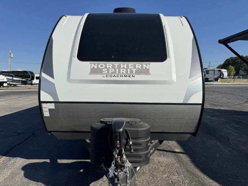 With any Northern Spirit Ultra Lite travel trailer by Coachmen, the "Twice Cool" dual ducted air conditioning system, motion activated floor lights, and the motion activated pass-through storage light plus fishing pole storage, will make your camping experience simplified. The heated and enclosed underbelly provides protection on the road, the 200W solar panel with 30 amp controller provides off-grid camping, and the power tongue jack makes setup easier. Each is built with a front cap with LED strip lights, a laminated, aluminum framed floor, rear wall, and sidewalls, plus a fully walkable roof with seamless Tufflex PVC covering. Make your decision today, and camp with everything in its place!
