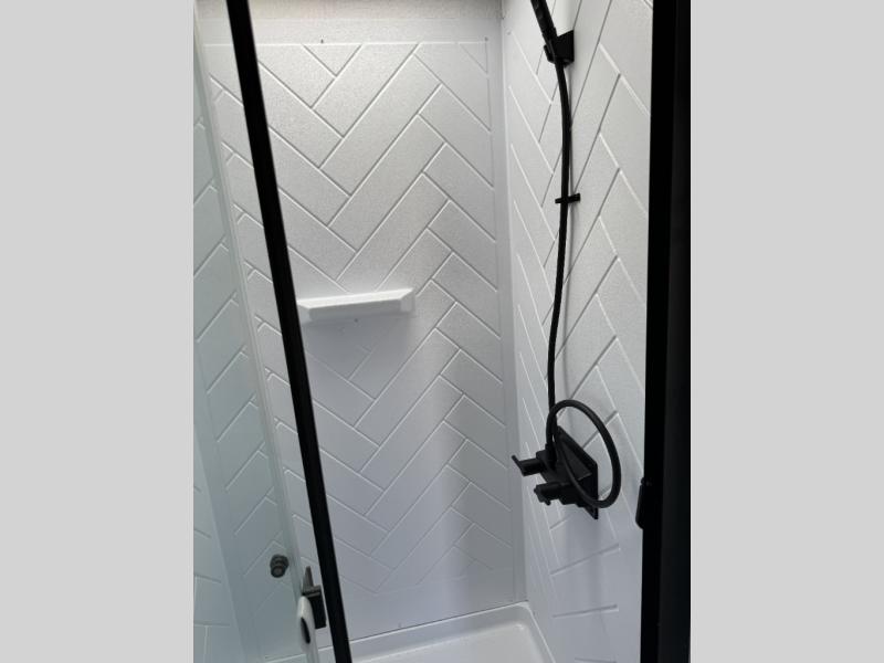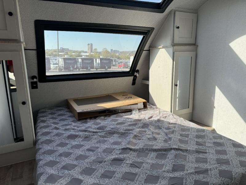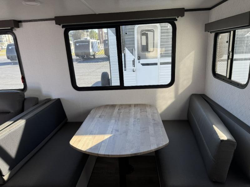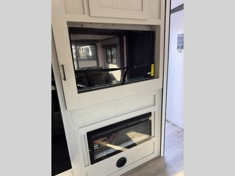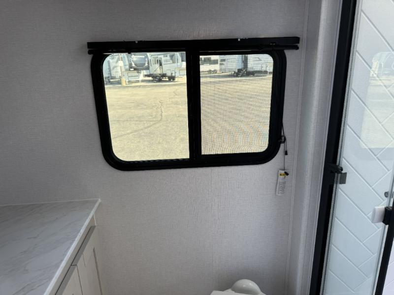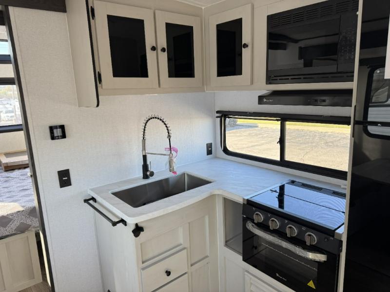 Looking for plenty of storage in your next RV? This trailer has a hidden pantry behind the entertainment center, a closet, overhead cabinets and a pet center for your dog's food and water. You will also find storage in the front bedroom that includes a space savings sliding door for privacy, MAX bed storage underneath with drawers and places for your shoes, plus you will have wardrobes for hanging clothes and nightstands for your cellphone and keys. The rear full bathroom is spacious and includes overhead cabinets, a counter for toiletries and a shower. The cook will love the L-shaped kitchen corner with everything nearby to whip up meals, plus there is a flip-up counter extension. And don't forget about the outside kitchen, 18' awning, and pass-through compartment.