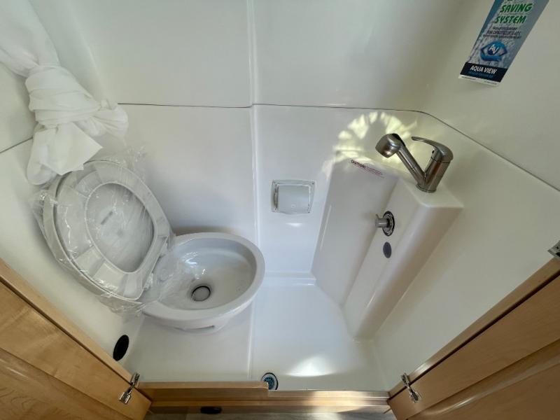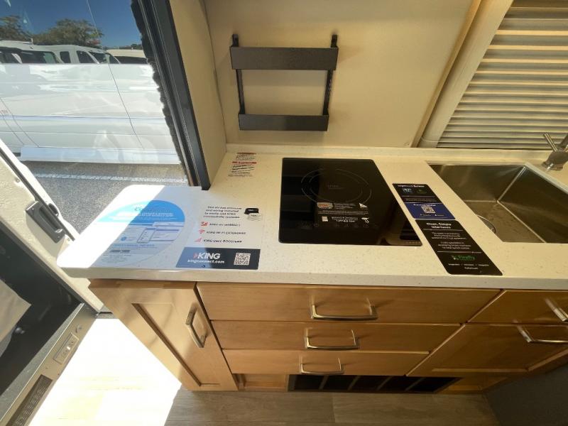 Hit the road and enjoy each journey in this Nova Class B coach. Once you park for the day, you can swivel the captain's seats around and utilize the swivel table. Lunch can be made on the induction cooktop, and the cold ingredients can go back in the 7.3 cu. ft. refrigerator. The convenient wet bath allows you to freshen up after a day exploring, and when you're ready to turn in for the night you can choose from either two 75" x 26" beds, or combine them to create a 75" x 73" bed instead. You will find ample storage in overhead cabinets along each side, beneath the bed, plus there is an extra wardrobe on the roadside as well.