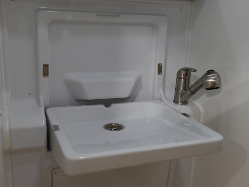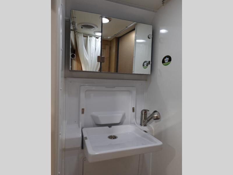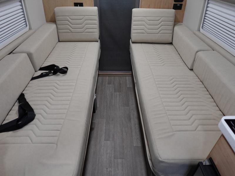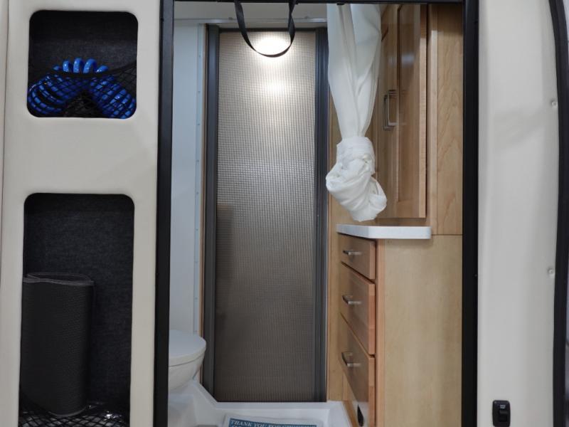 This camper van with a full rear bath will meet your needs surprisingly well. Two twin beds will provide comfortable sleeping space each night, and the swivel table in between the beds will be the perfect place to enjoy breakfast together. There is a bath wardrobe to keep your clothes tidy, plus you'll find overhead cabinets above the beds and additional storage just as you enter the coach for your belongings. This coach also includes swivel captain's seats so you can turn them around for living room seating!