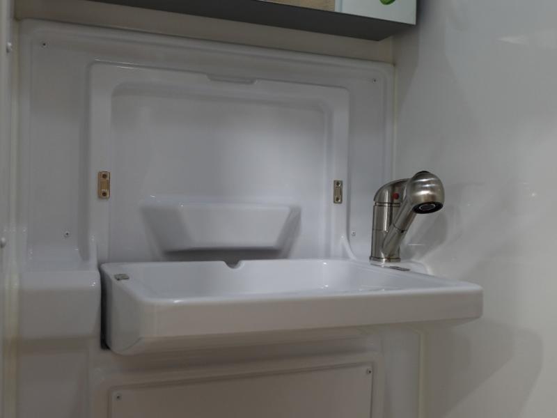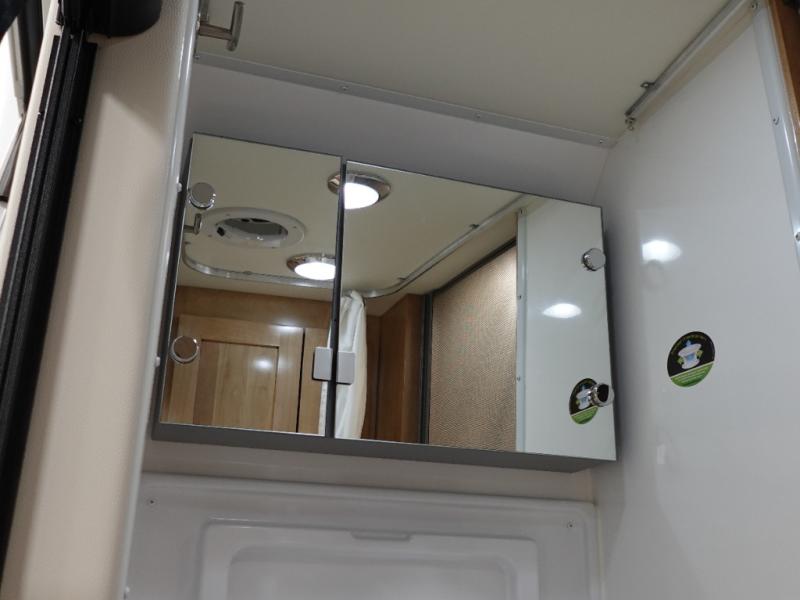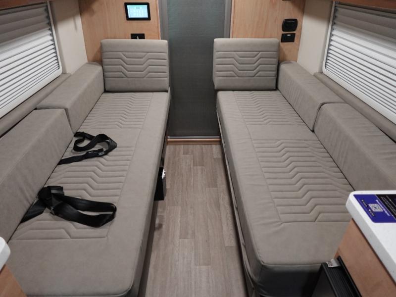 This camper van with a full rear bath will meet your needs surprisingly well. Two twin beds will provide comfortable sleeping space each night, and the swivel table in between the beds will be the perfect place to enjoy breakfast together. There is a bath wardrobe to keep your clothes tidy, plus you'll find overhead cabinets above the beds and additional storage just as you enter the coach for your belongings. This coach also includes swivel captain's seats so you can turn them around for living room seating!