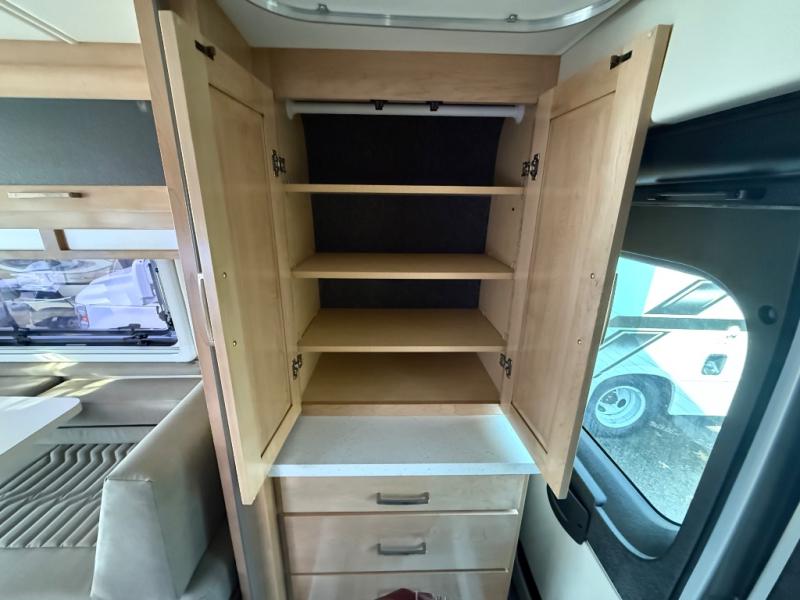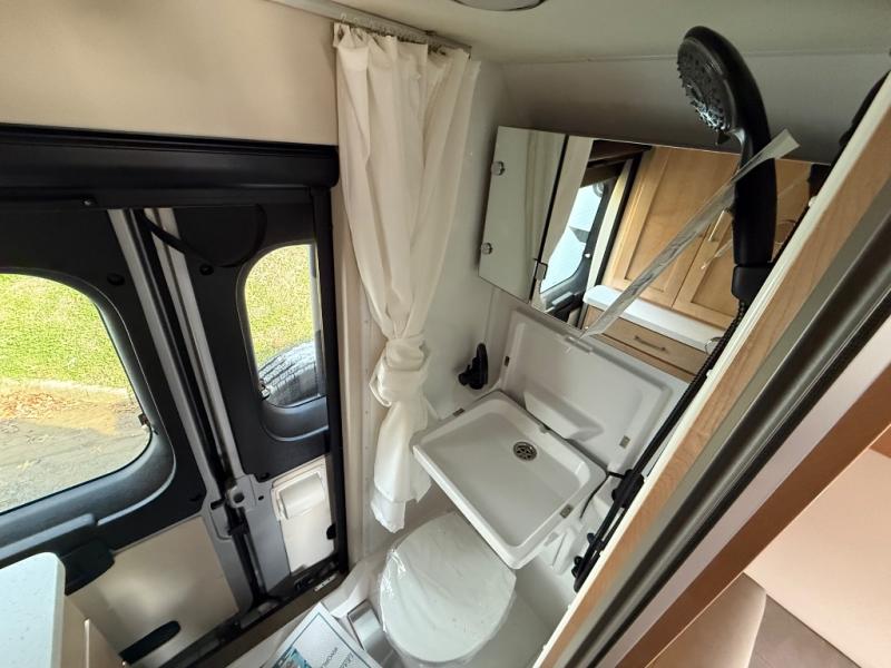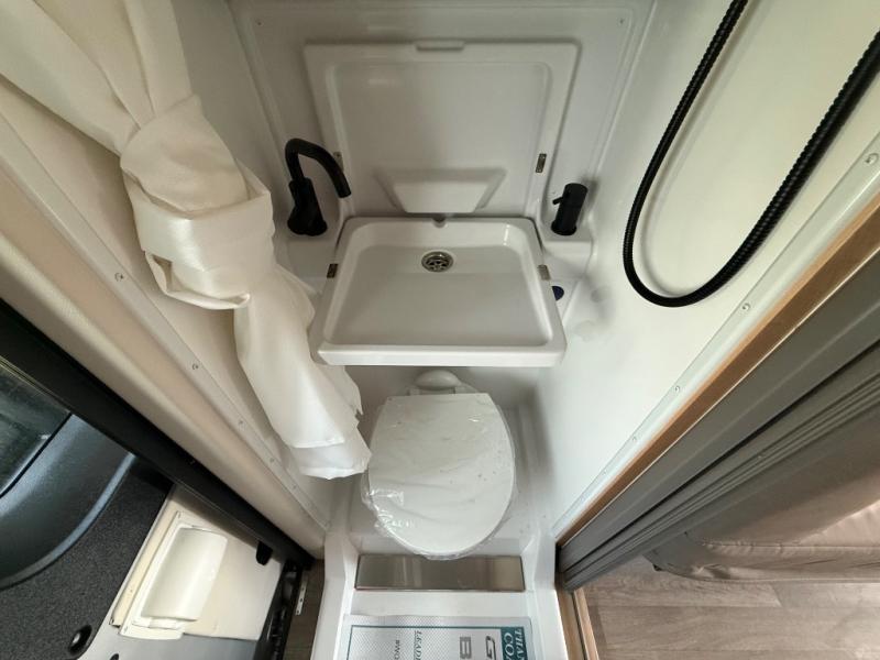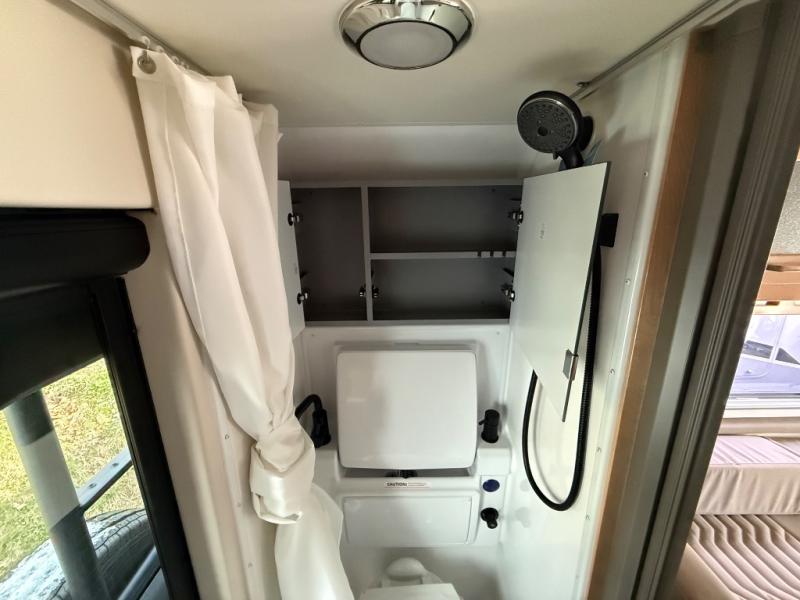 This camper van with a full rear bath will meet your needs surprisingly well. Two twin beds will provide comfortable sleeping space each night, and the swivel table in between the beds will be the perfect place to enjoy breakfast together. There is a bath wardrobe to keep your clothes tidy, plus you'll find overhead cabinets above the beds and additional storage just as you enter the coach for your belongings. This coach also includes swivel captain's seats so you can turn them around for living room seating!