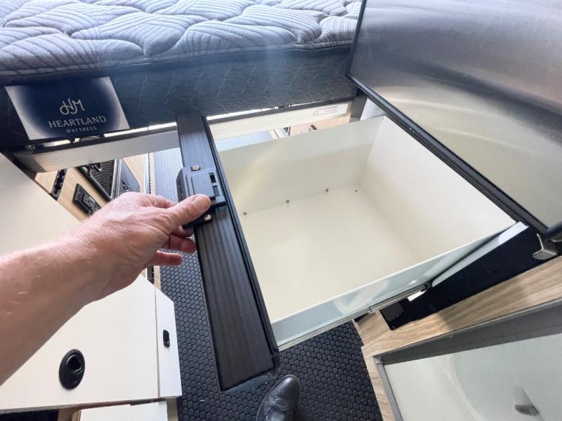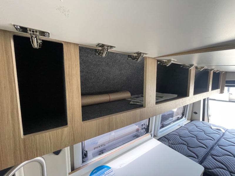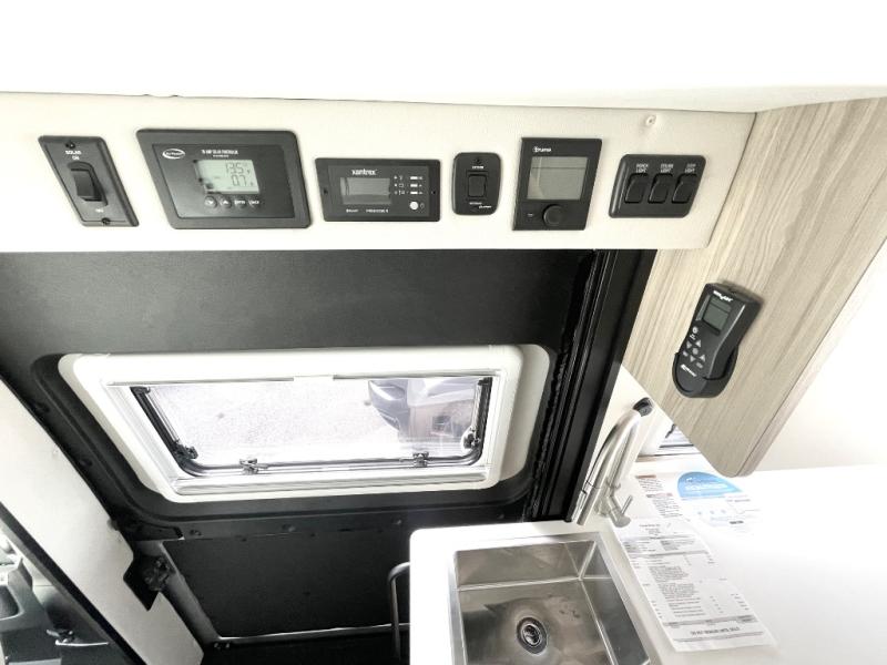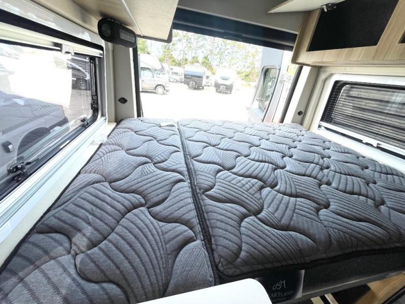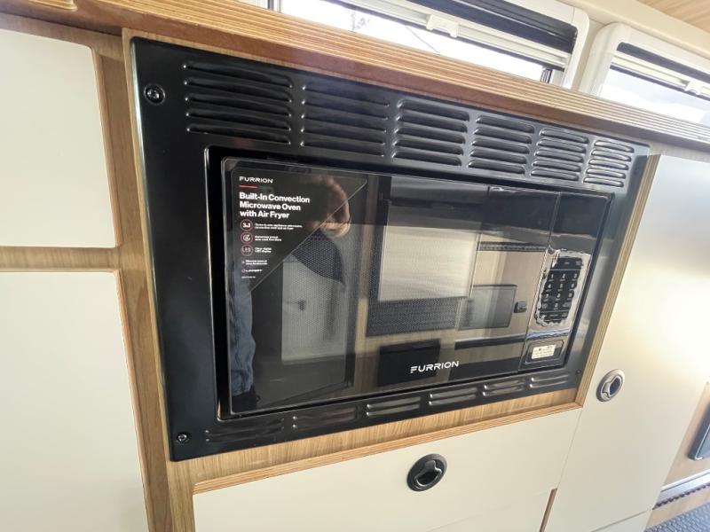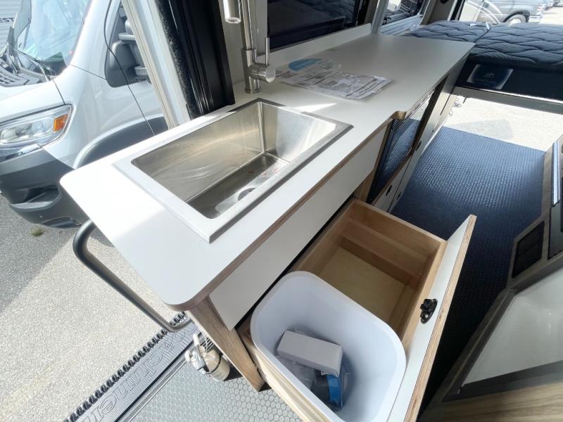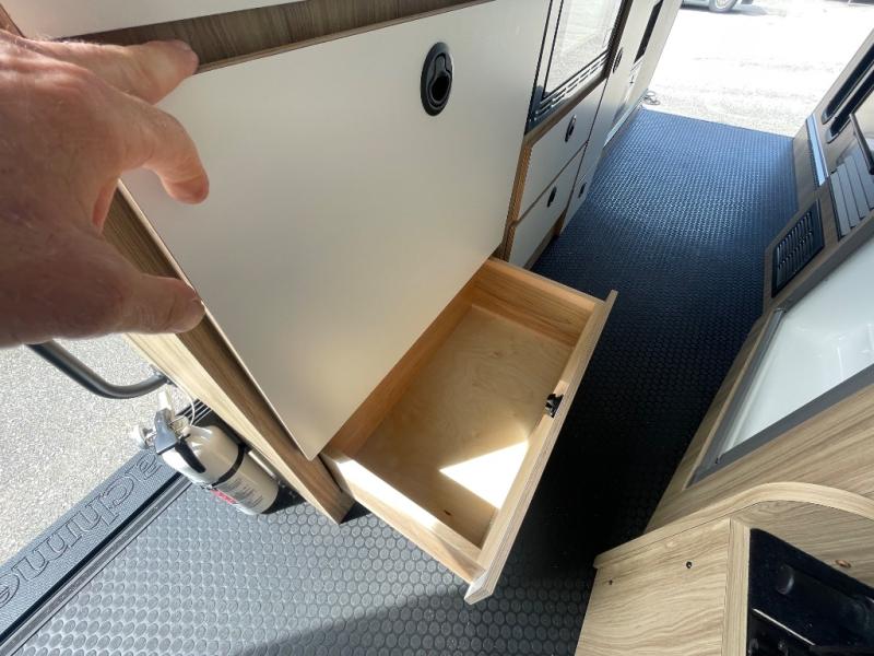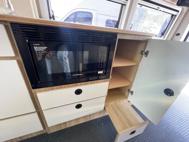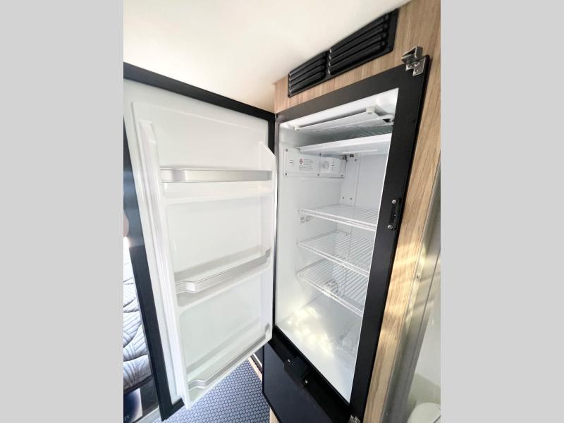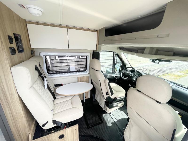 Start a new adventure across the states in this cozy coach! Once you arrive at the campground, you can make lunch on the induction cooktop or in the air fryer/convection microwave. There is also a 7.3 cu. ft. refrigerator with a pull-out freezer drawer to keep your food fresh. You'll find multiple overhead cabinets to keep your belongings tucked out of the way, and the compact wet bath will let you freshen up after a day outdoors. Up front, you'll find two captains seats plus two additional cab seats with a removable table and storage boxes. The 56" x 77" Murphy bed provides versatile sleeping space when you're ready to get some shut-eye. If you're needing additional sleeping space, you can choose the optional pop-top. When the optional pop-top is chosen, the standard Truma A/C is changed out for a Coleman Mach 10 A/C; see dealer for more details.