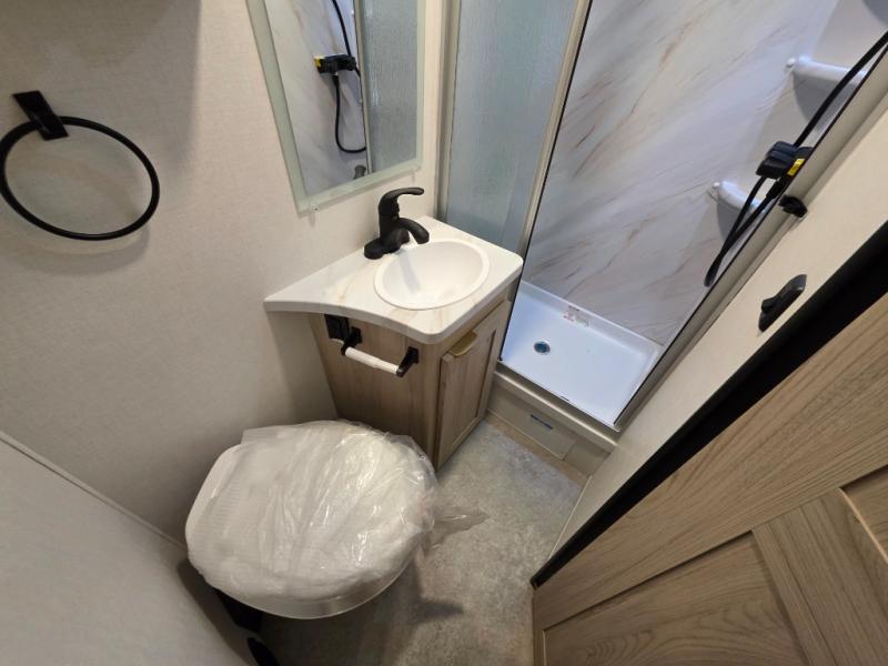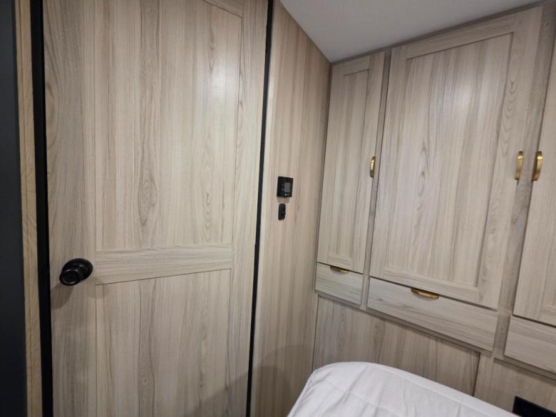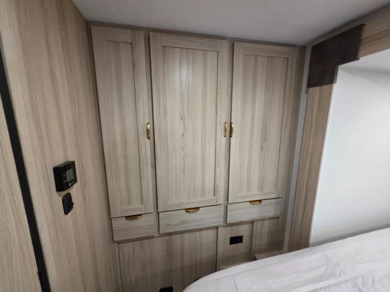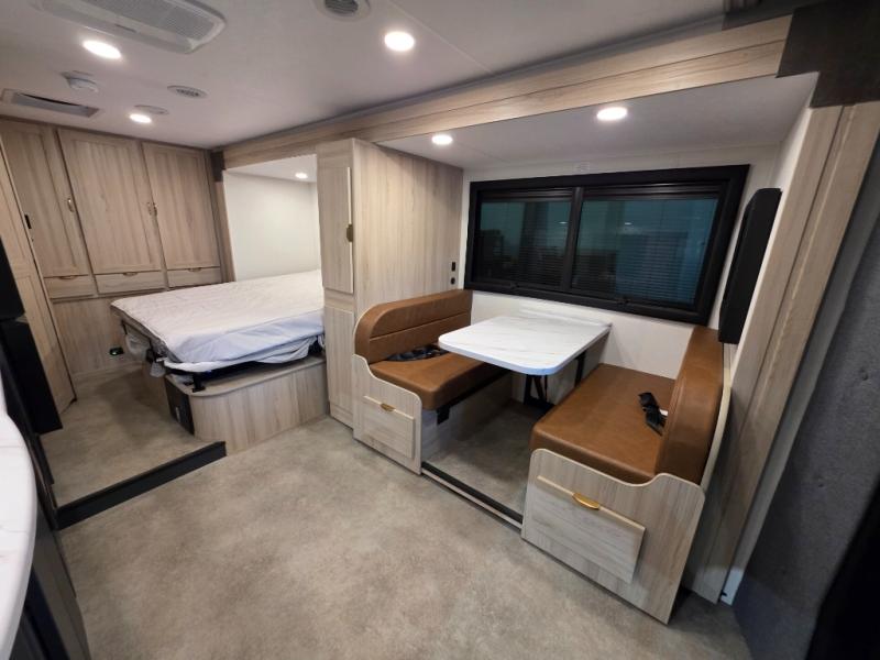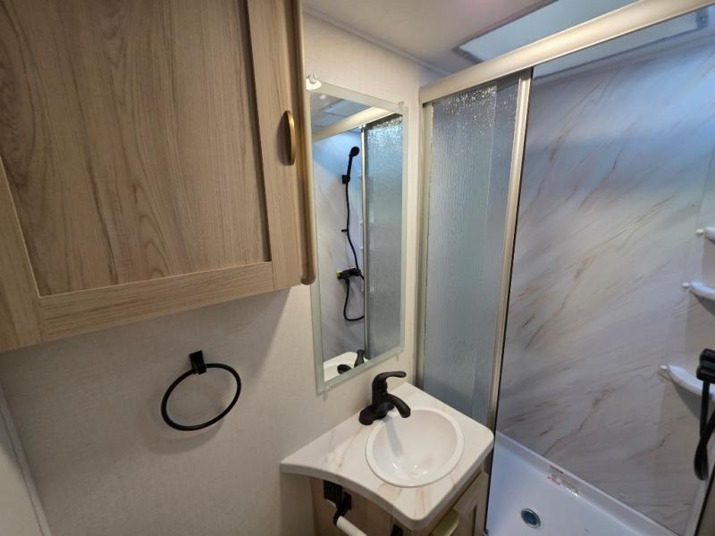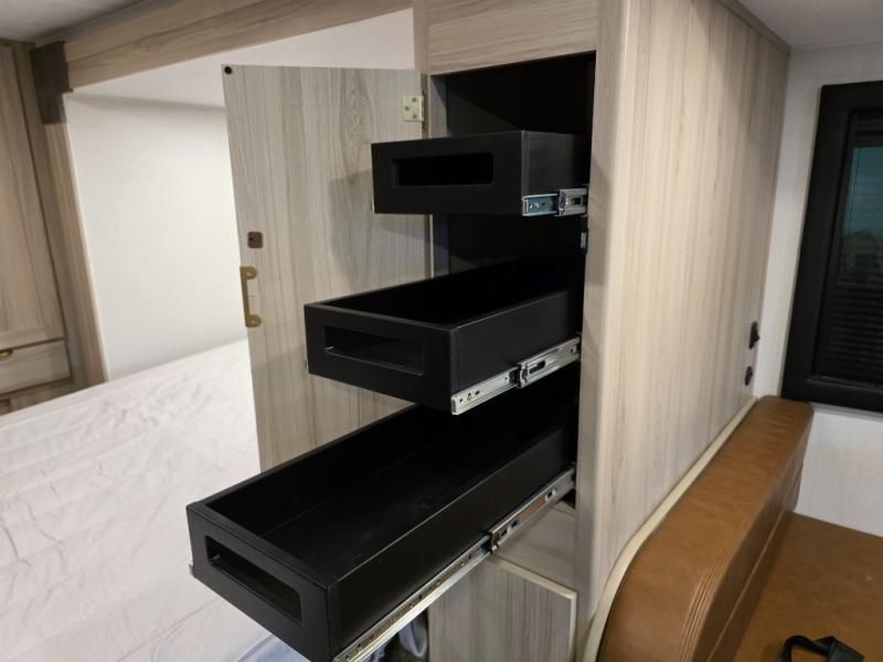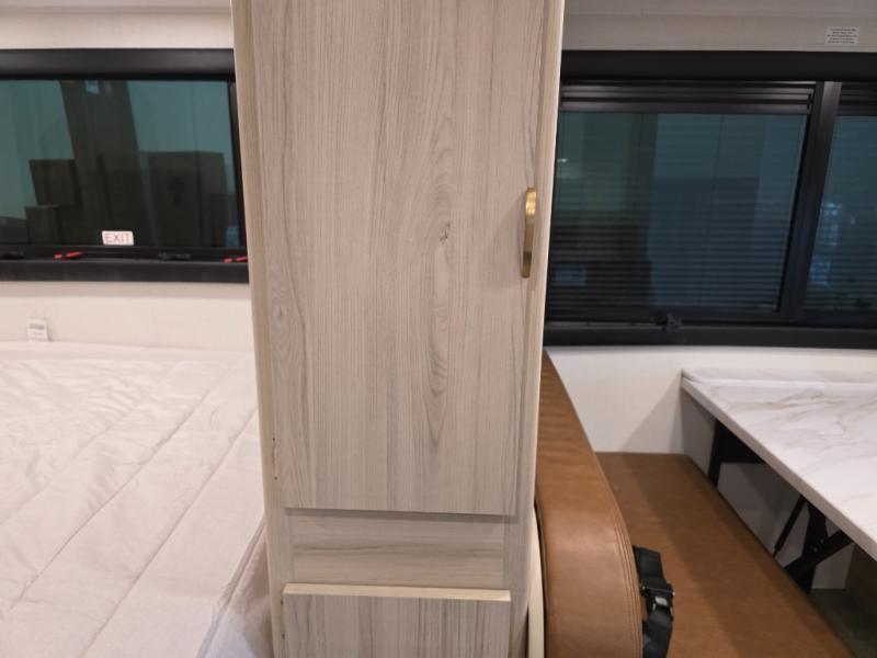 After enjoying the ride, you will love the destination while you relax inside at the booth dinette or optional recliners in this coach. The front 45" x 76" bunk over cab provides sleeping or storage space, and the full galley kitchen allows you to make warm meals and store leftovers. You will also have overhead cabinets to stow away your dishes and dry goods. There is an RV queen bed, a nightstand, and a large back wall wardrobe and linen storage. And the full bathroom in the rear corner of this coach will let you freshen up each day