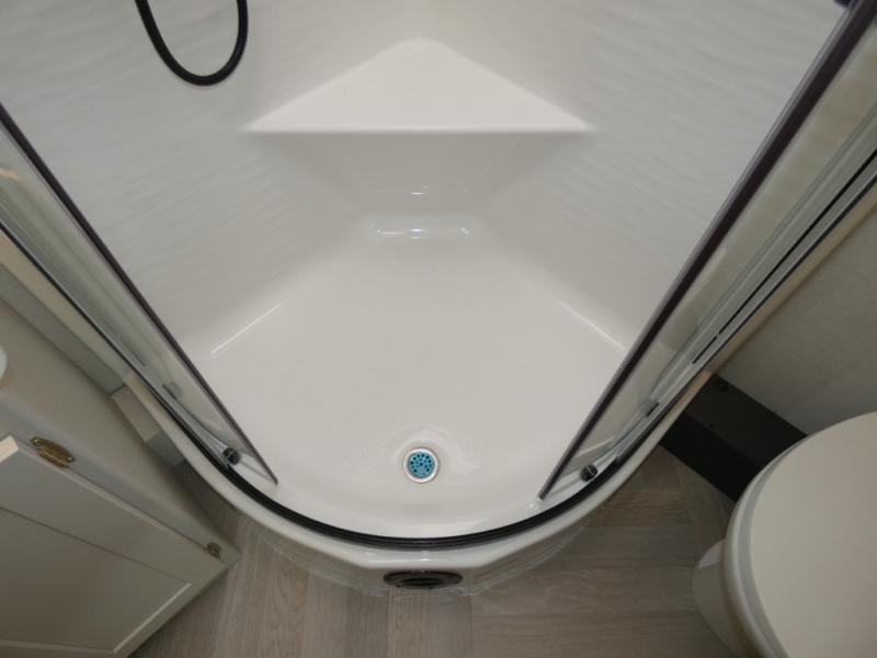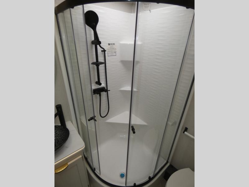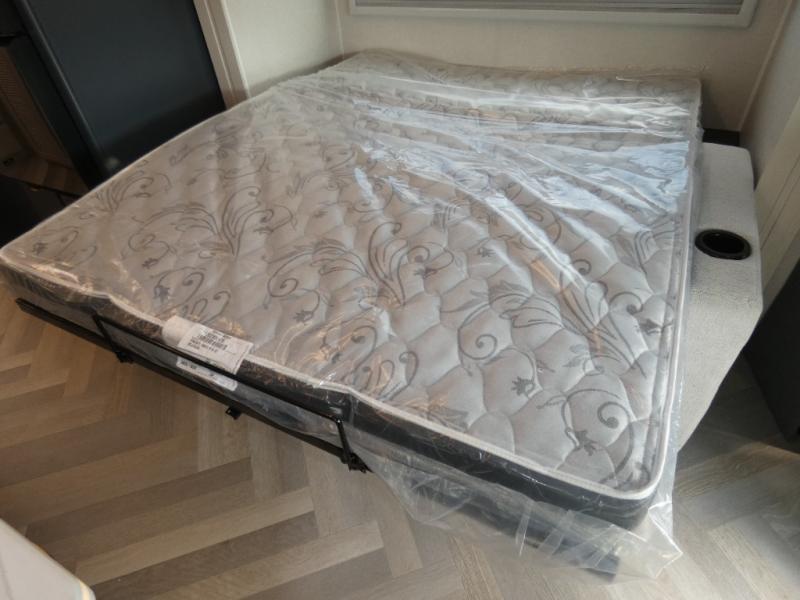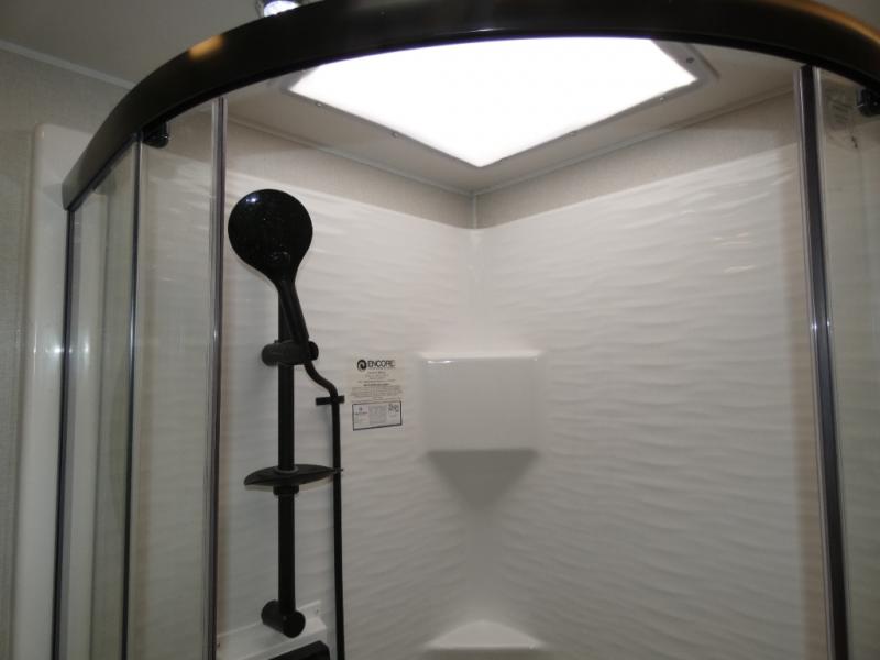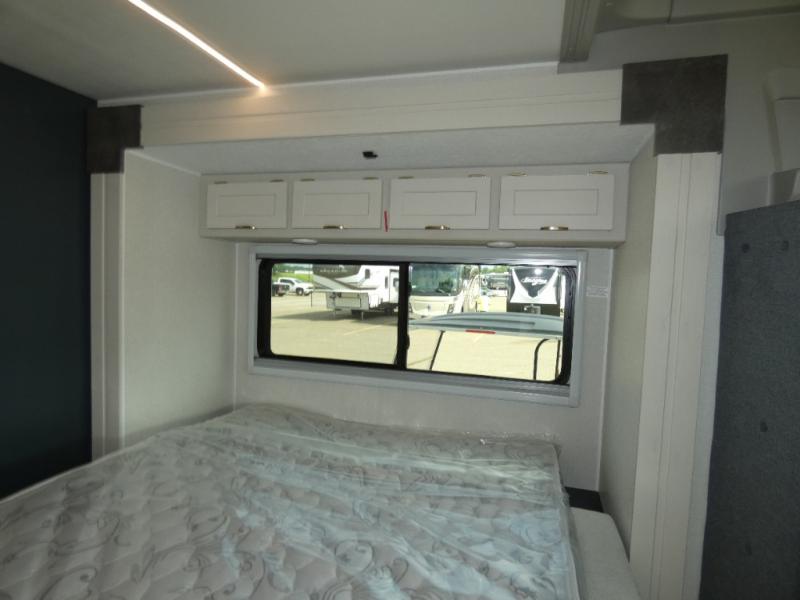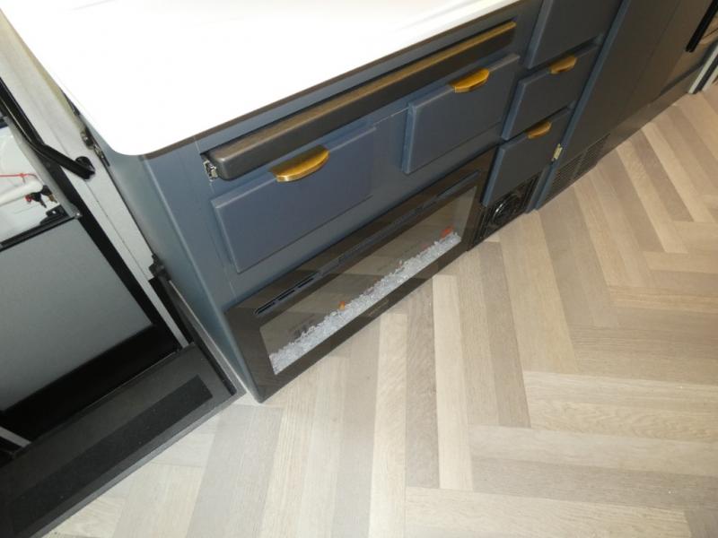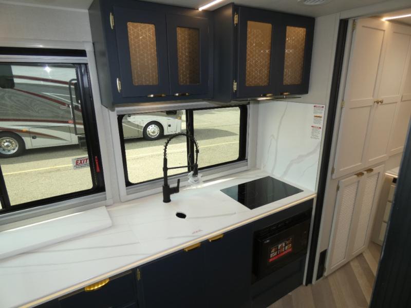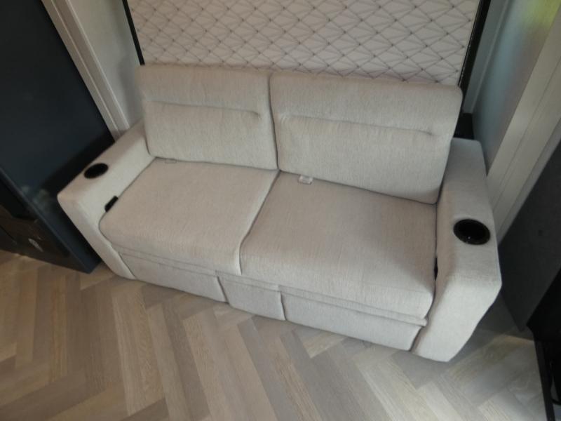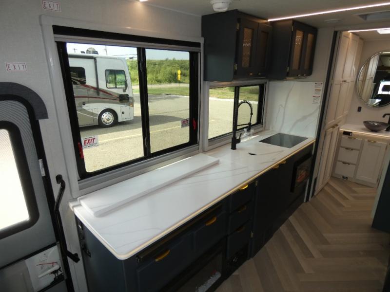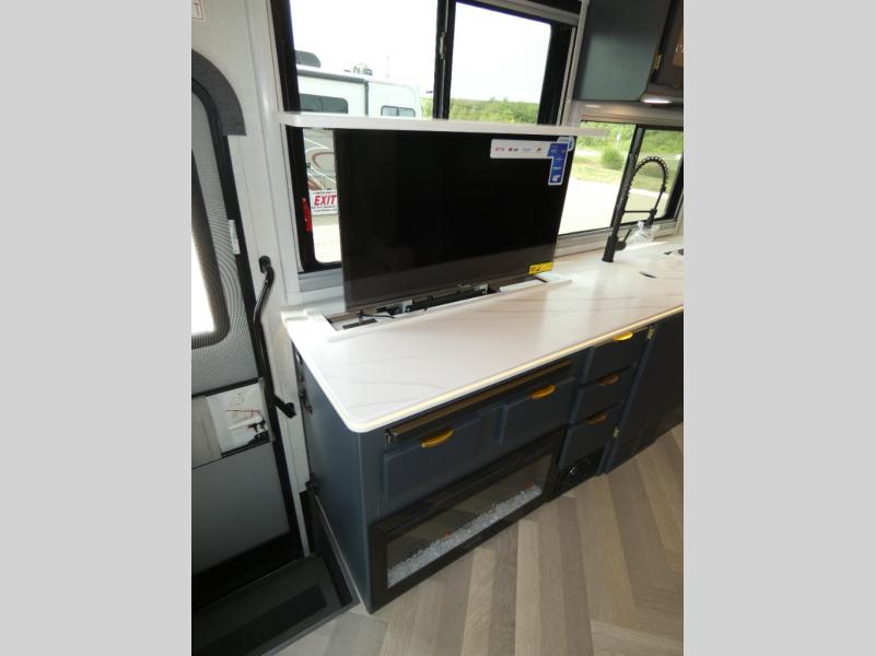 You will enjoy the versatility that this Murphy bed model provides. Depending on whether it is daytime or evening will determine if you have a 60" x 74" Murphy bed that slides out or a 62" sofa to enjoy. There is a 45" x 76" bunk over cab that can be used for added sleeping for two more guests, or to be used as added storage space. The rear full bath is spacious and private and includes a 35" x 35" angled shower, toilet, vanity with sink, plus linen cabinet, and wardrobe. The kitchen features everything needed to create meals while on the go, and a cozy fireplace is included beneath the coach TV for your enjoyment.