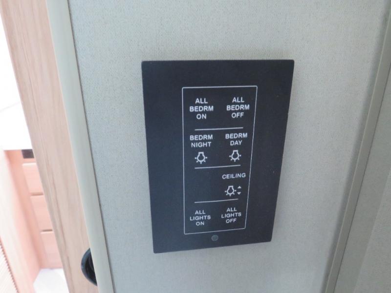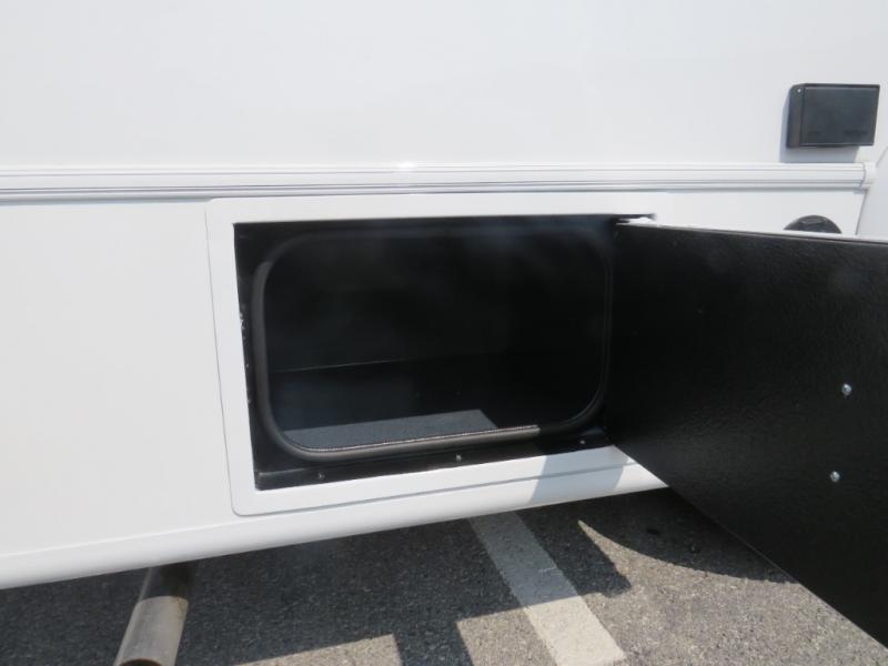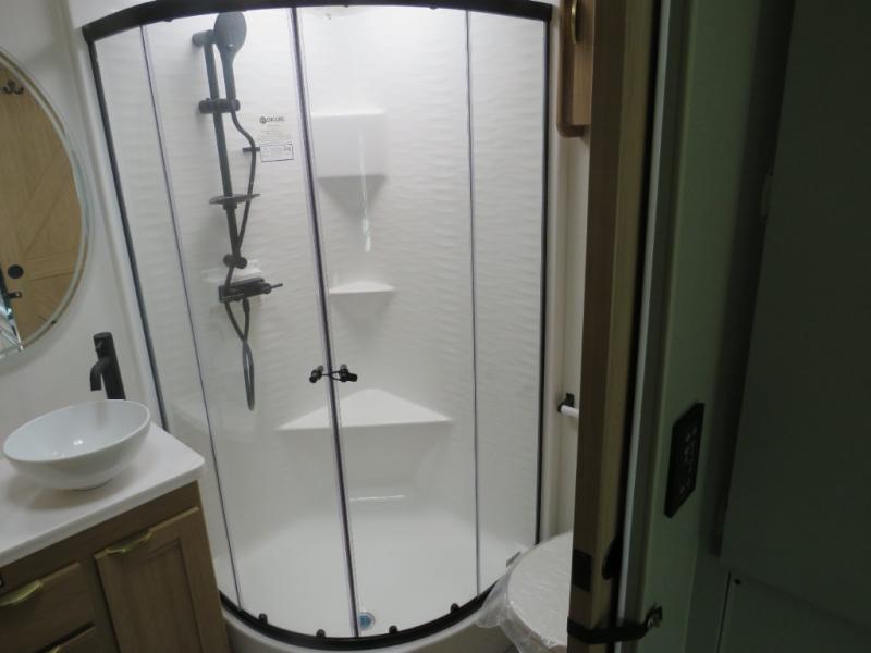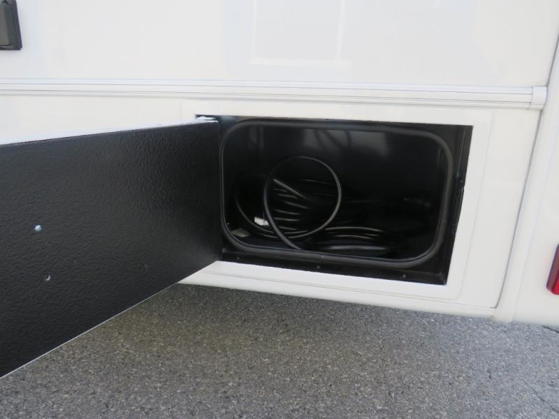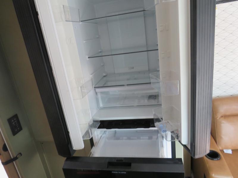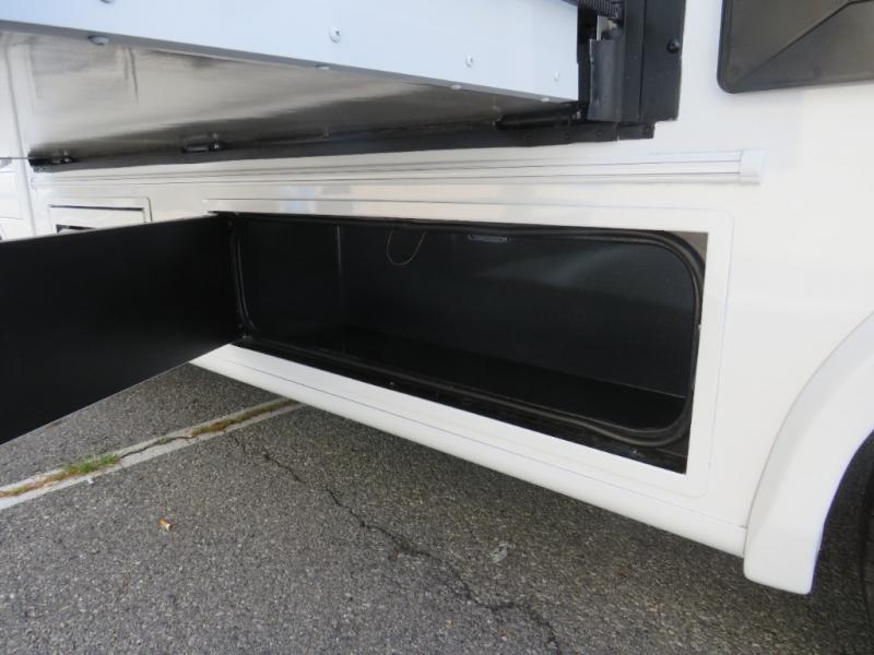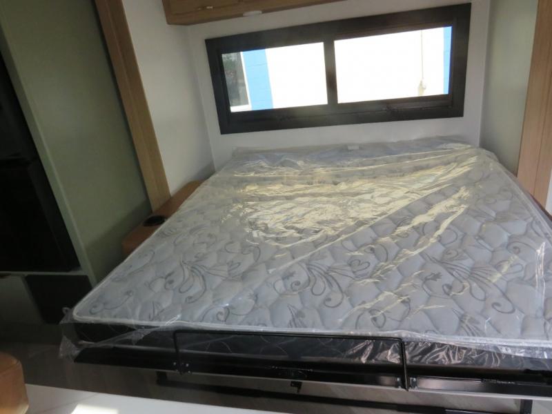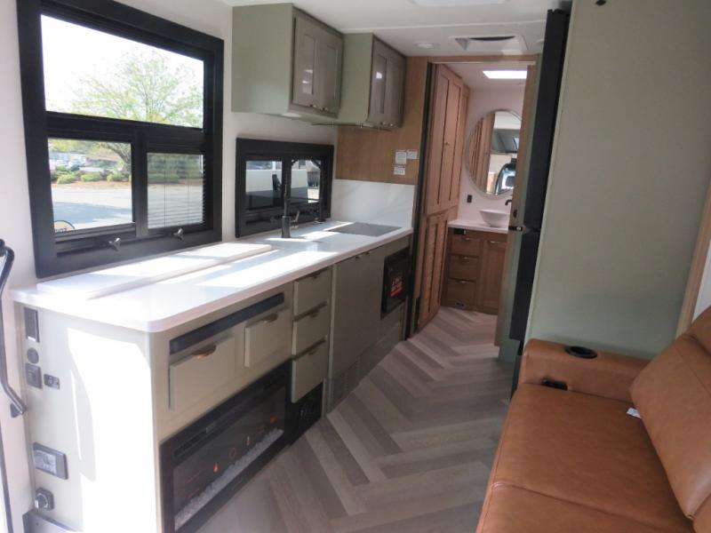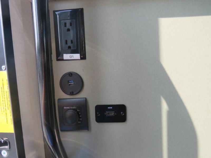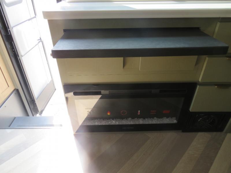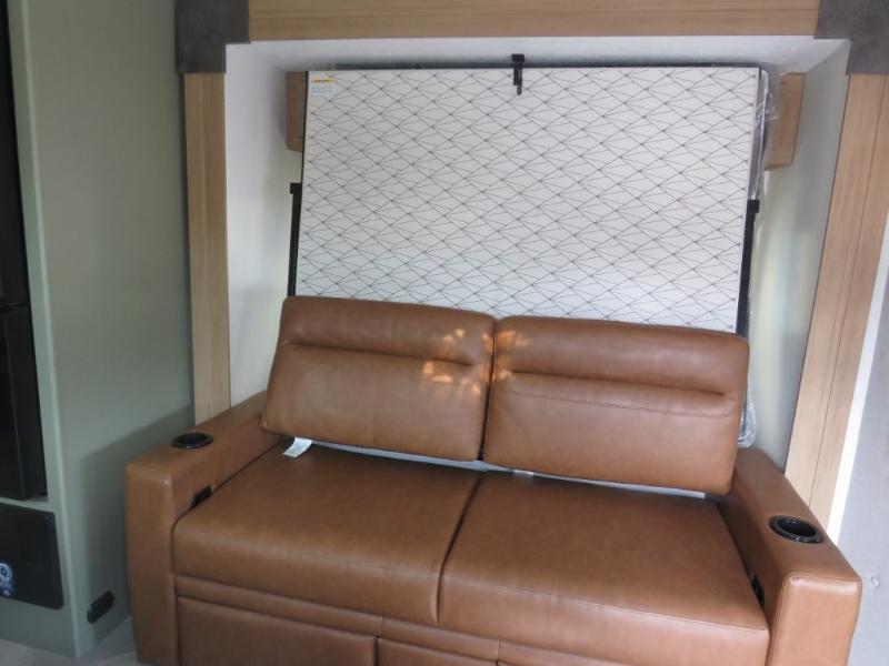 You will enjoy the versatility that this Murphy bed model provides. Depending on whether it is daytime or evening will determine if you have a 60" x 74" Murphy bed that slides out or a 62" sofa to enjoy. There is a 45" x 76" bunk over cab that can be used for added sleeping for two more guests, or to be used as added storage space. The rear full bath is spacious and private and includes a 35" x 35" angled shower, toilet, vanity with sink, plus linen cabinet, and wardrobe. The kitchen features everything needed to create meals while on the go, and a cozy fireplace is included beneath the coach TV for your enjoyment.