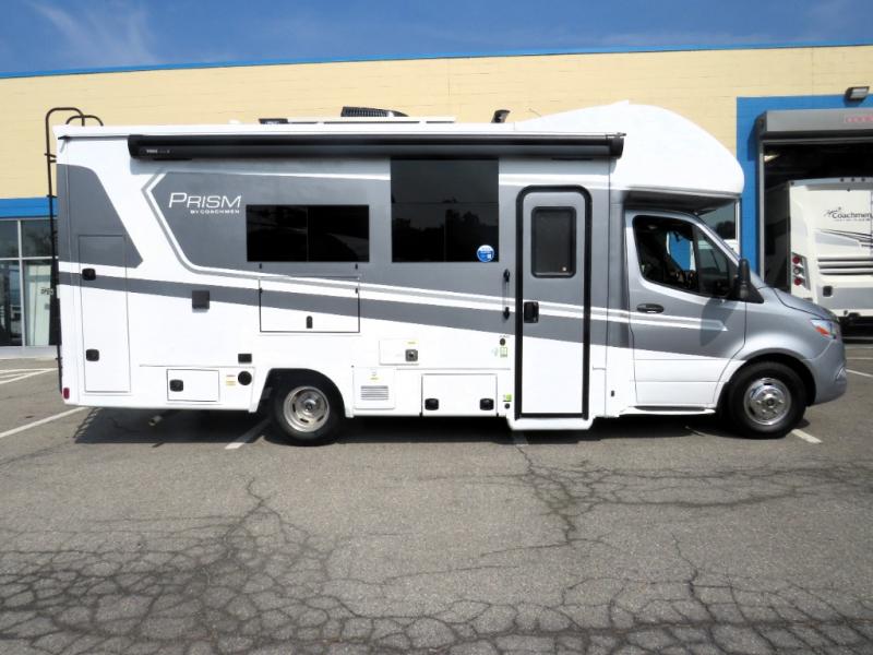 With any of the Prism Elite Class C diesel motorhomes, the Coachmen legacy of upscale luxury with Mercedes-Benz drivability is found throughout. With the aerodynamic and stylish rear fiberglass cap and integrated fiberglass running boards, plus full body paint choices, you are sure to turn heads as you travel to your destination. There are also upgraded MorRyde cargo doors outside, along with an armless awning to enjoy some shade. The interior provides solid surface countertops with lit edge banding, a soft touch ceiling, LED batton strip lights, and Curio glass in the overhead kitchen cabinets. A Truma Aqua Go on-demand water heater will provide endless hot showers, and the 15K BTU low profile A/C will keep you cool all summer long. Choose a reliable and luxurious Prism Elite today!
