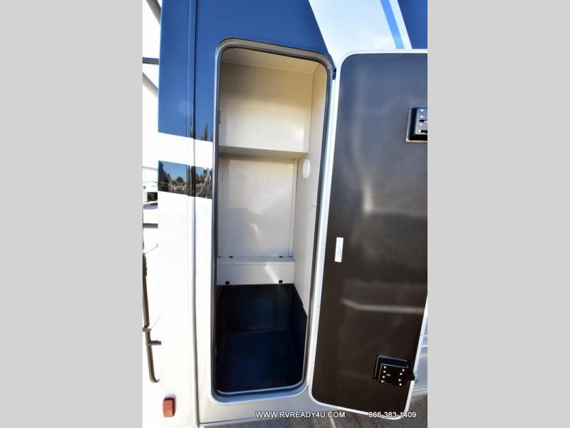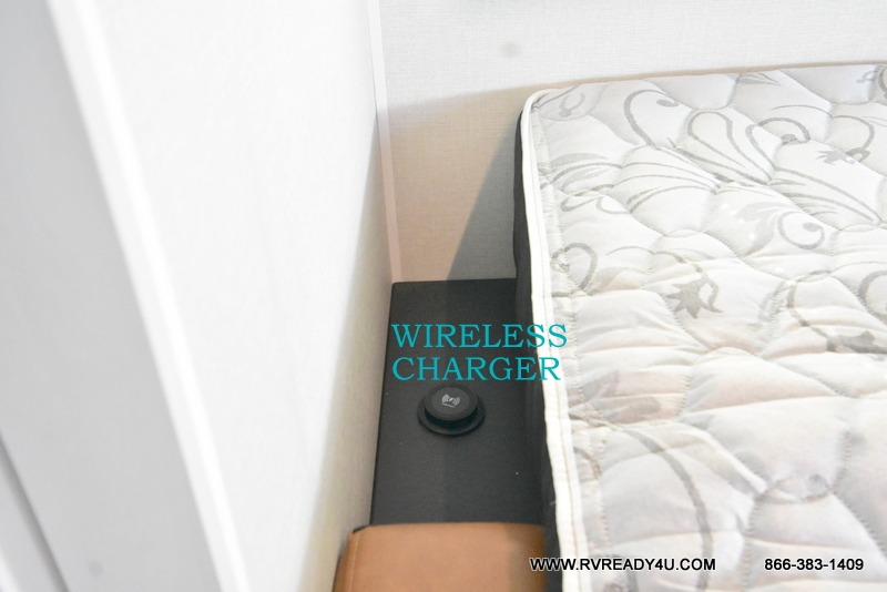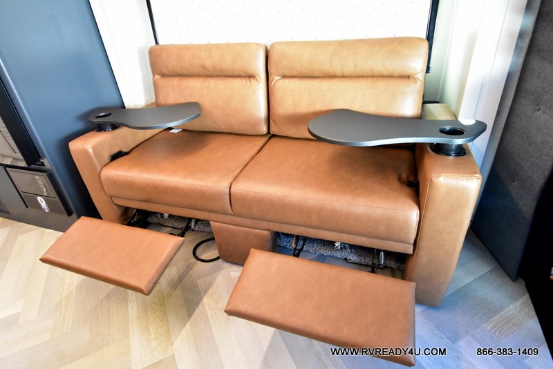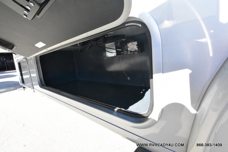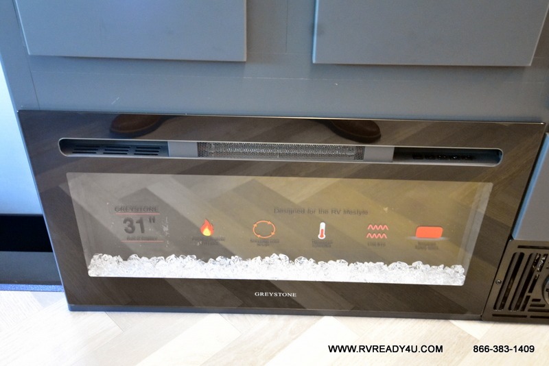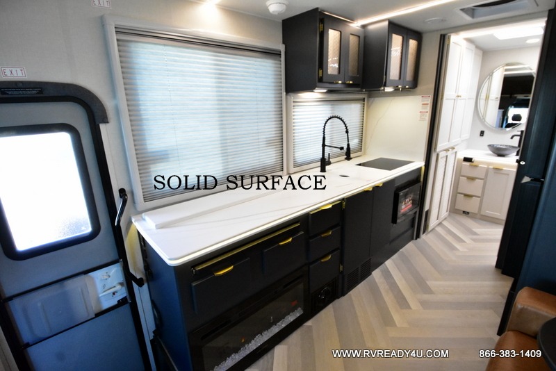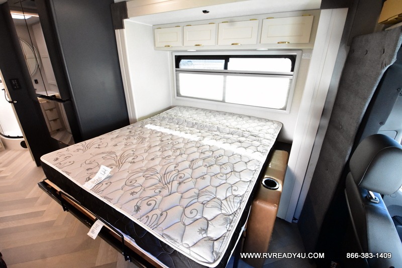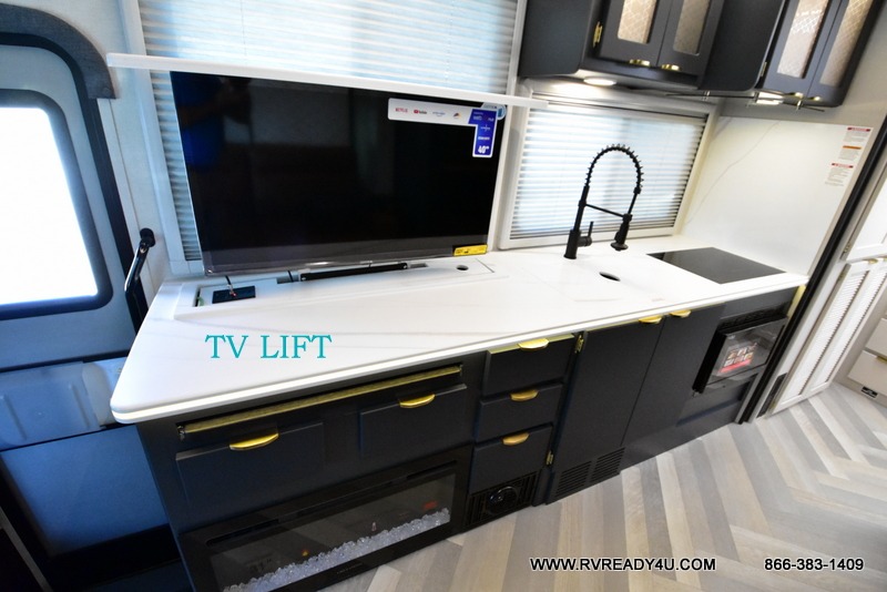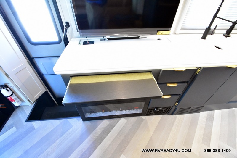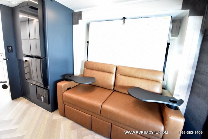 You will enjoy the versatility that this Murphy bed model provides. Depending on whether it is daytime or evening will determine if you have a 60" x 74" Murphy bed that slides out or a 62" sofa to enjoy. There is a 45" x 76" bunk over cab that can be used for added sleeping for two more guests, or to be used as added storage space. The rear full bath is spacious and private and includes a 35" x 35" angled shower, toilet, vanity with sink, plus linen cabinet, and wardrobe. The kitchen features everything needed to create meals while on the go, and a cozy fireplace is included beneath the coach TV for your enjoyment.