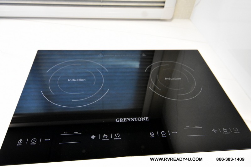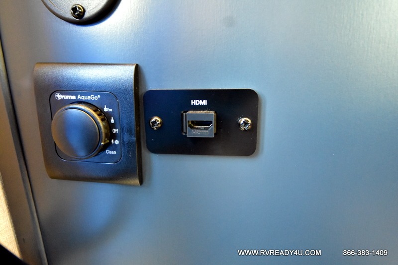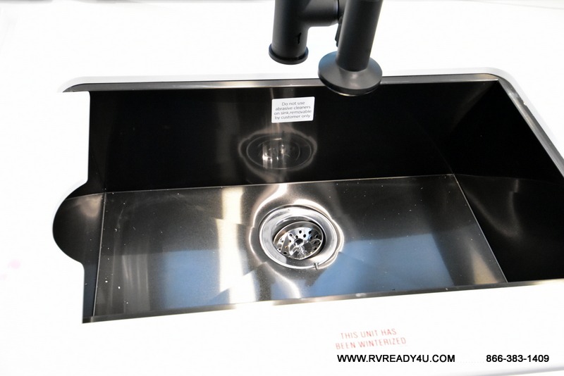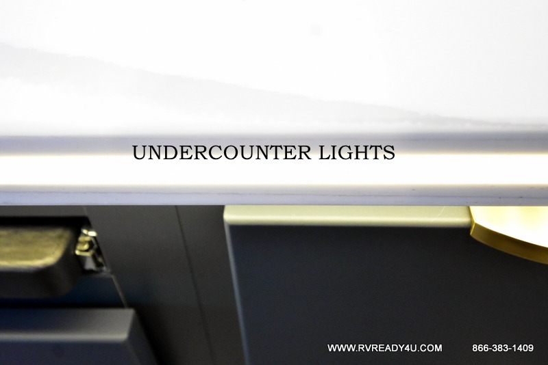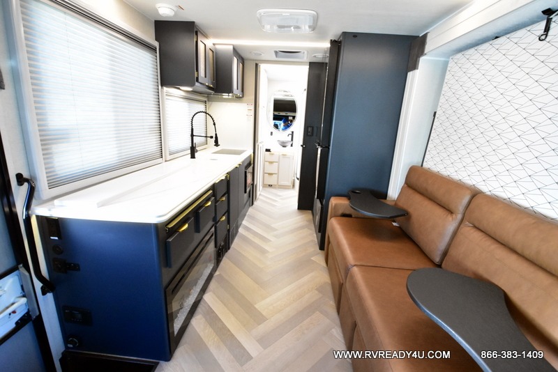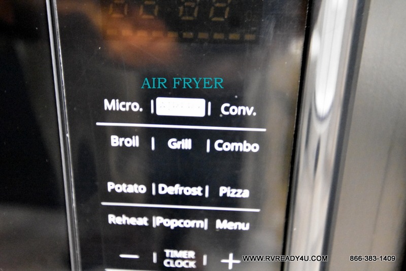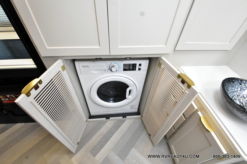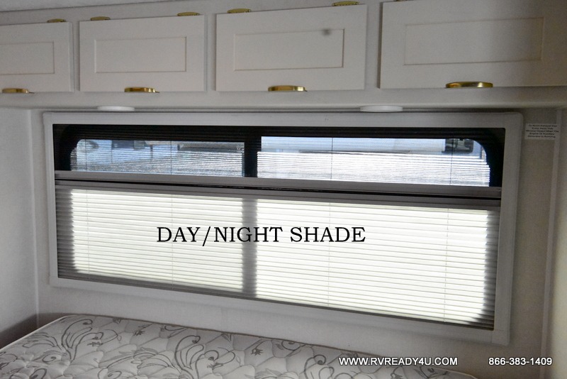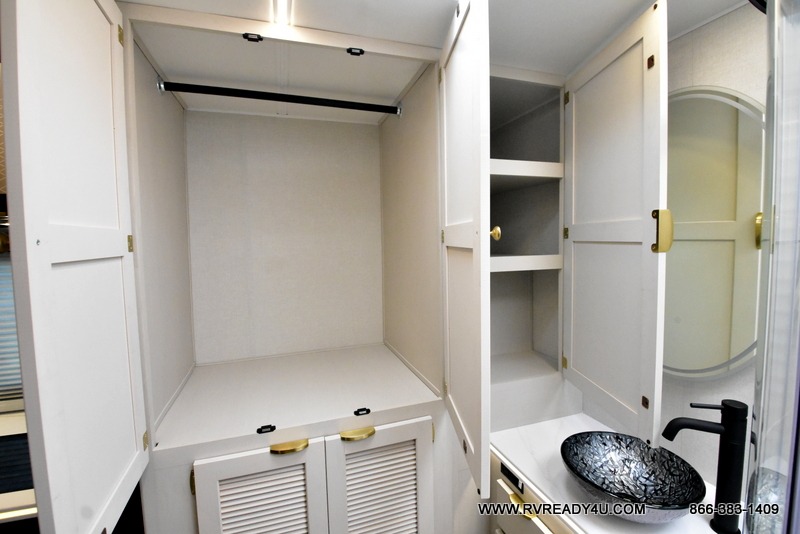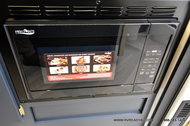 You will enjoy the versatility that this Murphy bed model provides. Depending on whether it is daytime or evening will determine if you have a 60" x 74" Murphy bed that slides out or a 62" sofa to enjoy. There is a 45" x 76" bunk over cab that can be used for added sleeping for two more guests, or to be used as added storage space. The rear full bath is spacious and private and includes a 35" x 35" angled shower, toilet, vanity with sink, plus linen cabinet, and wardrobe. The kitchen features everything needed to create meals while on the go, and a cozy fireplace is included beneath the coach TV for your enjoyment.