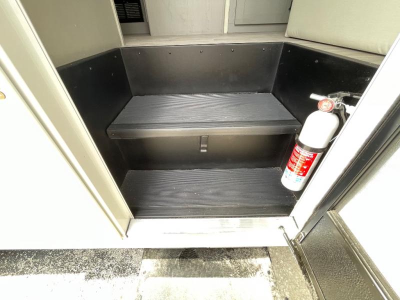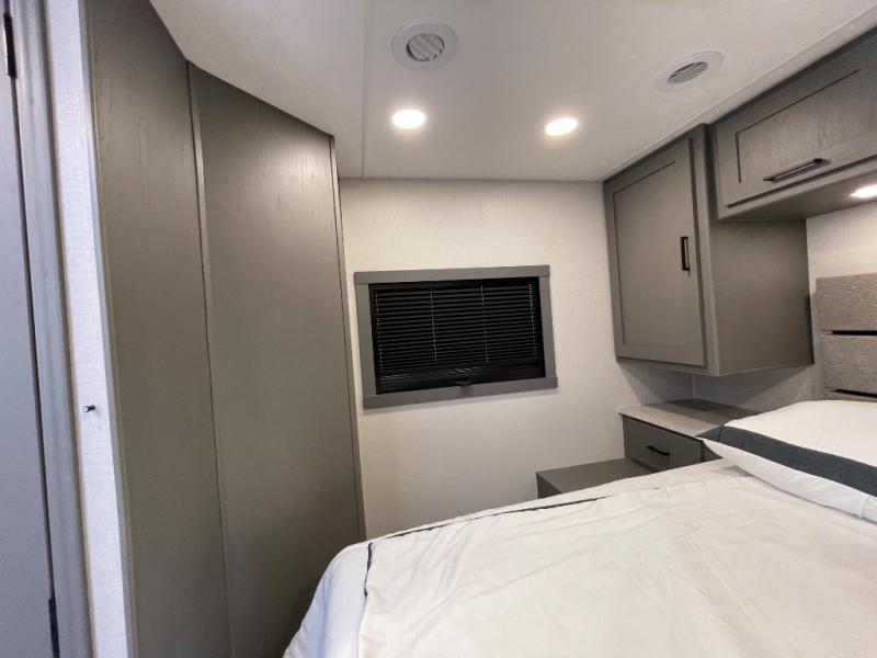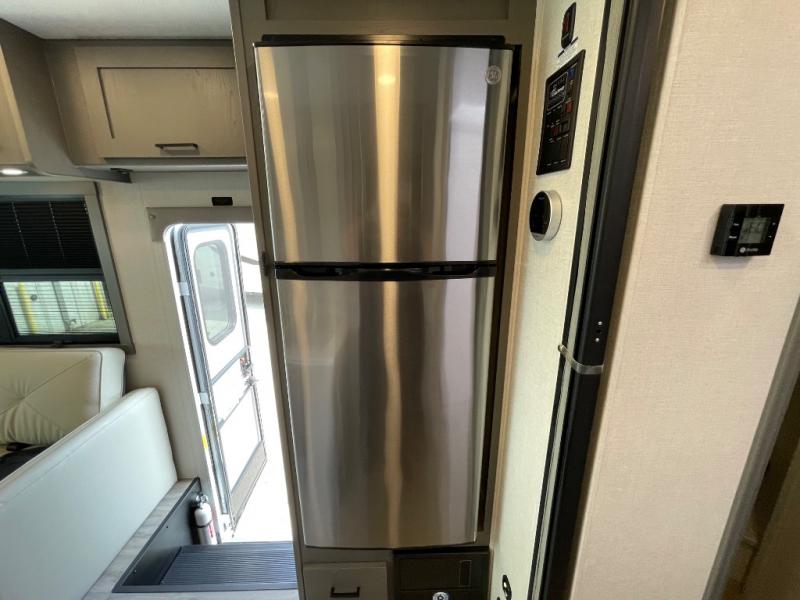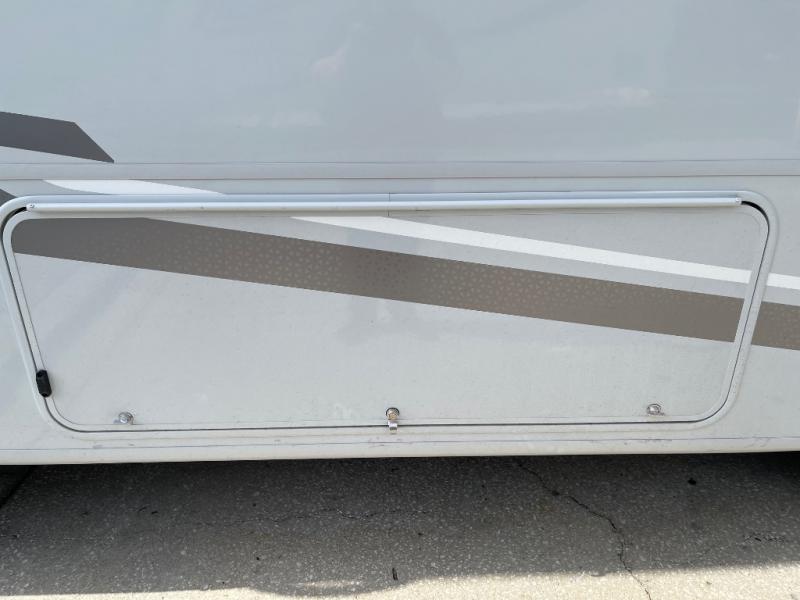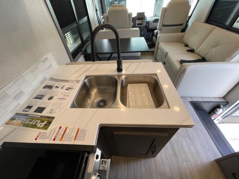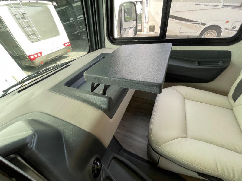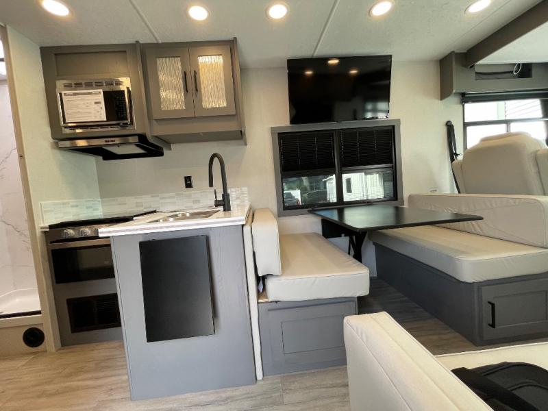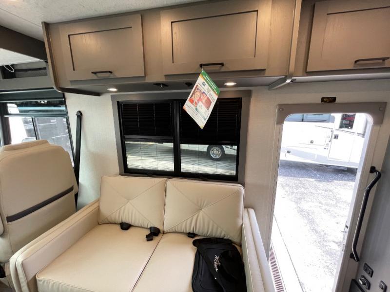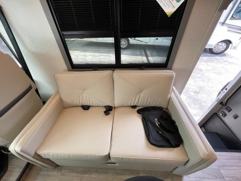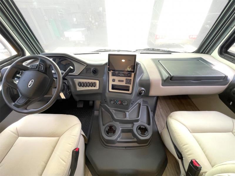 Live your best life on the road with this motorhome! The rear private bedroom has a 60" x 74" queen bed to lay your head on at night with wardrobes on either side of it for your clothes. A separated bathroom makes it easy for one person to freshen up in the 24" x 32" shower while another uses the private toilet and sink. Enjoy home cooked meals while out on the road with the stainless steel three burner cooktop, the 12V stainless steel double door 10 cu. ft. refrigerator, and even the stainless steel microwave oven. Eat your meals, play card games, and even transform the 42" x 70" booth dinette into an extra sleeping space. The 63" sofa has storage below for an extra blanket or board games. If you need to get some work done while you're away then you will appreciate the computer work station with 12V, 110V, and USB outlets in front of the passenger chair!