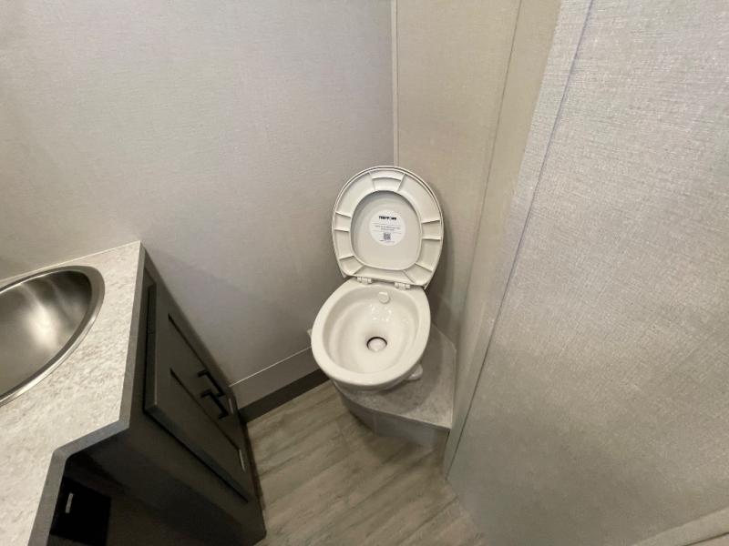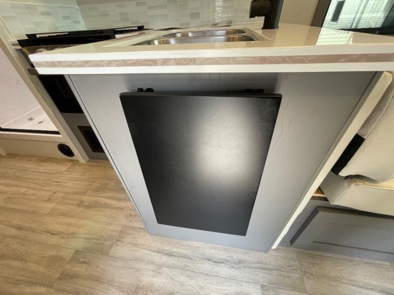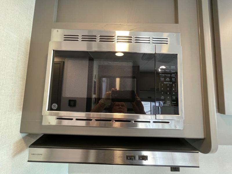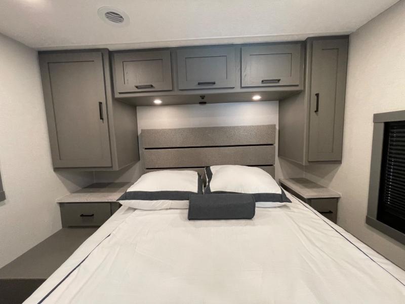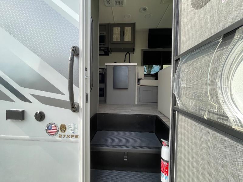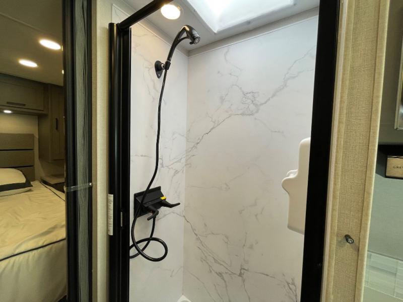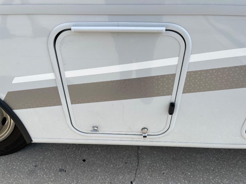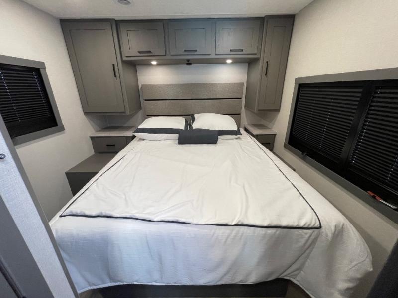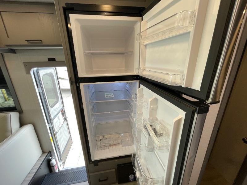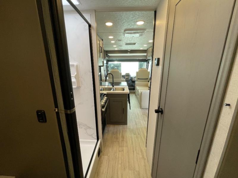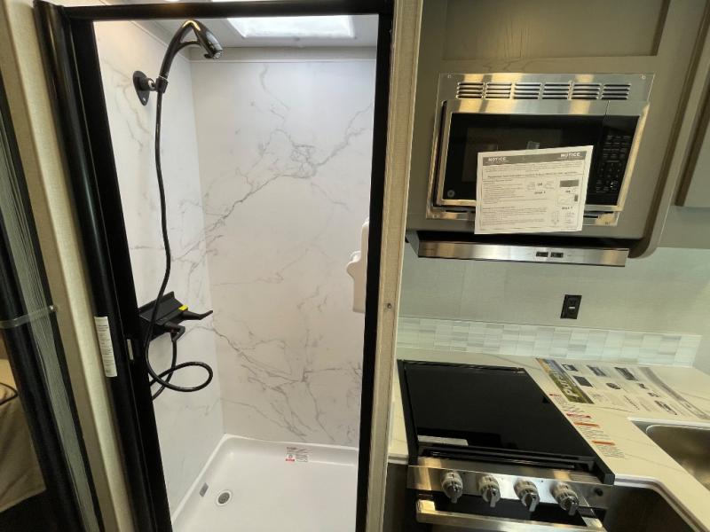 Live your best life on the road with this motorhome! The rear private bedroom has a 60" x 74" queen bed to lay your head on at night with wardrobes on either side of it for your clothes. A separated bathroom makes it easy for one person to freshen up in the 24" x 32" shower while another uses the private toilet and sink. Enjoy home cooked meals while out on the road with the stainless steel three burner cooktop, the 12V stainless steel double door 10 cu. ft. refrigerator, and even the stainless steel microwave oven. Eat your meals, play card games, and even transform the 42" x 70" booth dinette into an extra sleeping space. The 63" sofa has storage below for an extra blanket or board games. If you need to get some work done while you're away then you will appreciate the computer work station with 12V, 110V, and USB outlets in front of the passenger chair!