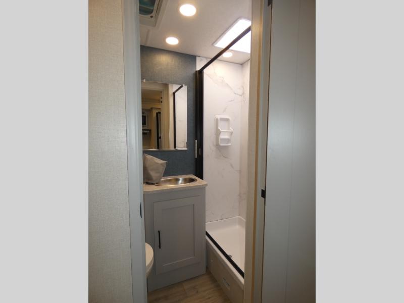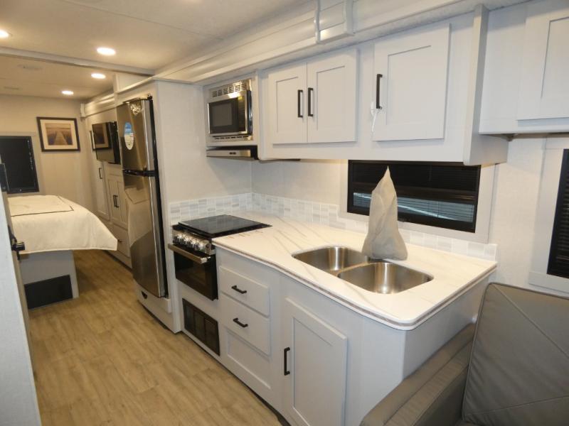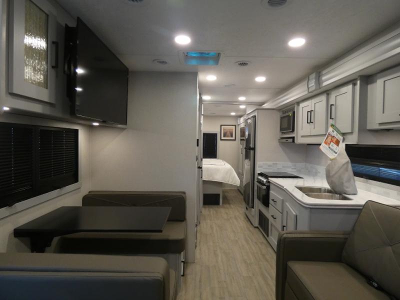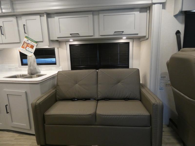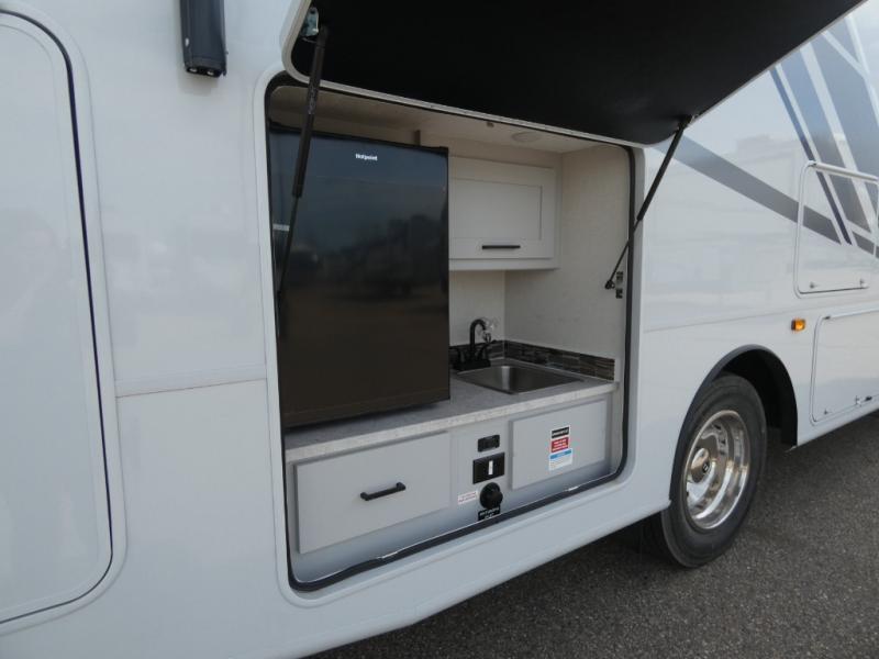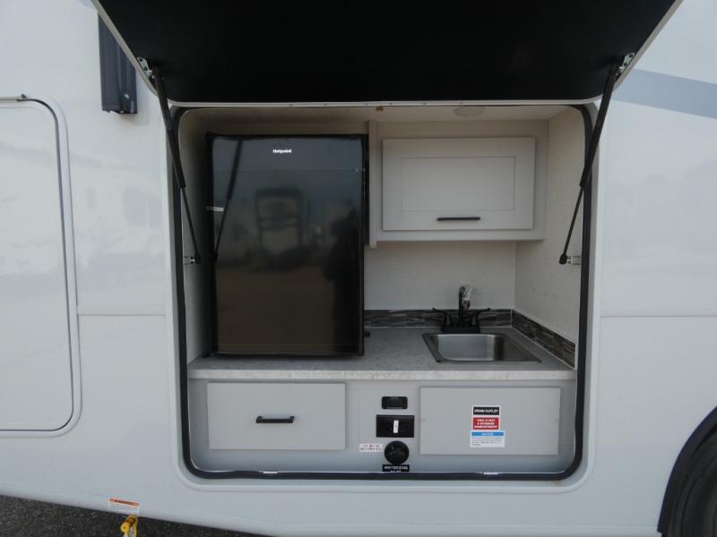 You will be impressed with all that this motorhome has to offer! Starting with the exterior kitchen with a double sink for easy clean-up and the exterior LED TV to stay up to date with the big game as you cook. The rear private bedroom will have you feeling right at home with the 60" x 74" queen bed that has a CPAP station above it and across from wardrobes on either side of the LED TV and storage space. There is a broom closet for your convenience just outside the full bathroom which has a 38" x 24" shower with a skylight for more head room and natural lighting. The fully equipped kitchen has everything you need to prepare your best meals including a stainless steel microwave oven, and you can enjoy them at the 30" x 70" booth dinette. Relax in true comfort on the 63" sofa with storage below for extra games or blanket!