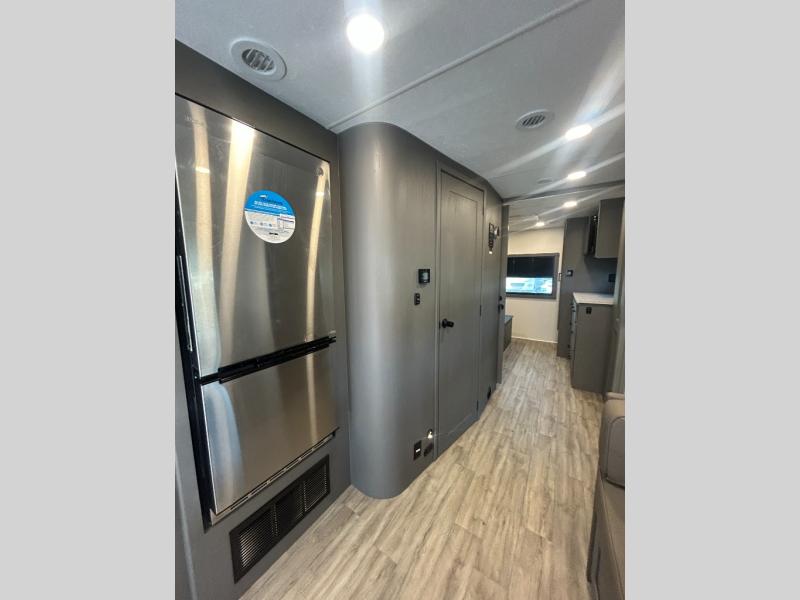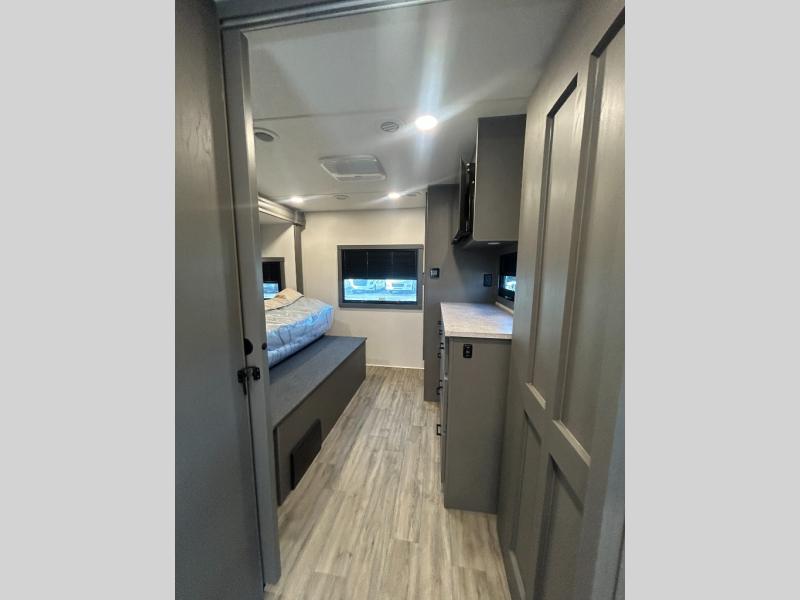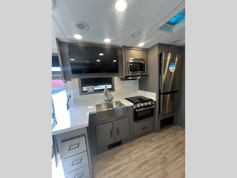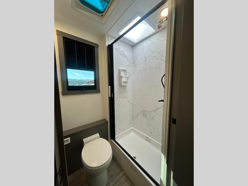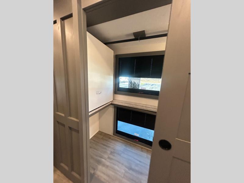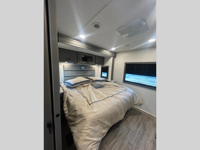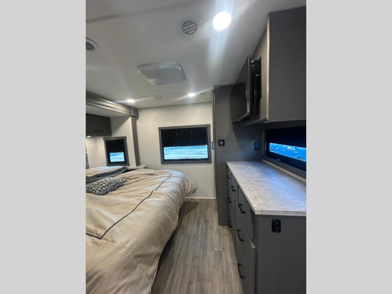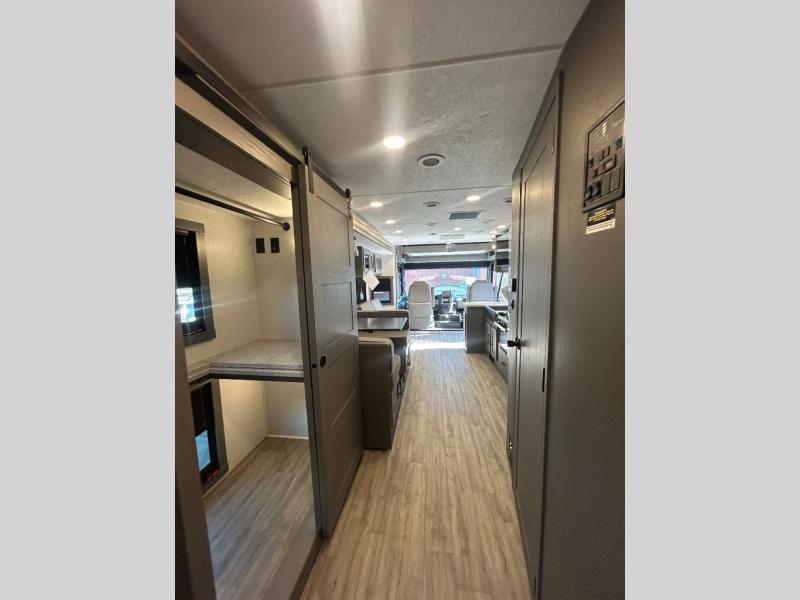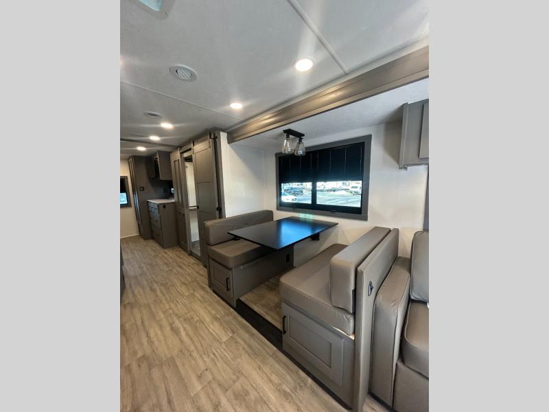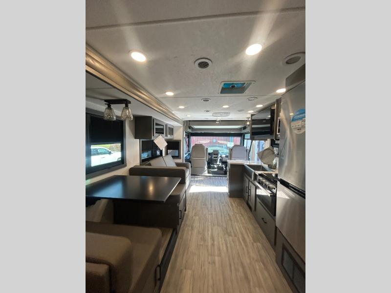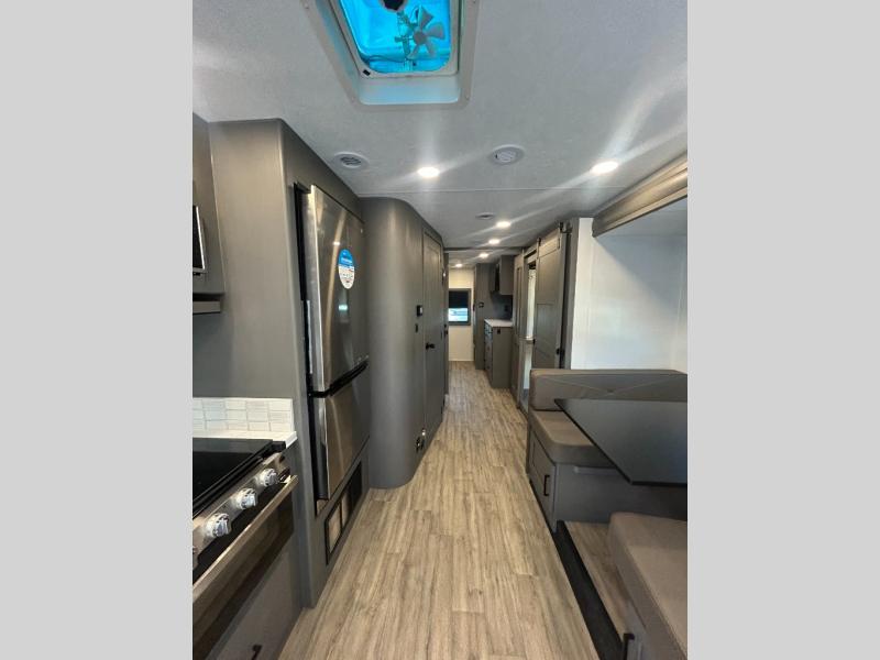 The whole gang will love this motorhome thanks to its drop-down overhead bunk, rear private bedroom, and 71" bunk/office/wardrobe space for versatility! Once breakfast has been prepared on the stainless steel three burner range, everyone can dine at the booth dinette or sit on the 63" sofa within the large slide out. There is a 40" LED TV across from the sofa for convenience, and you'll find two additional TVs; one in the bedroom and one outside! This model includes a full bath with a shower skylight, a retractable shower door, and a power bath vent to keep everything fresh. After you've gotten ready for the day, head outdoors to relax under the 17' power awning and watch the big game on the exterior TV!