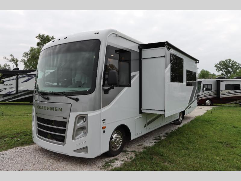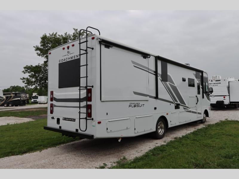 Pursue big dreams with one of these Coachmen RV Pursuit Class A gas motorhomes! The high gloss dove grey sidewalls with Azdel superlight composite, fiberglass front cap, and crowned, laminated TPO roof will hold up for years to come. A Ford F53 7.3L V8 engine propels your unit with an abundance of power to each destination. Stay warm in the cooler months with a 30,000 BTU furnace and stay cool in the warmer months with a single 15,000 BTU A/C or dual15,000 BTU A/C units, depending on the model you choose. All of your extra gear can easily be stored in the spacious exterior storage compartments to keep from taking up space on the inside. The exterior propane hook-up will come in handy and some models even have an outside entertainment center with a TV. Come find the right one for you today!