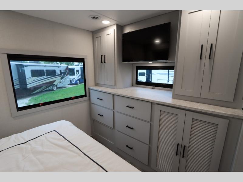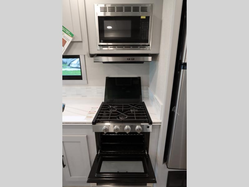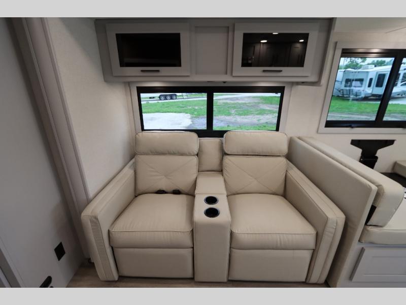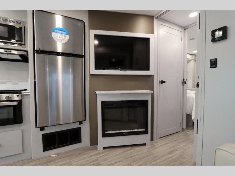 Enjoy a home away from home with this motorhome! The drop-down bunk over cab provides an extra sleeping space but can be stored away when not needed. Prepare your best home cooked meals while on the road with the stainless steel three burner cooktop and 12V stainless steel double door 10 cu. ft. refrigerator then enjoy them at the 42" x 72" booth dinette. Relax in true comfort on the 68" theater sofa across from the Smart TV and fireplace. After a long day of traveling, you can freshen up in the 26" x 38" shower while another uses the private toilet and sink. The rear private bedroom has a 72" x 76" king bed slide with a CPAP station above it and across from it there is a wardrobe, an LED TV, storage space, and washer and dryer prep!