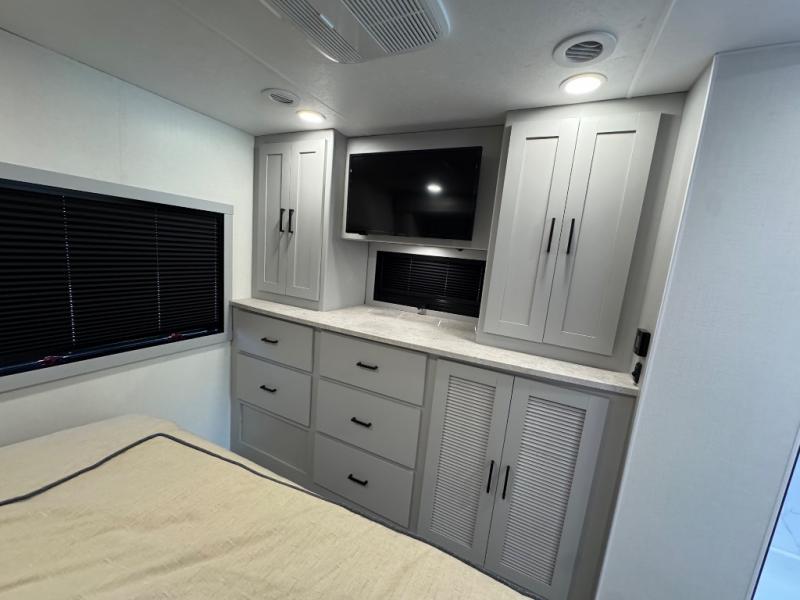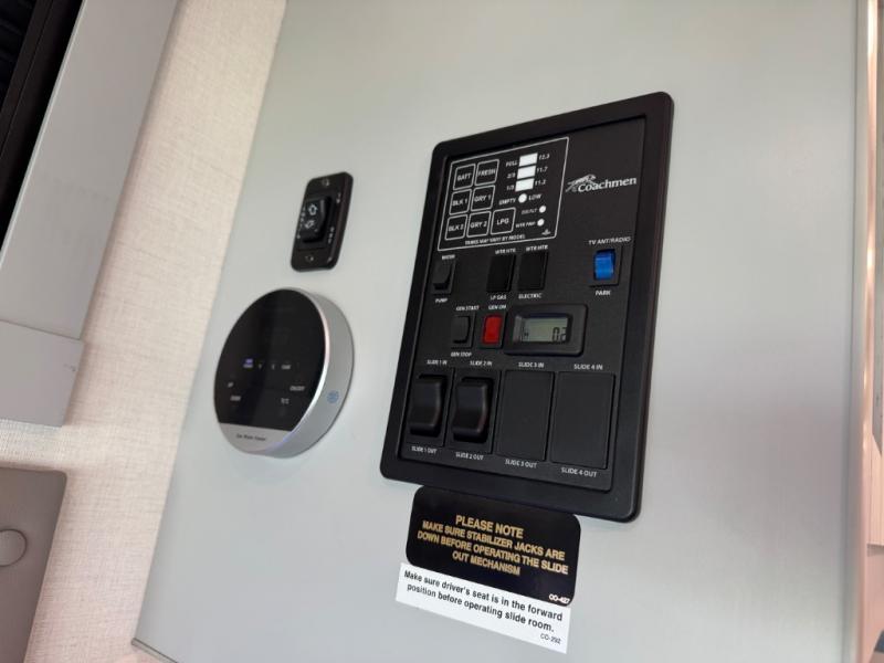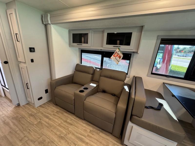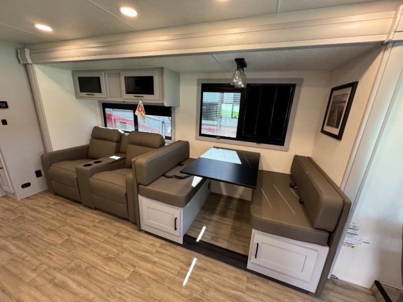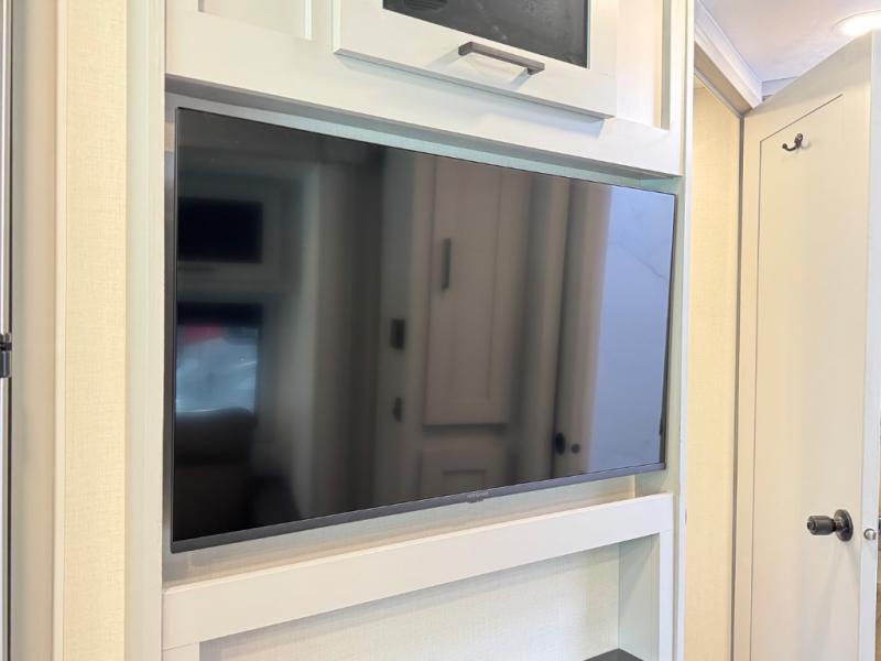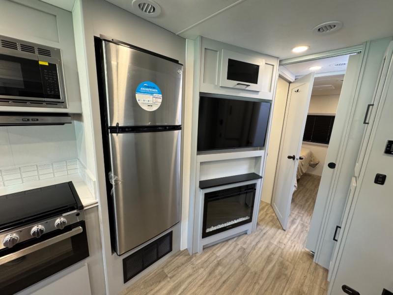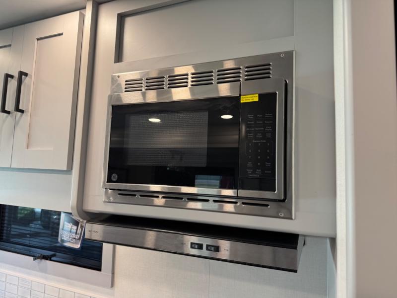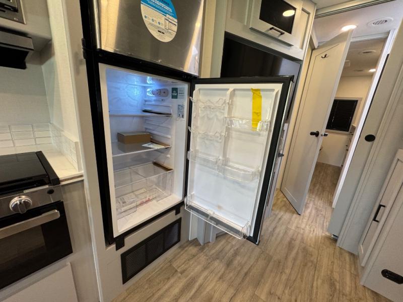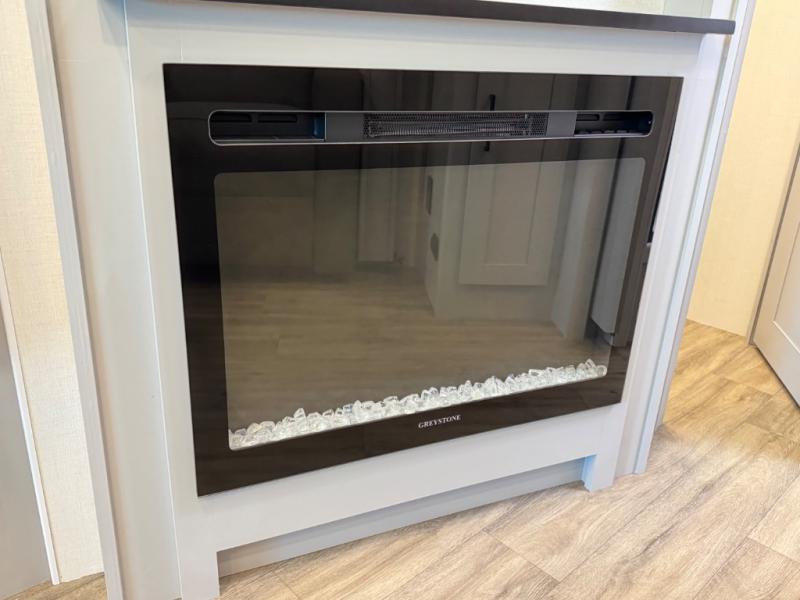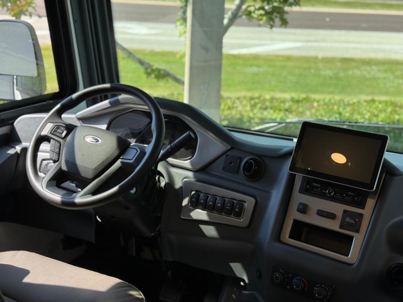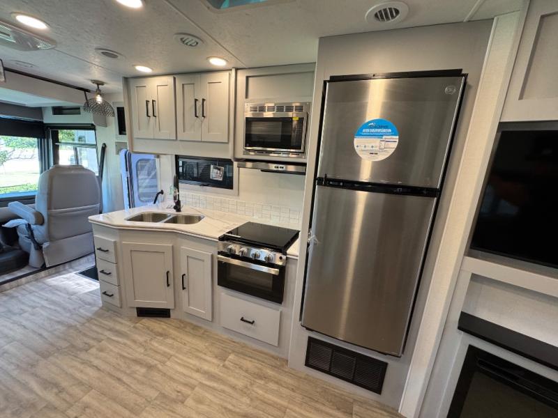Enjoy a home away from home with this motorhome! The drop-down bunk over cab provides an extra sleeping space but can be stored away when not needed. Prepare your best home cooked meals while on the road with the stainless steel three burner cooktop and 12V stainless steel double door 10 cu. ft. refrigerator then enjoy them at the 42" x 72" booth dinette. Relax in true comfort on the 68" theater sofa across from the Smart TV and fireplace. After a long day of traveling, you can freshen up in the 26" x 38" shower while another uses the private toilet and sink. The rear private bedroom has a 72" x 76" king bed slide with a CPAP station above it and across from it there is a wardrobe, an LED TV, storage space, and washer and dryer prep!